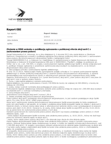 "Zarząd INDEXMEDICA S.A. w Krakowie (ul. Czapińskiego 2) zarejestrowanej w Sądzie Rejonowym dla KrakowaŚródmieścia w Krakowie XI Wydział Gospodarczy KRS pod nr 0000349031 ("Spółka"), działając na podstawie art.