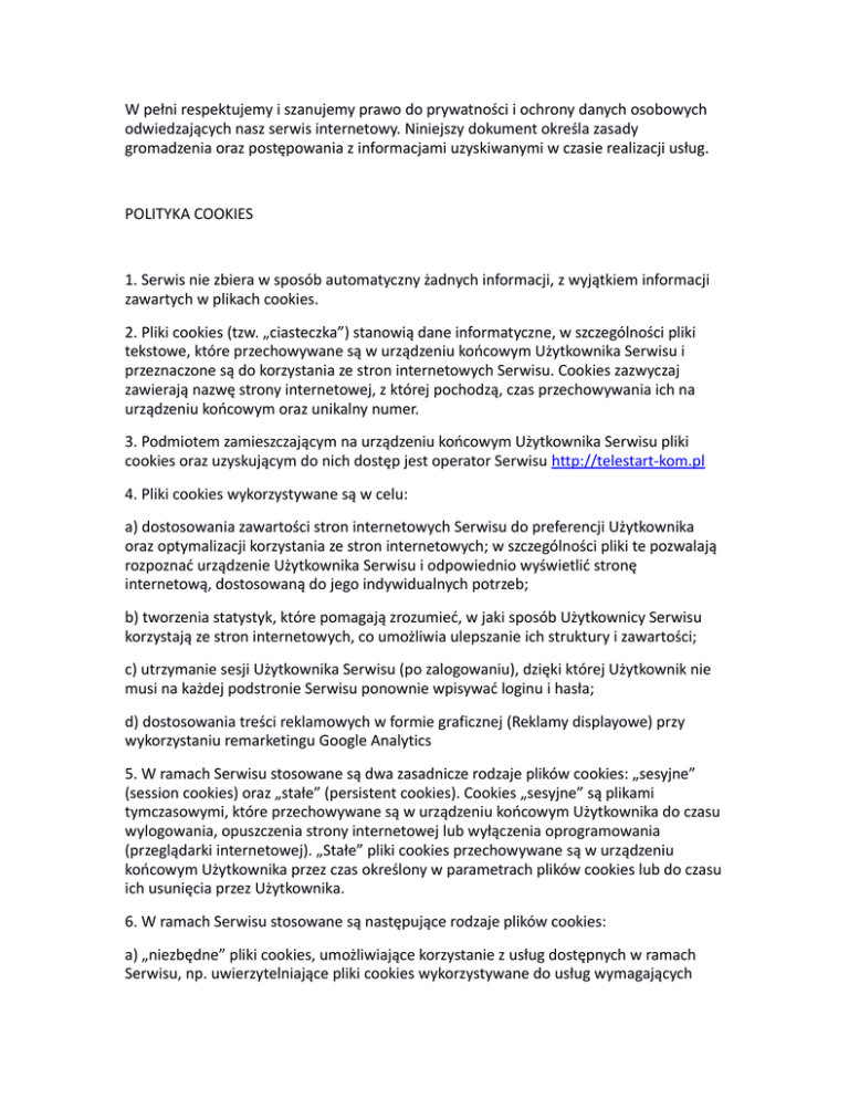 W pełni respektujemy i szanujemy prawo do prywatności i ochrony danych osobowych odwiedzających nasz serwis internetowy. Niniejszy dokument określa zasady gromadzenia oraz postępowania z informacjami uzyskiwanymi w czasie realizacji usług. POLITYKA COOKIES 1. Serwis nie zbiera w sposób automatyczny żadnych informacji, z wyjątkiem informacji zawartych w plikach cookies. 2. Pliki cookies (tzw. „ciasteczka”) stanowią dane informatyczne, w szczególności pliki tekstowe, które przechowywane są w urządzeniu końcowym Użytkownika Serwisu i przeznaczone są do korzystania ze stron internetowych Serwisu. Cookies zazwyczaj zawierają nazwę strony internetowej, z której pochodzą, czas przechowywania ich na urządzeniu końcowym oraz unikalny numer. 3. Podmiotem zamieszczającym na urządzeniu końcowym Użytkownika Serwisu pliki cookies oraz uzyskującym do nich dostęp jest operator Serwisu http://telestart-kom.pl 4. Pliki cookies wykorzystywane są w celu: a) dostosowania zawartości stron internetowych Serwisu do preferencji Użytkownika oraz optymalizacji korzystania ze stron internetowych; w szczególności pliki te pozwalają rozpoznać urządzenie Użytkownika Serwisu i odpowiednio wyświetlić stronę internetową, dostosowaną do jego indywidualnych potrzeb; b) tworzenia statystyk, które pomagają zrozumieć, w jaki sposób Użytkownicy Serwisu korzystają ze stron internetowych, co umożliwia ulepszanie ich struktury i zawartości; c) utrzymanie sesji Użytkownika Serwisu (po zalogowaniu), dzięki której Użytkownik nie musi na każdej podstronie Serwisu ponownie wpisywać loginu i hasła; d) dostosowania treści reklamowych w formie graficznej (Reklamy displayowe) przy wykorzystaniu remarketingu Google Analytics 5. W ramach Serwisu stosowane są dwa zasadnicze rodzaje plików cookies: „sesyjne” (session cookies) oraz „stałe” (persistent cookies). Cookies „sesyjne” są plikami tymczasowymi, które przechowywane są w urządzeniu końcowym Użytkownika do czasu wylogowania, opuszczenia strony internetowej lub wyłączenia oprogramowania (przeglądarki internetowej). „Stałe” pliki cookies przechowywane są w urządzeniu końcowym Użytkownika przez czas określony w parametrach plików cookies lub do czasu ich usunięcia przez Użytkownika. 6. W ramach Serwisu stosowane są następujące rodzaje plików cookies: a) „niezbędne” pliki cookies, umożliwiające korzystanie z usług dostępnych w ramach Serwisu, np. uwierzytelniające pliki cookies wykorzystywane do usług wymagających uwierzytelniania w ramach Serwisu; b) pliki cookies służące do zapewnienia bezpieczeństwa, np. wykorzystywane do wykrywania nadużyć w zakresie uwierzytelniania w ramach Serwisu; c) „wydajnościowe” pliki cookies, umożliwiające zbieranie informacji o sposobie korzystania ze stron internetowych Serwisu; d) „funkcjonalne” pliki cookies, umożliwiające „zapamiętanie” wybranych przez Użytkownika ustawień i personalizację interfejsu Użytkownika, np. w zakresie wybranego języka lub regionu, z którego pochodzi Użytkownik, rozmiaru czcionki, wyglądu strony internetowej itp.; e) „reklamowe” pliki cookies, umożliwiające dostarczanie Użytkownikom treści reklamowych bardziej dostosowanych do ich zainteresowań. 7. W wielu przypadkach oprogramowanie służące do przeglądania stron internetowych (przeglądarka internetowa) domyślnie dopuszcza przechowywanie plików cookies w urządzeniu końcowym Użytkownika. Użytkownicy Serwisu mogą dokonać w każdym czasie zmiany ustawień dotyczących plików cookies. Ustawienia te mogą zostać zmienione w szczególności w taki sposób, aby blokować automatyczną obsługę plików cookies w ustawieniach przeglądarki internetowej bądź informować o ich każdorazowym zamieszczeniu w urządzeniu Użytkownika Serwisu. Szczegółowe informacje o możliwości i sposobach obsługi plików cookies dostępne są w ustawieniach oprogramowania (przeglądarki internetowej). Użytkownicy mogą zablokować usługę Analytics dla reklam displayowych oraz dostosowywać reklamy w sieci reklamowej Google w Menedżerze preferencji reklam. Można również pobrać program blokujący Google Analytics ze strony https://tools.google.com/dlpage/gaoptout/ 8. Operator Serwisu informuje, że ograniczenia stosowania plików cookies mogą wpłynąć na niektóre funkcjonalności dostępne na stronach internetowych Serwisu. 9. Pliki cookies zamieszczane w urządzeniu końcowym Użytkownika Serwisu i wykorzystywane mogą być również przez współpracujących z operatorem Serwisu reklamodawców oraz partnerów. 10. Więcej informacji na temat plików cookies dostępnych jest pod adresem http://wszystkoociasteczkach.pl lub w sekcji „Pomoc” w menu przeglądarki internetowej.