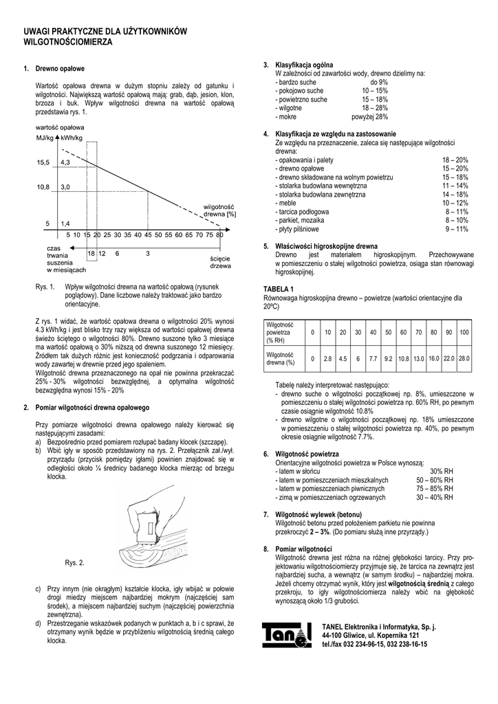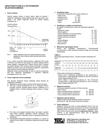 UWAGI PRAKTYCZNE DLA UŻYTKOWNIKÓW WILGOTNOŚCIOMIERZA 1. Drewno opałowe Wartość opałowa drewna w dużym stopniu zależy od gatunku i wilgotności. Największą wartość opałową mają: grab, dąb, jesion, klon, brzoza i buk. Wpływ wilgotności drewna na wartość opałową przedstawia rys. 1. 3. Klasyfikacja ogólna W zależności od zawartości wody, drewno dzielimy na: - bardzo suche do 9% - pokojowo suche 10 – 15% - powietrzno suche 15 – 18% - wilgotne 18 – 28% - mokre powyżej 28% 4. Klasyfikacja ze względu na zastosowanie Ze względu na przeznaczenie, zaleca się następujące wilgotności drewna: - opakowania i palety 18 – 20% - drewno opałowe 15 – 20% - drewno składowane na wolnym powietrzu 15 – 18% - stolarka budowlana wewnętrzna 11 – 14% - stolarka budowlana zewnętrzna 14 – 18% - meble 10 – 12% - tarcica podłogowa 8 – 11% - parkiet, mozaika 8 – 10% - płyty pilśniowe 9 – 11% 5. Właściwości higroskopijne drewna Drewno jest materiałem higroskopijnym. Przechowywane w pomieszczeniu o stałej wilgotności powietrza, osiąga stan równowagi higroskopijnej. Rys. 1. Wpływ wilgotności drewna na wartość opałową (rysunek poglądowy). Dane liczbowe należy traktować jako bardzo orientacyjne. Z rys. 1 widać, że wartość opałowa drewna o wilgotności 20% wynosi 4.3 kWh/kg i jest blisko trzy razy większa od wartości opałowej drewna świeżo ściętego o wilgotności 80%. Drewno suszone tylko 3 miesiące ma wartość opałową o 30% niższą od drewna suszonego 12 miesięcy. Źródłem tak dużych różnic jest konieczność podgrzania i odparowania wody zawartej w drewnie przed jego spaleniem. Wilgotność drewna przeznaczonego na opał nie powinna przekraczać 25% - 30% wilgotności bezwzględnej, a optymalna wilgotność bezwzględna wynosi 15% - 20% 2. Pomiar wilgotności drewna opałowego Przy pomiarze wilgotności drewna opałowego należy kierować się następującymi zasadami: a) Bezpośrednio przed pomiarem rozłupać badany klocek (szczapę). b) Wbić igły w sposób przedstawiony na rys. 2. Przełącznik zał./wył. przyrządu (przycisk pomiędzy igłami) powinien znajdować się w odległości około ¼ średnicy badanego klocka mierząc od brzegu klocka. TABELA 1 Równowaga higroskopijna drewno – powietrze (wartości orientacyjne dla 20ºC) Wilgotność powietrza (% RH) 0 10 20 30 40 50 Wilgotność drewna (%) 0 2.8 4.5 6 7.7 9.2 10.8 13.0 16.0 22.0 28.0 60 70 80 90 100 Tabelę należy interpretować następująco: - drewno suche o wilgotności początkowej np. 8%, umieszczone w pomieszczeniu o stałej wilgotności powietrza np. 60% RH, po pewnym czasie osiągnie wilgotność 10.8% - drewno wilgotne o wilgotności początkowej np. 18% umieszczone w pomieszczeniu o stałej wilgotności powietrza np. 40%, po pewnym okresie osiągnie wilgotność 7.7%. 6. Wilgotność powietrza Orientacyjne wilgotności powietrza w Polsce wynoszą: - latem w słońcu 30% RH - latem w pomieszczeniach mieszkalnych 50 – 60% RH - latem w pomieszczeniach piwnicznych 75 – 85% RH - zimą w pomieszczeniach ogrzewanych 30 – 40% RH 7. Wilgotność wylewek (betonu) Wilgotność betonu przed położeniem parkietu nie powinna przekroczyć 2 – 3%. (Do pomiaru służą inne przyrządy.) Rys. 2. c) Przy innym (nie okrągłym) kształcie klocka, igły wbijać w połowie drogi miedzy miejscem najbardziej mokrym (najczęściej sam środek), a miejscem najbardziej suchym (najczęściej powierzchnia zewnętrzna). d) Przestrzeganie wskazówek podanych w punktach a, b i c sprawi, że otrzymany wynik będzie w przybliżeniu wilgotnością średnią całego klocka. 8. Pomiar wilgotności Wilgotność drewna jest różna na różnej głębokości tarcicy. Przy projektowaniu wilgotnościomierzy przyjmuje się, że tarcica na zewnątrz jest najbardziej sucha, a wewnątrz (w samym środku) – najbardziej mokra. Jeżeli chcemy otrzymać wynik, który jest wilgotnością średnią z całego przekroju, to igły wilgotnościomierza należy wbić na głębokość wynoszącą około 1/3 grubości. TANEL Elektronika i Informatyka, Sp. j. 44-100 Gliwice, ul. Kopernika 121 tel./fax 032 234-96-15, 032 238-16-15