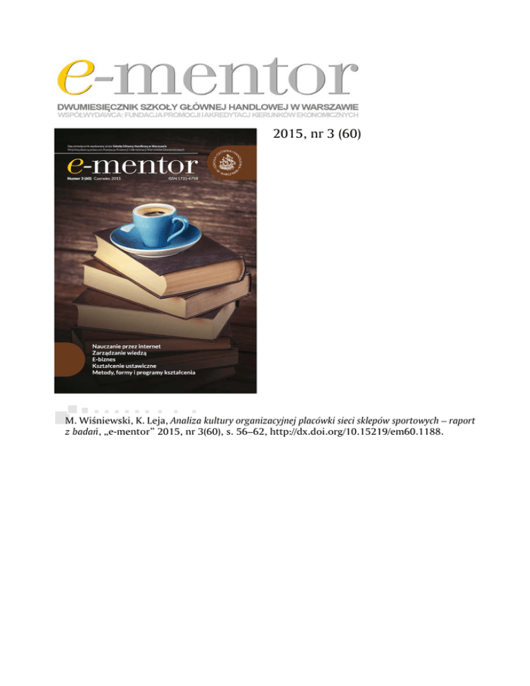 2015, nr 3 (60) M. Wiśniewski, K. Leja, Analiza kultury organizacyjnej placówki sieci sklepów sportowych – raport z badań, „e-mentor” 2015, nr 3(60), s. 56–62, http://dx.doi.org/10.15219/em60.1188. zarządzanie wiedzą Analiza kultury organizacyjnej placówki sieci sklepów sportowych – raport z badań Mirosław Wiśniewski, Krzysztof Leja Zasoby niematerialne firmy, niezależnie od typu własności oraz sektora gospodarki, w coraz większym stopniu decydują o jej sukcesie. Jednym z takich zasobów jest kultura organizacyjna. W artykule podjęto próbę diagnozy kultury organizacyjnej wybranej placówki sieci handlowej branży artykułów sportowych, posługując się metodą wartości konkurujących zaproponowaną przez Kima Camerona i Roberta Quinna, która pozwala na „pomiar” istniejącej i oczekiwanej kultury organizacyjnej. Celem opracowania jest poszukiwanie odpowiedzi na pytania, jakie działania można podjąć, aby kultura organizacyjna wybranej firmy stała się bardziej przyjazna dla pracownika oraz czy taka zmiana może przyczynić się do sukcesu firmy1. Kultura i kultura organizacyjna Pojęcie „kultura” wydaje się z pozoru dobrze znane, jednak próba jego zdefiniowania okazuje się zadaniem złożonym. Za katalizator rozwoju koncepcji kultury uważana jest filozofia Jana Jakuba Rousseau2. Johann G. Herder uważał, że nie ma nic bardziej nieokreślonego niż słowo kultura3. Istnieje wiele definicji kultury, jedną z nich zaproponował Edward B. Taylor w Primitiveculture z 1871 r.: Kultura lub cywilizacja jest to złożona całość obejmująca wiedzę, wierzenia, sztukę, prawo, moralność i wszystkie inne zdolności i nawyki zdobyte przez człowieka, jako członka społeczeństwa4. Czesław Sikorski rozumie kulturę jako element powstający wszędzie tam, gdzie relacje między ludźmi zachodzą przez dłuższy czas5. Monika Kostera uważa, że kultura jest żywym tworem otrzymanym po poprzednikach, podlega ciągłym zmianom, ponieważ współtworzymy ją przez całe życie6. Geert Hofstede z kolei definiuje kulturę jako zbiorowe programowanie umysłu zachodzące w rodzinie, najbliższym otoczeniu, szkole, w grupach rówieśniczych oraz miejscu pracy i zamieszkania7. Jako pierwszy określenia kultura do organizacji użył w 1951 r. Elliot Jaques w pracy The Changing Culture of a Factory 8. W literaturze można znaleźć wiele definicji kultury organizacyjnej. Jedną z najczęściej przytaczanych jest definicja autorstwa Edgara Scheina, który określił kulturę organizacyjną jako zbiór podstawowych przekonań wyuczonych przez członków organizacji w toku rozwiązywania problemów jej zewnętrznej adaptacji i wewnętrznej integracji, uważanych za słuszne i wpajanych jako właściwy sposób postrzegania, myślenia i odczuwania w odniesieniu do tych problemów9. Łukasz Sułkowski zwraca uwagę, że kultura organizacyjna wpisuje się w paradygmaty nauk społecznych Gibsona Burella i Garetha Morgana10, a w zależności od paradygmatu zróżnicowane jest znaczenie kultury w zarządzaniu, metody jej badań, metody zmiany kulturowej, dominujące modele i typologie oraz najważniejsze metafory11. W artykule wykorzystano fragmenty pracy magisterskiej M. Wiśniewskiego. Ł. Sułkowski, Kulturowe procesy zarządzania, Difin, Warszawa 2012, s. 16. 3 J. Śniadecki, Etyka jako przejaw kultury, [w:] B. Nogalski (red.), Kultura organizacyjna. Duch organizacji, TNOiK, Bydgoszcz 1998, s 17. 4 Cz. Sikorski, Sztuka kierowania – szkice o kulturze organizacyjnej, Instytut Wydawniczy Związków Zawodowych, Warszawa 1996, s. 15 5 Cz. Sikorski, Kształtowanie kultury organizacyjnej. Filozofia, strategie, metody, Wydawnictwo Uniwersytetu Łódzkiego, Łódź 2009. 6 M. Kostera, Zarządzanie personelem, PWE, Warszawa 2000, s. 13. 7 G. Hofstede, Kultury i organizacje, PWE, Warszawa 2000, s. 38–40. 8 M. Kostera, dz.cyt. 9 Cyt za: Cz. Sikorski, Kształtowanie…, dz.cyt., s. 13. 10 Por. M. Kostera, Antropologia organizacji. Metodologia badań terenowych, PWN, Warszawa 2005. 11 Ł. Sułkowski, dz.cyt. s. 40–41. 1 2 56 e-mentor nr 3 (60) Analiza kultury organizacyjnej placówki sieci sklepów... Uwagi o metodzie badania kultury organizacyjnej Dostrzegalnemu wzrostowi znaczenia kultury organizacyjnej towarzyszą próby jej pomiaru. Jedną z propozycji jest model wartości konkurujących OCAI (Organizational Culture Assessment Instrument). Model zaproponowany przez K. Camerona i R. Quinna, który pozwala badać zmianę kulturową, wpisuje się w paradygmat funkcjonalistyczny nauk społecznych. Twórcy modelu wyróżnili cztery konkurujące, ale i uzupełniające się typy kultury organizacyjnej: klan, adhokrację, hierarchię i rynek, dostrzegając dwie osie opisu organizacji (rys. 1). Oś klan+adhokracja ↔ hierarchia+rynek ilustruje przeciwstawienie elastyczności, samodzielności podejmowania decyzji, a także dynamiki i swobody podejmowania decyzji niezmienności, stabilności, porządkowi i kontroli, natomiast oś klan+hierarchia ↔ adhokracja+rynek pokazuje przeciwstawienie orientacji na rywalizację o pozycję w otoczeniu orientacji na integrację wewnętrzną i spójność. Celem badania za pomocą modelu wartości konkurujących jest ocena, w jakim stopniu firma ma cechy każdej z czterech kultur, a jak udział każdej z tych kultur powinien wyglądać zdaniem respondentów. b) witalność przejawiająca się tym, że pracownicy są dynamiczni i otwarci (kultura adhokracji); c) odpowiedzialność (kultura hierarchii); d) wspaniałomyślność (kultura klanu). Trudno tu dostrzec wartości nawiązujące do kultury rynku, gdyż kierownictwo firmy świadomie ich nie wyróżnia. Można natomiast przypuszczać, że wyraźne eksponowanie wartości charakterystycznych dla kultury klanu wynika z faktu, iż klientami sieci sklepów sportowych są zwykle osoby, dla których sport jest formą rekreacji, a nie rywalizacji. Z deklarowanych wartości wyłania się obraz m