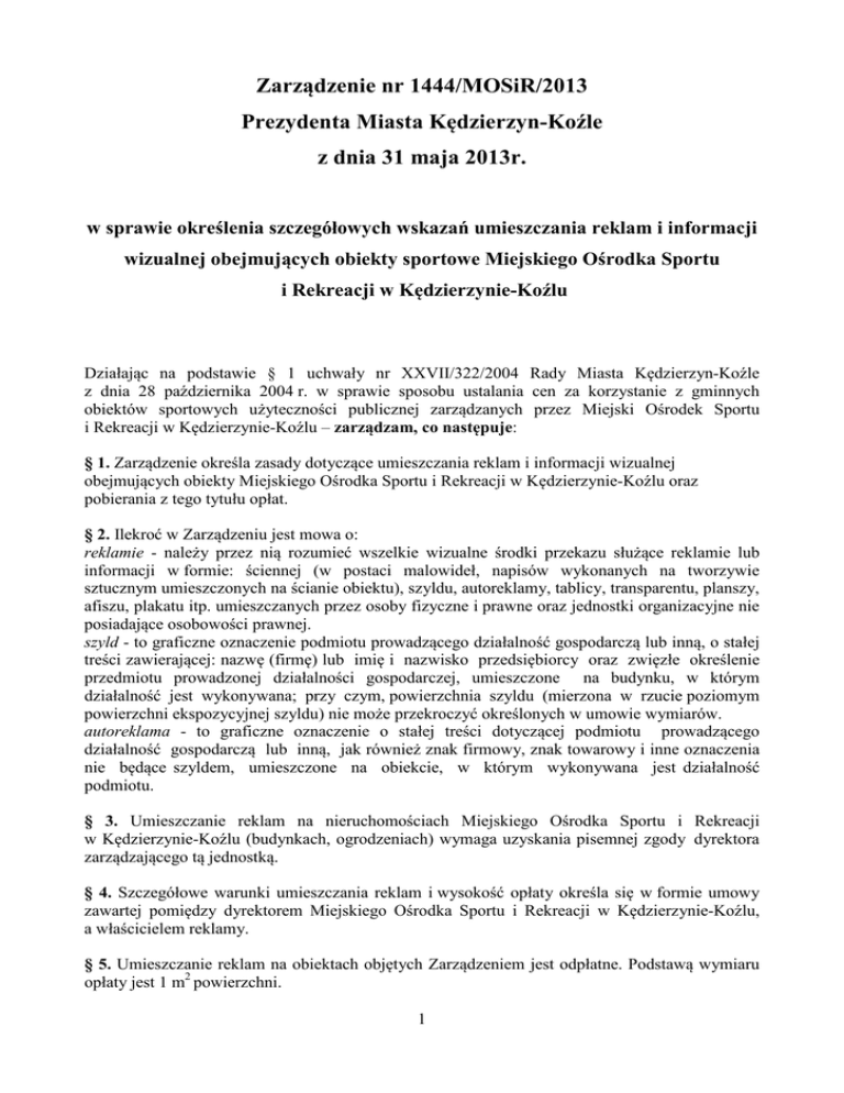 Zarządzenie nr 1444/MOSiR/2013 Prezydenta Miasta Kędzierzyn-Koźle z dnia 31 maja 2013r. w sprawie określenia szczegółowych wskazań umieszczania reklam i informacji wizualnej obejmujących obiekty sportowe Miejskiego Ośrodka Sportu i Rekreacji w Kędzierzynie-Koźlu Działając na podstawie § 1 uchwały nr XXVII/322/2004 Rady Miasta Kędzierzyn-Koźle z dnia 28 października 2004.r. w sprawie sposobu ustalania cen za korzystanie z gminnych obiektów sportowych użyteczności publicznej zarządzanych przez Miejski Ośrodek Sportu i Rekreacji w Kędzierzynie-Koźlu – zarządzam, co następuje: § 1. Zarządzenie określa zasady dotyczące umieszczania reklam i informacji wizualnej obejmujących obiekty Miejskiego Ośrodka Sportu i Rekreacji w Kędzierzynie-Koźlu oraz pobierania z tego tytułu opłat. § 2. Ilekroć w Zarządzeniu jest mowa o: reklamie - należy przez nią rozumieć wszelkie wizualne środki przekazu służące reklamie lub informacji w formie: ściennej (w postaci malowideł, napisów wykonanych na tworzywie sztucznym umieszczonych na ścianie obiektu), szyldu, autoreklamy, tablicy, transparentu, planszy, afiszu, plakatu itp. umieszczanych przez osoby fizyczne i prawne oraz jednostki organizacyjne nie posiadające osobowości prawnej. szyld - to graficzne oznaczenie podmiotu prowadzącego działalność gospodarczą lub inną, o stałej treści zawierającej: nazwę (firmę) lub imię i nazwisko przedsiębiorcy oraz zwięzłe określenie przedmiotu prowadzonej działalności gospodarczej, umieszczone na budynku, w którym działalność jest wykonywana; przy czym, powierzchnia szyldu (mierzona w rzucie poziomym powierzchni ekspozycyjnej szyldu) nie może przekroczyć określonych w umowie wymiarów. autoreklama - to graficzne oznaczenie o stałej treści dotyczącej podmiotu prowadzącego działalność gospodarczą lub inną, jak również znak firmowy, znak towarowy i inne oznaczenia nie będące szyldem, umieszczone na obiekcie, w którym wykonywana jest działalność podmiotu. § 3. Umieszczanie reklam na nieruchomościach Miejskiego Ośrodka Sportu i Rekreacji w Kędzierzynie-Koźlu (budynkach, ogrodzeniach) wymaga uzyskania pisemnej zgody dyrektora zarządzającego tą jednostką. § 4. Szczegółowe warunki umieszczania reklam i wysokość opłaty określa się w formie umowy zawartej pomiędzy dyrektorem Miejskiego Ośrodka Sportu i Rekreacji w Kędzierzynie-Koźlu, a właścicielem reklamy. § 5. Umieszczanie reklam na obiektach objętych Zarządzeniem jest odpłatne. Podstawą wymiaru opłaty jest 1 m2 powierzchni. 1 § 6. Umieszczenie reklamy następuje na wniosek reklamodawcy, który powinien zawierać: • nazwę i adres wnioskodawcy, • treść reklamy, • szkic i wymiary reklamy, • mapę lub szkic z proponowaną lokalizacją reklamy. § 7. Koszt wynajmu powierzchni reklamowej uzależniony jest od strefy, w której znajduje się dany obiekt oraz od umieszczenia reklamy wewnątrz lub na zewnątrz danego obiektu. Klasyfikacja uwzględnia atrakcyjność obiektu pod względem położenia geograficznego i liczby potencjalnych odbiorców. Strefę I reklamy zewnętrznej, której koszt wynajmu za 1m2 wynosi 100 zł/m-c stanowią obiekty: • Hala Sportowa „Śródmieście” ,al. Jana Pawła II 29, Kędzierzyn-Koźle, • Kryta Pływalnia al. Jana Pawła II 31, Kędzierzyn-Koźle, • Strefa Rekreacyjna przy al. Jana Pawła II, Kędzierzyn-Koźle, • Hala Widowiskowo-Sportowa „Azoty”, ul. Mostowa 1A, Kędzierzyn-Koźle, • Stadion Sportowy „Koźle” ul. B. Chrobrego 25, Kędzierzyn-Koźle, • Stadion Sportowy „Kuźniczka”, ul Grunwaldzka 71, Kędzierzyn-Koźle. Strefę II reklamy zewnętrznej, której koszt wynajmu za 1m2 wynosi 50 zł / m-c stanowią obiekty: • Stadion Sławięcice, ul. Sadowa , Kędzierzyn-Koźle, • Stadion Kłodnica, ul. Sportowa, Kędzierzyn-Koźle, • Stadion Cisowa, ul. Brzechwy, Kędzierzyn-Koźle, • Basen odkryty „ Azotor ”, ul. Mostowa 1, Kędzierzyn-Koźle, • Stadion Sportowy „Blachownia” (ogrodzenie zewnętrzne), • Boisko Osiedlowe przy ul. Lompy, Kędzierzyn-Koźle, • Boisko Osiedlowe przy ul. Jasnej, Kędzierzyn-Koźle, • Boisko Osiedlowe przy ul. Starej, Kędzierzyn-Koźle, • Boisko Osiedlowe przy ul. Zwycięstwa, Kędzierzyn-Koźle, • Boisko Osiedlowe przy ul. Szkolnej, Kędzierzyn-Koźle. • Boisko Orlik, ul. 9 Maja, Kędzierzyn-Koźle, • Boisko Orlik, ul. Skarbowa, Kędzierzyn-Koźle, • Boisko Orlik ul. Partyzantów, Kędzierzyn-Koźle, Strefę I reklamy wewnętrznej, której koszt wynajmu za 1m2 wynosi 100 zł/m-c stanowią obiekty: • Kryta Pływalnia al. Jana Pawła II 31, Kędzierzyn-Koźle, • Hala Widowiskowo-Sportowa „Azoty”, ul. Mostowa 1A, Kędzierzyn-Koźle, • Hala Sportowa „Śródmieście”, al. Jana Pawła II 29, Kędzierzyn-Koźle, Strefę II reklamy wewnętrznej, której koszt wynajmu za 1m2 wynosi 50 zł/m-c stanowi obiekt: • Stadion Sportowy „Kuźniczka”, ul Grunwaldzka 71, Kędzierzyn-Koźle. W przypadku umieszczenia reklamy na czas poniżej 1 miesiąca opłata za wynajem powierzchni reklamowej będzie wyliczona proporcjonalnie do ilości dni, nie mniej niż 10 zł za 1 m2 . § 8. Kształt, kolor i sposób wykonania reklamy powinien być zharmonizowany z otoczeniem, nie oszpecać budynku lub innego obiektu oraz nie może zagrażać bezpieczeństwu ludzi i mienia. § 9. Do obliczenia powierzchni nośnika reklamy o kształcie nieregularnym przyjmuje się powierzchnię prostokąta, w którym mieści się dana reklama. 2 § 10. Reklamy znajdujące się na obiektach Miejskiego Ośrodka Sportu i Rekreacji w Kędzierzynie-Koźlu nie mogą się kłócić z polityką firmy bądź wpływać na jej negatywny wizerunek. § 11. Odpłatności za ekspozycję ulotek na terenie obiektów Miejskiego Ośrodka Sportu i Rekreacji w Kędzierzynie-Koźlu wynosi 1zł / dobę. § 12. Opłata za umieszczenie reklam jest uiszczana w formie opłaty miesięcznej z g