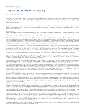 Analiza Transakcyjna.pl Trzy szkoły analizy transakcyjnej dodano dnia 2009-08-26 22:17:23 Rozróżniamy trzy główne „szkoły” analizy transakcyjnej. Każda z nich kładzie akcent na swoiste podejście teoretyczne oraz na charakterystyczne dla tej szkiły techniki terapeutyczne. Niwielu terapeutów indywidualnych zajmuje się w dzisiejszych czasach pracą opartą wyłącznie na jednej z tych „szkół”. Aby otrzymać akredytację w zawodzie analityka transakcyjnego, terapeuta musi dać dowód swych umiejętności czerpania myśli i technik z każdej z tych trzech szkół. Poniżej przedstawiony opis każdej ze szkół ukazuje główne aspekty każdego podejścia. Należy pamiętać, że podczas gdy wszystkie trzy szkoły stanowią integralną całość, są one jednocześnie nieodłącznymi aspektami patrzenia na problem z perspektywy tego samego modelu o wspólnej nazwie analiza transakcyjna. Szkoła klasyczna Szkoła klasyczna w sposób najbardziej bezpośredni przybliża się do leczenia jakie najpierw rozwinął Berne i jego współpracownicy. Praktycy używający podejścia klasycznego stosują całą gamę modeli analitycznych, aby ułatwić klientowi zrozumienie zachodzących w umyśle procesów z perspektywy stanu Ja-Dorosły i aby jednocześnie „włączyć” motywację stanu Ja-Dziecko (…). W podejściu klasycznym pierwszy krok, który stawia klient polega na zrozumieniu jak doprowadza się sam do problematycznych sytuacji w swoim życiu. Następnie terapeuta i klient ustalają kontrakt (umowę), w której klient decyduje się na dokonanie zmian w swoim zachowaniu. Każda zmiana to kolejny etap i krok w kierunku wyjścia ze starych schematów scenarycznych (skryptowych) w celu osiągnięcia autonomii. Zaobserwowano, że w miarę jak klient zmienia swoje zachowania, także wahlarz uczuć, które budzą się w kliencie ulega zmianie. Zachęcanie klienta do wyrażenia tychże uczuć nie jest głównym elementem pracy w podejciu zgodnym z założeniami klasycznej analizy transakcyjnej. Grupowe leczenie (terapia grupowa) jest najbardziej popularną formą praktycznego zastosowania założeń szkoły klasycznej. Proces grupowy jest uważany za trzon podejścia klasycznego. Oznacza to, że to, co dzieje się między klientem a członkami grupy doprowadza do ponownego ujawnienia się problemu klienta. Problem ten dotyczy zwykle zaburzenia, z którym klient zgłosił się na terapię i który powstał w dzieciństwie i od czasów dzieciństwa nie został rozwiązany. Rolą terapeuty jest przyzwolenie na rozwój procesu grupowego oraz na używanie interwencji terapeutycznych, co pozwala członkom grupy terapeutycznej zdać sobie sprawę z gier prowadzonych w grupie, z pasożytnictwa uczuciowego zachodzącego między członkami grupy i innych schematów scenarycznych (skryptowych), które ujawniają się w relacjach między członkami grupy i terapeutą. Z punktu widzenia szkoły klasycznej ważna funkcja terapeuty polega na dawaniu klientowi nowych przesłań (komunikatów) rodzicielskich. Pat Crossman proponuje trzy typy takich komunikatów (trzy P), których terapeuta musi użyć, aby proces komunikowania rodzicielskiego stał się skuteczny: Pozwolenie (Permission), Ochrona (Protection), Moc (Potency) . Dając Pozwolenie, terapeuta przekazuje klientowi komunikaty, które są sprzeczne z negatywnymi nakazami rodzicielskimi lub przeciw-nakazami scenariusza (skryptu). Może ich udzielić werbalnie, jak na przykład: „Przestań tak ciężko pracować!” lub „Dobrze, że czujesz to, co czujesz!”. Pozwolenia mogą być również udzielane niewerbalnie przez dawanie klientowi przykładu przez własne zachowanie terapeuty. Aby Pozwolenia zostały przyjęte przez klienta jako autentyczne i zaakceptowane przez niego w sposób jednoznaczny, konieczne jest, aby klient komunikował się z terapeutą z poziomu stanu Ja-Dziecko i aby postrzegał w terapeucie pełen Mocy stan Ja-Rodzic, a nie ukształtowany przez własnych rodziców klienta stan Ja-Rodzic, oparty na negatywnych przesłaniach pochodzących z dzieciństwa. Aby interwecja terapeytyczna (Pozwolenie) była skuteczna, klient musi także patrzeć na terapeutę jako na osobę zdolną do zapewnienia mu Ochrony przed niszczącymi konsekwencjami odmowy zastosowania się do negatywnych nakazów pochodzących od własnych rodziców. Szkoła redecyzji (przedecydowania) Bob i Mary Goulding stworzyli podejście terapeutyczne, które łączy teorię analizy transakcyjnej z technikami terapii gestalt, rozwiniętej przez Fredericka Perlsa. Gouldingowie podkreślają, że decyzje z wczesnego dzieciństwa są podjęte w pozycji życiowej odczutej, a nie przemyślanej. W konsekwencji, aby klient mógł uwolnić się od scenariusza (skryptu) trzeba, aby nawiązał ponowny kontakt z uczuciami swego własnego stanu Ja-Dziecko doświadczonymi w chwili pierwotnej decyzji (early decision), i zakończył tę sytuację wyrażając te uczucia i zastąpił decyzję z wczesnego dzieciństwa przez ponowną decyzję (redecyzję), lepiej dostosowaną do jego obecnych oczekiwań. Możemy tego dokonać przez pracę ze snami, z wizualizacjami czy też przez pracę nad samą „sceną pierwotną”, w której klient w myślach powraca do tej samej starej, dobrze znanej i pełnej traumy sytuacji, aby jej ponownie doświadczyć. Bob i Mary Goulding zgadzają się z Perlsem, który twierdził, że kiedy ktoś utknął na dobre ze swoim problemem, oznacza to, że dwie części jego osobowości przeciwstawiają się sobie z równymi siłami. Rezultatem jest zużywanie wielkich pokładów energii i brak rozwiązania w jakimkolwiek kierunku. Ta sytuacja nazwana została impasem. Gouldingowie rozwinęli teorię Perlsa pokazując, że impasy powstają między różnymi stanami ja. W terapii wychodzenie z impasów odbywa się głównie przy pomocy techniki zapożyczonej z terapii gestalt, którą nazywamy „metodą dwóch krzeseł”. Klient wyobraża sobie swoj