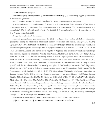 Słownik polszczyzny XVI wieku - wersja elektroniczna hasło: CZTERNASTY (stan na dzień: 11-10-2015) www.spxvi.edu.pl strona 1/1 CZTERNASTY (84) nm czternasty (82), czterynasty (1), szternasty a. śternasty (1); czterynasty WyprKr; szternasty a. śternasty ZapKościer. -é- (3) BiałKat, Oczko (2), -e- (4) OpecŻyw (2), Mącz, SiebRozmyśl; a pochylone. sg m N cztérnåsty (27), cztérynåsty (1) WyprKr. ◊ G cztérnåstégo (29); -égo (2), -(e)go (27). ◊ A cztérnåsty (7). ◊ f N cztérnåstå (8), cztérnast(a) (2). ◊ G cztérnåst(e)j (2). ◊ A cztérnåstą (1). ◊ L cztérnåst(e)j (1). ◊ n N cztérnåsté (3); -é (1), -(e) (2). ◊ G cztérnåst(e)go (1). ◊ L cztérnåstym (1). ◊ pl N subst cztérnåst(e) (1). Sł stp, Cn notuje, Linde bez cytatu. Liczebnik porządkowy; quartusdecimus Cn (84) : krolyewa [...] wielky piathek o czternaſtey godzynye/ czerą na wſchitkich czlonczech zdrowa porodzicz ieſt raczila. LibLeg 4/26, 8/26v; OpecŻyw 193v [2 r.]; PatKaz III 98; FalZioł V 18a; LubPs D2 żp; Y Stháło ſie cżternaſtego roku Krolá Ezechiaſſá/ przyćiągnął Sennácheryb Krol Aſsyriyſki Leop Is 36/1, 1.Par 25/21, Esth 9/15, 17, 18, 19 (10); Czterinasti Alspant, albo obrecz zlota WyprKr 9; Naprzod dniá czternaſtego mieſiącá pierwſzego pod wieczor/ będźiećie obchodźić Wielką noc Páńſką. BibRadz Lev 23/5, Gen 14/5, 4.Reg 18/13, Esth 10/13, Act 27/27, 33; IAn cżternaſty rodem z Włoch/ był Papieżem ſześć lat y dwá mieſiącá. BielKron 174v; Rozdźiał Cżternaſty o Zmartwychwſtániu y Sądnym dniu. BielKron 467v, 36, 47, 62, 169v, 219 (9); Critici dies, alias Decretorii, Podeyrzáne dni w chorobách luckich/ z których łatwie poznáć yeſli ſie ku zdrowiu álbo ku ſmierćy ma/ yáko ſą dni/ ſiodmy/ cżternaſty/ etć. Mącz 69a; Wiedz że tedy/ iżći kreẃ w Człowiecze poczynaſye mnożyć od Czternaſtego dniá Lutego/ áż do Czternaſtego Máiá SienLek 41v, 42 [2 r.], 66, 158; RejAp 160v; Ewányelia Niedzyele cżternaſtey po Troycy ſwiętey RejPos 211v, 211v żp; Czytayże cztérnaſty y trzynaſty Kanon Nicéńſkiégo Seymu BiałKat 326; RejZwierc Bv; BudBib Ex 12/6, Ios 5/10, Esth 9/15, 17, 18 (8); BudNT Act 27/27; ModrzBaz 32v, 84, 125v; SkarJedn 92, 237; Oczko 20, 30; SkarŻyw 147, 440; StryjKron 507 żp; anno domini 1582 dnya sternaſtego xzeſzicza Maya stalo ſzyę wdomu barthoſza Swarki ZapKościer 1582/28v; ReszPrz 22; GostGosp 140, 141 żp; Pánno cżternaſtego roku Iozephowi/ z ſkrytey rády Bożey/ roſtropnie pośl⟨u⟩biona/ modl ſię zá námi.LatHar 501, 300, 509, 547; RybGęśli C3v; Lekcya w czternaſtą Niedzielę po Swiątkách. WujNT 663 marg, Act 27/27, s. 299, Act 27/33; SiebRozmyśl D2v [2 r.], L3v; GrabPospR N4; SkarKaz 419a. Zestawienie liczebnikowe (2): Pſalm Setny cżternaſty. RejPs 168v; LubPs Z6 żp. Cf [CZTERNASTNY], CZWARTYNASTY, CZWARTYNAŚCIE LZ