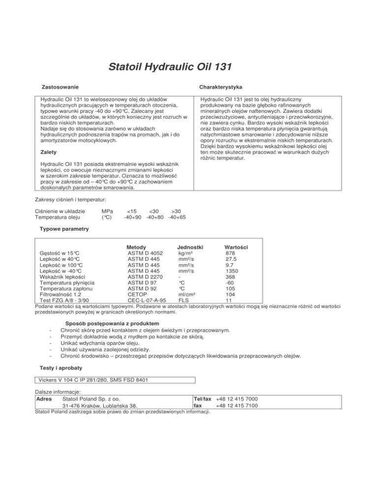 Statoil Hydraulic Oil 131 Zastosowanie Charakterystyka Hydraulic Oil 131 to wielosezonowy olej do układów hydraulicznych pracuj cych w temperaturach otoczenia, typowe warunki pracy -40 do +90°C. Zalecany jest szczególnie do układów, w których konieczny jest rozruch w bardzo niskich temperaturach. Nadaje si do stosowania zarówno w układach hydraulicznych podnoszenia trapów na promach, jak i do amortyzatorów motocyklowych. Hydraulic Oil 131 jest to olej hydrauliczny produkowany na bazie gł boko rafinowanych mineralnych olejów naftenowych. Zawiera dodatki przeciwzu yciowe, antyutleniaj ce i przeciwkorozyjne, nie zawiera cynku. Bardzo wysoki wska nik lepko ci oraz bardzo niska temperatura płyni cia gwarantuj natychmiastowe smarowanie i zdecydowanie ni sze opory rozruchu w ekstremalnie niskich temperaturach. Dzi ki bardzo wysokiemu wska nikowi lepko ci olej ten mo e skutecznie pracowa w warunkach du ych ró nic temperatur. Zalety Hydraulic Oil 131 posiada ekstremalnie wysoki wska nik lepko ci, co owocuje nieznacznymi zmianami lepko ci w szerokim zakresie temperatur. Oznacza to mo liwo pracy w zakresie od – 40°C do +90°C z zachowaniem doskonałych parametrów smarowania. Zakresy ci nie i temperatur: Ci nienie w układzie Temperatura oleju MPa (°C) <15 <30 >30 -40+90 -40+80 -40+65 Typowe parametry G sto w 15°C Lepko w 40°C Lepko w 100°C Lepko w -40°C Wska nik lepko ci Temperatura płyni cia Temperatura zapłonu Filtrowalno 1.2 Test FZG A/8 - 3/90 Metody ASTM D 4052 ASTM D 445 ASTM D 445 ASTM D 445 ASTM D 2270 ASTM D 97 ASTM D 92 CETOP CEC-L-07-A-95 Jednostki kg/m³ mm²/s mm²/s mm²/s °C °C ml/cm² FLS Warto ci 878 27.5 9.7 1350 368 -60 105 104 11 Podane warto ci s warto ciami typowymi. Podawane w atestach laboratoryjnych warto ci mog si nieznacznie ró ni od warto ci przedstawionych powy ej w granicach okre lonych normami. - Sposób post powania z produktem Chroni skór przed kontaktem z olejem wie ym i przepracowanym. Przemy dokładnie wod z mydłem po kontakcie ze skór . Unika wdychania oparów oleju. Unika u ywania zaolejonej odzie y. Chroni rodowisko – przestrzega przepisów dotycz cych likwidowania przepracowanych olejów. Testy i aprobaty Vickers V 104 C IP 281/280, SMS FSD 8401 Dalsze informacje: Adres Statoil Poland Sp. z oo. 31-476 Kraków, Lubla ska 38. Tel/fax +48 12 415 7000 fax +48 12 415 7100 Statoil Poland zastrzega sobie prawo do zmian przedstawionych informacji. -40 -30 -20 -10 0 10 20 Temperature °C 30 40 50 60 70 80 300.000 200.000 100.000 50.000 90 100 110 120 130 140 150 160 300.000 200.000 100.000 50.000 Viscosity chart Hydraulic Oil 131 20.000 20.000 10.000 10.000 1.000 1.000 500 400 300 500 400 300 200 200 100 100 50 40 50 40 30 30 20 20 15 15 10 9,0 8,0 7,0 10 9,0 8,0 7,0 6,0 6,0 5,0 5,0 4,0 4,0 3,0 3,0 PMJ 12.96 2,0 -40 -30 -20 -10 0 10 20 30 40 50 60 Temperature °C 70 80 90 100 110 120 130 140 150 2,0 160 Viscosity mm²/s (cSt) 5.000 4.000 3.000 2.000 Viscosity mm²/s (cSt) 5.000 4.000 3.000 2.000