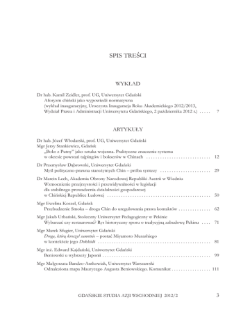 Spis treści WYKŁAD Dr hab. Kamil Zeidler, prof. UG, Uniwersytet Gdański Aforyzm chiński jako wypowiedź normatywna (wykład inauguracyjny, Uroczysta Inauguracja Roku Akademickiego 2012/2013, Wydział Prawa i Administracji Uniwersytetu Gdańskiego, 2 października 2012 r.) . . . . . 7 ARTYKUŁY Dr hab. Józef Włodarski, prof. UG, Uniwersytet Gdański Mgr Jerzy Stankiewicz, Gdańsk „Boks z Putny” jako sztuka wojenna. Praktyczne znaczenie systemu w okresie powstań tajpingów i bokserów w Chinach . . . . . . . . . . . . . . . . . . . . . . . . . . . . . 12 Dr Przemysław Dąbrowski, Uniwersytet Gdański Myśl polityczno-prawna starożytnych Chin – próba syntezy . . . . . . . . . . . . . . . . . . . . . . . 29 Dr Marcin Lech, Akademia Obrony Narodowej Republiki Austrii w Wiedniu Wzmocnienie przejrzystości i przewidywalności w legislacji dla stabilnego prowadzenia działalności gospodarczej w Chińskiej Republice Ludowej . . . . . . . . . . . . . . . . . . . . . . . . . . . . . . . . . . . . . . . . . . . . . . 50 Mgr Ewelina Koszel, Gdańsk Przebudzenie Smoka – droga Chin do uregulowania prawa kontaktów . . . . . . . . . . . . . . 62 Mgr Jakub Urbański, Stołeczny Uniwersytet Pedagogiczny w Pekinie Wyburzać czy restaurować? Rys historyczny sporu o tradycyjną zabudowę Pekinu . . . . . 71 Mgr Marek Sfugier, Uniwersytet Gdański Droga, którą kroczył samotnie – postać Miyamoto Musashiego w kontekście jego Dokkōdō . . . . . . . . . . . . . . . . . . . . . . . . . . . . . . . . . . . . . . . . . . . . . . . . . . 81 Mgr inż. Edward Kajdański, Uniwersytet Gdański Beniowski u wybrzeży Japonii . . . . . . . . . . . . . . . . . . . . . . . . . . . . . . . . . . . . . . . . . . . . . . . 99 Mgr Małgorzata Bandzo-Antkowiak, Uniwersytet Warszawski Odnaleziona mapa Maurycego Augusta Beniowskiego. Komunikat . . . . . . . . . . . . . . . . 111 GDAŃSKIE STUDIA AZJI WSCHODNIEJ 2012/2 3 Dr Jacek Splisgart, Uniwersytet Gdański Obrzędowość okresu dorastania jako istotny składnik procesu kształtowania się tożsamości kulturowej i etnicznej we współczesnej Japonii . . . . . . . . 114 Dr Bartosz Michalski, Uniwersytet Wrocławski Handlowa neutralność w reżimie Światowej Organizacji Handlu. Przypadek Mongolii . . . . . . . . . . . . . . . . . . . . . . . . . . . . 130 PRÓBY STUDENCKIE Dawid Jacek Michalski Kara śmierci w prawie karnym Chińskiej Republiki Ludowej – zarys instytucji . . . . . . . 150 RECENZJE Zbigniew Wiktor, Mieczysław Rakowski, Rozwój i prognozy przyszłości Chin w zmieniającym się świecie, Wydawnictwo Adam Marszałek, Toruń 2012, ss. 511 (Ewa Oziewicz) . . . . . . . . . . . . . . . . . 159 Meir Shahar, Klasztor Shaolin. Historia, religia i chińskie sztuki walki, Wydawnictwo Uniwersytetu Jagiellońskiego, Kraków 2011, ss. 310 (Krzysztof Brzozowski) . . . . . . . . . . . . . . . . . . . . . . . . . . . . . . . . . . . . 161 SPRAWOZDANIA Sprawozdanie z VI Międzynarodowej Konferencji Naukowej „Dylematy współczesnej Azji”, Toruń, 17–18 maja 2012 r. (Marta Dargas) . . . . . . . . . . . . . 166 Sprawozdanie z pobytu studentów z Harbina na Uniwersytecie Gdańskim w roku akademickim 2010/2011 i 2011/2012 (Monika Pytel) . . . . . . . . . . . . . . . . . . . . . . . . 168 Sprawozdanie z 1. Festiwalu Kultury Azjatyckiej Uniwersytetu Gdańskiego „Made in Azja: Made in China”, Gdańsk 24–27 maja 2012 r. (Marta Maciejewska) . . . . . . . . . . . . . . . . . . . . . . . . . . . . . . . . . . 170 DOKUMENTY Porozumienie między Ministrem Nauki i Szkolnictwa Wyższego Rzeczypospolitej Polskiej a Ministerstwem Edukacji Chińskiej Republiki Ludowej o współpracy w dziedzinie szkolnictwa wyższego, podpisane w Pekinie dnia 20 grudnia 2011 r. (M.P. z 2012 r., poz. 122) . . . . . . . . . . . . . . . . . . . . . . . . . . . . . . . . . . 174 Protokół o współpracy kulturalnej między Ministrem Kultury i Dziedzictwa Narodowego Rzeczypospolitej Polskiej a Ministerstwem Kultury Chińskiej Republiki Ludowej na lata 2012–2015, podpisany w Warszawie dnia 25 kwietnia 2012 r. (M.P. z 2012 r., poz. 351) . . . . . . . . . . . . . 188