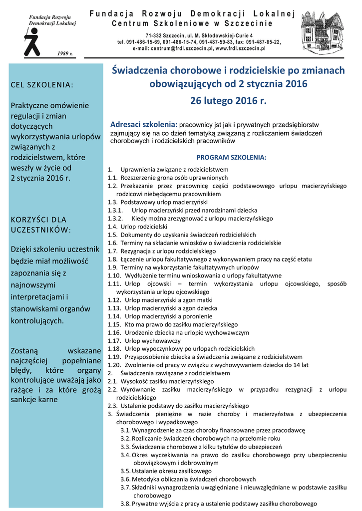 CEL SZKOLENIA: Praktyczne omówienie regulacji i zmian dotyczących wykorzystywania urlopów związanych z rodzicielstwem, które weszły w życie od 2 stycznia 2016 r. KORZYŚCI DLA UCZESTNIKÓW : Dzięki szkoleniu uczestnik będzie miał możliwość zapoznania się z najnowszymi interpretacjami i stanowiskami organów kontrolujących. Zostaną wskazane najczęściej popełniane błędy, które organy kontrolujące uważają jako rażące i za które grożą sankcje karne Świadczenia chorobowe i rodzicielskie po zmianach obowiązujących od 2 stycznia 2016 26 lutego 2016 r. Adresaci szkolenia: pracownicy jst jak i prywatnych przedsiębiorstw zajmujący się na co dzień tematyką związaną z rozliczaniem świadczeń chorobowych i rodzicielskich pracowników PROGRAM SZKOLENIA: 1. Uprawnienia związane z rodzicielstwem 1.1. Rozszerzenie grona osób uprawnionych 1.2. Przekazanie przez pracownicę części podstawowego urlopu macierzyńskiego rodzicowi niebędącemu pracownikiem 1.3. Podstawowy urlop macierzyński 1.3.1. Urlop macierzyński przed narodzinami dziecka 1.3.2. Kiedy można zrezygnować z urlopu macierzyńskiego 1.4. Urlop rodzicielski 1.5. Dokumenty do uzyskania świadczeń rodzicielskich 1.6. Terminy na składanie wniosków o świadczenia rodzicielskie 1.7. Rezygnacja z urlopu rodzicielskiego 1.8. Łączenie urlopu fakultatywnego z wykonywaniem pracy na część etatu 1.9. Terminy na wykorzystanie fakultatywnych urlopów 1.10. Wydłużenie terminu wnioskowania o urlopy fakultatywne 1.11. Urlop ojcowski – termin wykorzystania urlopu ojcowskiego, sposób wykorzystania urlopu ojcowskiego 1.12. Urlop macierzyński a zgon matki 1.13. Urlop macierzyński a zgon dziecka 1.14. Urlop macierzyński a poronienie 1.15. Kto ma prawo do zasiłku macierzyńskiego 1.16. Urodzenie dziecka na urlopie wychowawczym 1.17. Urlop wychowawczy 1.18. Urlop wypoczynkowy po urlopach rodzicielskich 1.19. Przysposobienie dziecka a świadczenia związane z rodzicielstwem 1.20. Zwolnienie od pracy w związku z wychowywaniem dziecka do 14 lat 2. Świadczenia zawiązane z rodzicielstwem 2.1. Wysokość zasiłku macierzyńskiego 2.2. Wyrównanie zasiłku macierzyńskiego w przypadku rezygnacji z urlopu rodzicielskiego 2.3. Ustalenie podstawy do zasiłku macierzyńskiego 3. Świadczenia pieniężne w razie choroby i macierzyństwa z ubezpieczenia chorobowego i wypadkowego 3.1. Wynagrodzenie za czas choroby finansowane przez pracodawcę 3.2. Rozliczanie świadczeń chorobowych na przełomie roku 3.3. Świadczenia chorobowe z kilku tytułów do ubezpieczeń 3.4. Okres wyczekiwania na prawo do zasiłku chorobowego przy ubezpieczeniu obowiązkowym i dobrowolnym 3.5. Ustalanie okresu zasiłkowego 3.6. Metodyka obliczania świadczeń chorobowych 3.7. Składniki wynagrodzenia uwzględniane i nieuwzględniane w podstawie zasiłku chorobowego 3.8. Prywatne wyjścia z pracy a ustalenie podstawy zasiłku chorobowego 3.9. Sposób uzupełniania wynagrodzenia w podstawie zasiłku chorobowego 3.10. Uzupełnienie wynagrodzenia za miesiąc, w którym nastąpiło przekroczenie limitu podstawy wymiaru składek na ubezpieczenie emerytalne i rentowe 3.11. Składniki okresowe w podstawie zasiłku chorobowego 3.12. Składniki roczne, kwartalne w podstawie zasiłku chorobowego 3.13. Wysokość świadczeń chorobowych 3.14. Zasiłek opiekuńczy, dodatkowy zasiłek opiekuńczy 3.15. Wyliczanie wynagrodzenia za przepracowaną część miesiąca spowodowaną absencją chorobową 3.16. Ustalenie wynagrodzenia za pracę oraz świadczenia chorobowego za ten sam dzień 3.17. Najniższa podstawa świadczeń chorobowych 3.18. Nowe zasady wystawiania zwolnień lekarskich, tzw. e – zwolnienia, obowiązki płatnika składek do utworzenia profilu informacyjnego. 3.19. Kody literowe na zwolnieniach lekarskich 3.20. Ustalanie nowej podstawy zasiłku chorobowego 3.21. Świadczenie rehabilitacyjne 3.22. Świadczenia chorobowe z umów cywilnoprawnych Prowadzący: Adriana Głuchowska Miejsce: Centrum Szkoleniowe FRDL w Szczecinie, ul. Skłodowskiej-Curie 4 Czas trwania: godz. 10.00-15.00 Cena: 320 zł netto/os. przy zgłoszeniu do 23 lutego 2016r. Zwolnione z VAT w przypadku szkoleń podnoszących kwalifikacje pracowników JST oraz ich jednostek organizacyjnych oraz finansowania szkolenia w co najmniej 70% ze środków publicznych. W cenie: materiały szkoleniowe, zaświadczenie o ukończeniu szkolenia, lunch i serwis kawowy. RABAT 10% dla każdej kolejnej osoby zgłoszonej z tej samej instytucji. Zgłoszenia: należy dokonywać najpóźniej do 23 lutego 2016 r., drogą elektroniczną ze strony (www.frdl.szczecin.pl, faksem (091 4878522) bądź listownie. Brak pisemnej rezygnacji w ustalonym powyżej terminie spowoduje obciążenie jednostki zgłaszającej pełnymi kosztami szkolenia.