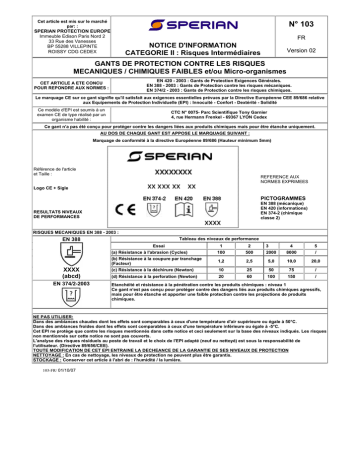 Cet article est mis sur le marché par: : N° 103 SPERIAN PROTECTION EUROPE Immeuble Edison Paris Nord 2 33 Rue des Vanesses BP 55288 VILLEPINTE ROISSY CDG CEDEX FR NOTICE D'INFORMATION CATEGORIE II : Risques Intermédiaires Version 02 GANTS DE PROTECTION CONTRE LES RISQUES MECANIQUES / CHIMIQUES FAIBLES et/ou Micro-organismes EN 420 - 2003 : Gants de Protection Exigences Générales. EN 388 - 2003 : Gants de Protection contre les risques mécaniques. EN 374/2 - 2003 : Gants de Protection contre les risques chimiques. CET ARTICLE A ETE CONCU POUR REPONDRE AUX NORMES : Le marquage CE sur ce gant signifie qu'il satisfait aux exigences essentielles prévues par la Directive Européenne CEE 89/686 relative aux Equipements de Protection Individuelle (EPI) : Innocuité - Confort - Dextérité - Solidité Ce modèle d'EPI est soumis à un examen CE de type réalisé par un organisme habilité : CTC N° 0075- Parc Scientifique Tony Garnier 4, rue Hermann Frenkel - 69367 LYON Cedex Ce gant n a pas été conçu pour protéger contre les dangers liées aux produits chimiques mais pour être étanche uniquement. AU DOS DE CHAQUE GANT EST APPOSE LE MARQUAGE SUIVANT : Marquage de conformité à la directive Européenne 89/686 (Hauteur minimum 5mm) N° de l'organisme effectuant le suivi art.11A Référence de l'article et Taille : REFERENCE AUX NORMES EXPRIMEES Logo CE + Sigle PICTOGRAMMES EN 388 (mécanique) EN 420 (informations) EN 374-2 (chimique classe 2) RESULTATS NIVEAUX DE PERFORMANCES RISQUES MECANIQUES EN 388 - 2003 : Tableau des niveaux de performance EN 388 Essai XXXX (abcd) EN 374/2-2003 1 2 4 5 (a) Résistance à l'abrasion (Cycles) 100 500 3 2000 8000 / (b) Résistance à la coupure par tranchage (Facteur) 1,2 2,5 5,0 10,0 20,0 (c) Résistance à la déchirure (Newton) 10 25 50 75 / (d) Résistance à la perforation (Newton) 20 60 100 150 / Etanchéité et résistance à la pénétration contre les produits chimiques : niveau 1 Ce gant n est pas conçu pour protéger contre des dangers liés aux produits chimiques agressifs, mais pour être étanche et apporter une faible protection contre les projections de produits chimiques. NE PAS UTILISER: Dans des ambiances chaudes dont les effets sont comparables à ceux d'une température d'air supérieure ou égale à 50°C. Dans des ambiances froides dont les effets sont comparables à ceux d'une température inférieure ou égale à -5°C. Cet EPI ne protège que contre les risques mentionnés dans cette notice et ceci seulement sur la base des niveaux indiqués. Les risques non mentionnés sur cette notice ne sont pas couverts. L'analyse des risques résiduels au poste de travail et le choix de l'EPI adapté (neuf ou nettoyé) est sous la responsabilité de l'utilisateur. (Directive 89/656/CEE). TOUTE MODIFICATION DE CET EPI ENTRAINE LA DECHEANCE DE LA GARANTIE DE SES NIVEAUX DE PROTECTION NETTOYAGE : En cas de nettoyage, les niveaux de protection ne peuvent plus être garantis. STOCKAGE : Conserver cet article à l'abri de : l'humidité / la lumière. 103-FR/ 01/10/07 N° 103 This item is sold by: SPERIAN PROTECTION EUROPE Immeuble Edison Paris Nord 2 33 Rue des Vanesses BP 55288 VILLEPINTE ROISSY CDG CEDEX EN TECHNICAL DATA SHEET Version 02 CATEGORY II : Intermediate Risks PROTECTION GLOVES AGAINST RISKS: MINOR MECHANICAL and CHEMICAL and/or Micro-organisms THIS ITEM HAS BEEN DESIGNED IN COMPLIANCE WITH THE STANDARDS: EN 420 - 2003 : Protection Gloves General Requirements EN 388 - 2003 :Gloves for protection against mechanical risks EN 374/2 - 2003 : Gloves for protection against chemicals The CE marking on this glove means that it meets the essential requirements provided for in the European Directive EEC 89/686 concerning Personal Protective Equipment (PPE): Harmlessness - Comfort - Dexterity - Sturdiness CTC N° 0075- Parc Scientifique Tony Garnier 4, rue Hermann Frenkel - 69367 LYON Cedex This PPE model is subjected to a CE test carried out by a certified body: This glove has not been designed to protect against dangers related to chemicals, it is watertight only THE FOLLOWING MARKING APPEARS ON THE BACK OF EACH GLOVE: Marking for compliance with the European directive 89/686 (minimum height 5mm) N° de l'organisme effectuant le suivi art.11A REFERENCE TO STANDARDS EXPRESSED Item reference and Size CE logo + Symbol PICTOGRAMS EN 388 (mechanics) EN 420 (information) EN 374-2003 (Class 2 chemical) RESULTS of PERFORMANCE LEVELS MECHANICAL RISKS EN 388 - 2003: EN 388 Performance level chart Test XXXX (abcd) 1 2 3 4 5 (a) Abrasion resistance (Cycles) 100 500 2000 8000 / (b) Cut resistance (Factor) 1.2 2.5 5.0 10.0 20.0 (c) Tear resistance (Newton) 10 25 50 75 / (d) Perforation resistance (Newton) 20 60 100 150 / EN 374/2-2003 Impermeable and Penetration resistance against chemicals: level 1 This glove has not been designed to protect against hazards related to agressives chemicals; it is designed to be impermeable and to provide low protection against projections of chemicals. DO NOT USE: In hot atmospheres with effects comparable to those of a temperature higher than or equal to 50°C. In cold atmospheres with effects comparable to those of a temperature below than or equal to -5°C. This PPE only offers protection against the risks indicated in this technical data sheet and only for the levels indicated. Any risk not included in this technical data sheet is not covered. The analysis of residual risks at the workstation and the choice of the suitable PPE (new or cleaned) is the responsibility of the user (directive 89/656/EEC). ANY MODIFICATION OF THIS PPE SHALL LEAD TO THE LOSS OF THE GUARANTEE OF ITS PROTECTION LEVELS. CLEANING: In case of cleaning, the protection levels cannot be guaranteed. STORAGE: Keep this item away from humidity / light. 103-EN/01/10/07 N° 103 Dieses Produkt erhalten Sie bei: SPERIAN PROTECTION EUROPE Immeuble Edison Paris Nord 2 33 Rue des Vanesses BP 55288 VILLEPINTE ROISSY CDG CEDEX DE TECHNISCHES DATENBLATT Vers