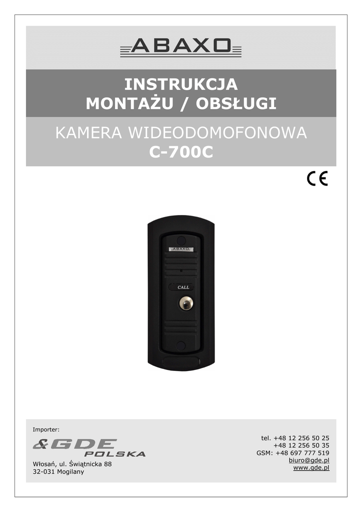 INSTRUKCJA MONTAŻU / OBSŁUGI KAMERA WIDEODOMOFONOWA C-700C Importer: Włosań, ul. Świątnicka 88 32-031 Mogilany tel. +48 12 256 50 25 +48 12 256 50 35 GSM: +48 697 777 519 [email protected] www.gde.pl C-700C Wygląd zewnętrzny kamery C-700C ZANIM ROZPOCZNIESZ MONTAŻ! • Nie montuj videodomofonu w pobliżu urządzeń emitujących pole magnetyczne, takich jak telewizor, magnetowid, itp. • Monitor powinien być ulokowany w pobliżu gniazdka. Jeśli nie używasz videodomofonu przez dłuższy czas, wyłącz zasilanie. • Videodomofon nie powinien znajdować się w miejscach narażonych na dużą wilgotność powietrza. • Nie lokuj urządzenia w miejscach narażonych na wibracje lub wstrząsy. • Nie montuj wideodomofonu w miejscu narażonym na bezpośrednie promieniowanie słoneczne lub inne oświetlenie. Montaż kamery Panel z kamerą powinien być zainstalowany na wysokości odpowiedniej dla danej lokalizacji kamery. Przed ostatecznym montażem podłącz kamerę do monitora i sprawdź widok na ekranie przy różnych ustawieniach kamery. Wybierz optymalną wysokość dla której widok z kamery jest najbardziej odpowiedni. -2- C-700C Montaż kamery C-700C: Schemat połączeń Czarny – GND (zalecany przewód RG-59 – oplot) Biały – Audio ( zalecana średnica przewodu 0,5 mm lub 1mm) Żółty – Video (zalecany przewód RG-59 – żyła wewnętrzna) Czerwony - +12V DC (zalecana średnica przewodu 0,5 mm lub 1mm) -3- C-700C Dane techniczne KAMERA C-700C Zasilanie Pobór mocy Przetwornik obrazu Minimalne oświetlenie Temperatura pracy Waga Wymiary (szer/ wys / gł) 12V DC (z monitora) max 2W 1/4” 0,1 Lux przy 30 cm - 15°C do + 50°C 0,5kg 40 x 121 x 23 mm Rozwiązywanie problemów Jeśli masz problemy z włączeniem wideodomofonu, najpierw sprawdź źródło zasilania monitora. Na zasilaczu powinna świecić się zielona doda LED. Po wywołaniu monitora z kamery na ekranie powinien pojawić się obraz sprzed kamery. Jeśli słyszysz sygnał wywołania a mimo to nie ma wizji sprawdź okablowanie wideodomofonu. Jeśli obraz wizyjny jest niedostatecznie ostry – spróbuj regulacji kontrastu pokrętłem w monitorze. Jeśli mimo to obraz jest niewyraźny – sprawdź okablowanie wideodomofonu. Jeśli nadal występują problemy, proszę skontaktować się z dealerem. Pozbywanie się starych urządzeń elektrycznych To urządzenie jest oznaczone zgodnie z Ustawą o zużytym sprzęcie elektrycznym i elektronicznym symbolem przekreślonego kontenera na odpady. Takie oznakowanie informuje, że sprzęt ten, po okresie jego użytkowania nie może być umieszczany łącznie z innymi odpadami pochodzącymi z gospodarstwa domowego. Użytkownik jest zobowiązany do oddania go prowadzącym zbieranie zużytego sprzętu elektrycznego i elektronicznego. Prowadzący zbieranie, w tym lokalne punkty zbiórki, sklepy oraz gminne jednostki, tworzą odpowiedni system umożliwiający oddanie tego sprzętu. Właściwe postępowanie ze zużytym sprzętem elektrycznym i elektronicznym przyczynia się do uniknięcia szkodliwych dla zdrowia ludzi i środowiska naturalnego konsekwencji, wynikających z obecności składników niebezpiecznych oraz niewłaściwego składowania i przetwarzania takiego sprzętu. -4- C-700C (TŁUMACZENIE DEKLARACJI ZGODNOŚCI) DEKLARACJA ZGODNOŚCI My BONSO ELECTRONICS LTD. UNIT 1106-1110, 11/F., STAR HOUSE, 3 SALISBURY ROAD, TSIMSHATSUI, KOWLOON, HONG KONG. Oświadczamy na własną odpowiedzialność, że produkt: Nazwa produktu: Model: Kamera wideodomofonu C-700C Spełnia następujące normy: EMC: EN 55022:2010, EN 50130-4:2011, EN 61000-3-2:2006 + A1:2009 + A2:2009, EN 61000-3-3:2008 Opisany produkt jest zgodny z dyrektywami: 2004/108/EC 93/68/EEC Osoba odpowiedzialna za sporządzenie deklaracji Susan Seo, Manufacture Plant / Manager 5 marzec 2013, Hong Kong -5- C-700C -6- C-700C Warunki gwarancji: 1. GDE POLSKA udziela gwarancji na okres 24 miesięcy od daty sprzedaży sprzętu. 2. Ujawnione w tym okresie wady sprzętu będą usuwane bezpłatnie przez Serwis w możliwie najkrótszym terminie nieprzekraczającym 14-tu dni roboczych począwszy od daty przyjęcia produktu do naprawy przez Serwis. 3. Warunkiem korzystania z uprawnień gwarancyjnych jest dostarczenie urządzenia do Serwisu GDE POLSKA wraz z dowodem zakupu i oryginalną, poprawnie wypełnioną Kartą Gwarancyjną ( tzn. zawierającą pieczęć firmową sprzedawcy, numer dowodu zakupu, datę sprzedaży, nazwę urządzenia, numer seryjny, model, czytelny podpis osoby wystawiającej kartę oraz podpis kupującego).Odpowiedzialność za błędy popełnione przy wypisywaniu Karty Gwarancyjnej ponosi Sprzedawca. 4. Postanowienia Serwisu mają charakter ostateczny. 5. Uprawniony z gwarancji powinien dostarczyć urządzenie do Serwisu w oryginalnym opakowaniu fabrycznym. Gwarant nie ponosi odpowiedzialności za ewentualne uszkodzenia powstałe podczas transportu do Serwisu. 6. Przy zgłoszeniu wadliwego urządzenia uprawniony z gwarancji powinien załączyć sporządzony w formie pisemnej dokładny opis objawów wadliwego działania urządzenia z uwzględnieniem środowiska pracy i sposobu w jaki się ujawniają. 7. Klientowi przysługuje prawo wymiany sprzętu na nowy, jeżeli: ─ Serwis dokona w trakcie trwania okresu gwarancyjnego trzech napraw, a urządzenie będzie nadal wykazywało wady uniemożliwiające jego użytkowanie zgodne z przeznaczeniem. ─ Serwis stwierdzi na piśmie, iż usunięcie wady nie jest możliwe. W przypadku wymiany sprzętu potrąca się równowartość brakujących lub uszkodzonych mechanicznie przez klienta elementów. 8. Jeżeli wymiana sprzętu na nowy nie jest możliwa, klientowi przysługuje prawo do zwrotu zapłaconej ceny. 9. Gwarant zastrzega sobie prawo obciążenia uprawnionego z gwarancji kosztami usług serwisowych i transportu, gdy uszkodzenie nie było objęte gwarancją lub urządzenie okazało się sprawne. 10. Gwarant może odmówić wykonania usługi gwarancyjnej w przyp