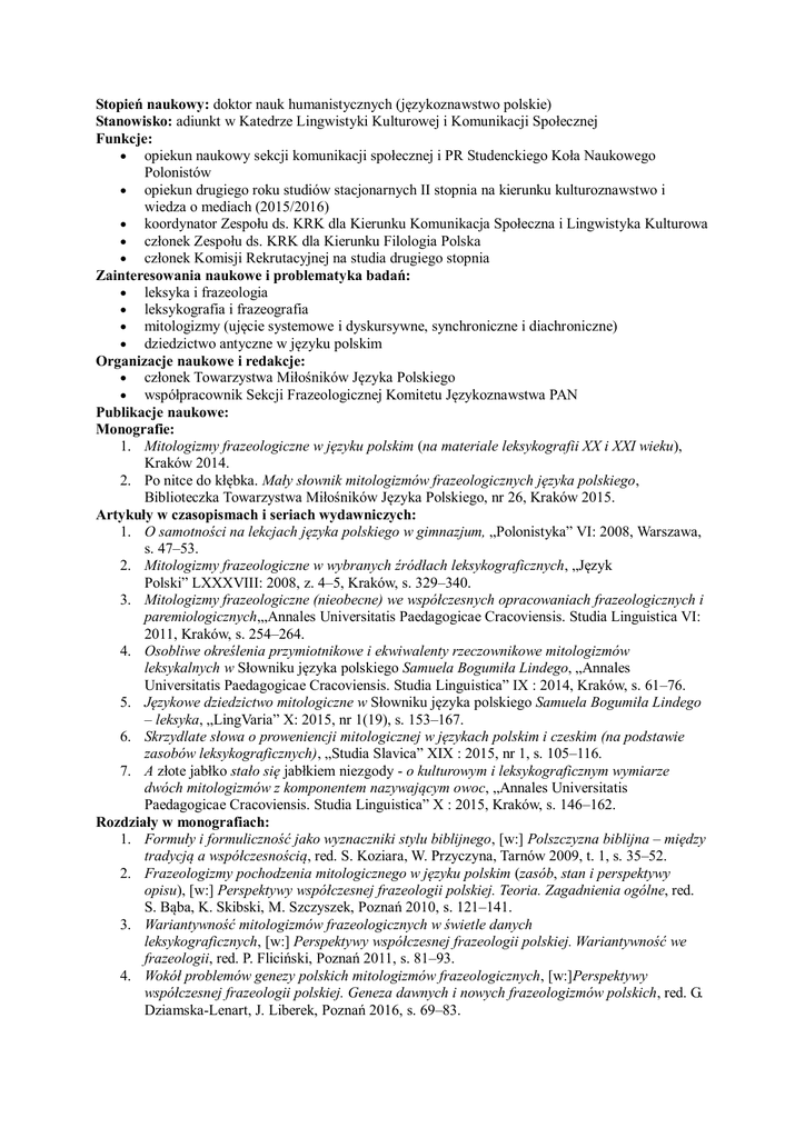 Stopień naukowy: doktor nauk humanistycznych (językoznawstwo polskie) Stanowisko: adiunkt w Katedrze Lingwistyki Kulturowej i Komunikacji Społecznej Funkcje: opiekun naukowy sekcji komunikacji społecznej i PR Studenckiego Koła Naukowego Polonistów opiekun drugiego roku studiów stacjonarnych II stopnia na kierunku kulturoznawstwo i wiedza o mediach (2015/2016) koordynator Zespołu ds. KRK dla Kierunku Komunikacja Społeczna i Lingwistyka Kulturowa członek Zespołu ds. KRK dla Kierunku Filologia Polska członek Komisji Rekrutacyjnej na studia drugiego stopnia Zainteresowania naukowe i problematyka badań: leksyka i frazeologia leksykografia i frazeografia mitologizmy (ujęcie systemowe i dyskursywne, synchroniczne i diachroniczne) dziedzictwo antyczne w języku polskim Organizacje naukowe i redakcje: członek Towarzystwa Miłośników Języka Polskiego współpracownik Sekcji Frazeologicznej Komitetu Językoznawstwa PAN Publikacje naukowe: Monografie: 1. Mitologizmy frazeologiczne w języku polskim (na materiale leksykografii XX i XXI wieku), Kraków 2014. 2. Po nitce do kłębka. Mały słownik mitologizmów frazeologicznych języka polskiego, Biblioteczka Towarzystwa Miłośników Języka Polskiego, nr 26, Kraków 2015. Artykuły w czasopismach i seriach wydawniczych: 1. O samotności na lekcjach języka polskiego w gimnazjum, „Polonistyka” VI: 2008, Warszawa, s. 47–53. 2. Mitologizmy frazeologiczne w wybranych źródłach leksykograficznych, „Język Polski” LXXXVIII: 2008, z. 4–5, Kraków, s. 329–340. 3. Mitologizmy frazeologiczne (nieobecne) we współczesnych opracowaniach frazeologicznych i paremiologicznych,„Annales Universitatis Paedagogicae Cracoviensis. Studia Linguistica VI: 2011, Kraków, s. 254–264. 4. Osobliwe określenia przymiotnikowe i ekwiwalenty rzeczownikowe mitologizmów leksykalnych w Słowniku języka polskiego Samuela Bogumiła Lindego, „Annales Universitatis Paedagogicae Cracoviensis. Studia Linguistica” IX : 2014, Kraków, s. 61–76. 5. Językowe dziedzictwo mitologiczne w Słowniku języka polskiego Samuela Bogumiła Lindego – leksyka, „LingVaria” X: 2015, nr 1(19), s. 153–167. 6. Skrzydlate słowa o proweniencji mitologicznej w językach polskim i czeskim (na podstawie zasobów leksykograficznych), „Studia Slavica” XIX : 2015, nr 1, s. 105–116. 7. A złote jabłko stało się jabłkiem niezgody - o kulturowym i leksykograficznym wymiarze dwóch mitologizmów z komponentem nazywającym owoc, „Annales Universitatis Paedagogicae Cracoviensis. Studia Linguistica” X : 2015, Kraków, s. 146–162. Rozdziały w monografiach: 1. Formuły i formuliczność jako wyznaczniki stylu biblijnego, [w:] Polszczyzna biblijna – między tradycją a współczesnością, red. S. Koziara, W. Przyczyna, Tarnów 2009, t. 1, s. 35–52. 2. Frazeologizmy pochodzenia mitologicznego w języku polskim (zasób, stan i perspektywy opisu), [w:] Perspektywy współczesnej frazeologii polskiej. Teoria. Zagadnienia ogólne, red. S. Bąba, K. Skibski, M. Szczyszek, Poznań 2010, s. 121–141. 3. Wariantywność mitologizmów frazeologicznych w świetle danych leksykograficznych, [w:] Perspektywy współczesnej frazeologii polskiej. Wariantywność we frazeologii, red. P. Fliciński, Poznań 2011, s. 81–93. 4. Wokół problemów genezy polskich mitologizmów frazeologicznych, [w:]Perspektywy współczesnej frazeologii polskiej. Geneza dawnych i nowych frazeologizmów polskich, red. G. Dziamska-Lenart, J. Liberek, Poznań 2016, s. 69–83. 5. Z życia frazeologizmu sobie (śpiewam) a muzom w przestrzeni internetowej, [w:] Język a Media. Zjawiska językowe we współczesnych mediach, red. B. Skowronek, E. Horyń, A. Walecka-Rynduch, Kraków 2016, s. 254–275. Recenzje: 1. Maciej Rak, Kulturemy podhalańskie, Kraków: Wydział Polonistyki Uniwersytetu Jagiellońskiego, 2015, 430 s., Biblioteka „LingVariów”, t. 19: „Annales Universitatis Paedagogicae Cracoviensis. Studia Linguistica” X : 2015, Kraków, s. 203–208. Prace redakcyjne: 1. „Annales Academiae Pedagogicae Cracoviensis. Studia Linguistica” X, red. M. Karamańska, M. Puda-Blokesz, E. Zmuda, Kraków 2015, 217 s. Pozostałe artykuły: 1. Wywiad z ks. Franciszkiem Mąkinią, [w:] Księga Jubileuszowa 100-lecia Szkoły 1904– 2004 Zespołu Szkół Ogólnokształcących im. Mikołaja Kopernika w Żywcu, Żywiec 2004, s. 160–164. 2. Świat bez granic przyzwoitości, „Argument. Interdyscyplinarny kwartalnik” 1: 2006, Kraków, s. 10–11. 3. My studenci nie gęsi…, „Argument. Interdyscyplinarny kwartalnik” 4: 2006, Kraków, s. 6. 4. Kobieta o niejasnym pochodzeniu, „Argument. Interdyscyplinarny kwartalnik” 5: 2007, Kraków, s. 5–6. 5. „Przysłowiowa” kobieta, „Argument. Interdyscyplinarny kwartalnik” 5: 2007, Kraków, s. 6– 7. 6. Przewodnik po leksykografii internetowej, „Argument. Interdyscyplinarny kwartalnik” 6: 2007, Kraków, s. 4–6. Czynny udział w wybranych konferencjach i zebraniach naukowych: 1. Ogólnopolska Konferencja Naukowa Polszczyzna biblijna – między tradycją a współczesnością: Gródek nad Dunajcem, 25–27 września 2006 r. 2. Mitologizmy w zasobach frazeograficznych i paremiograficznych polszczyzny, posiedzenie Komisji Frazeologicznej KJ PAN: Warszawa, 16 listopada 2007 r. 3. Frazeologizmy pochodzenia mitologicznego w zasobach frazeologicznych polszczyzny, zebranie naukowe Krakowskiego Oddziału Towarzystwa Miłośników Języka Polskiego: Kraków, 22 stycznia 2008 r. 4. Ogólnopolskie Sympozjum I Perspektywy współczesnej frazeologii polskiej, Uniwersytet im. Adama Mickiewicza: Poznań, 27 października 2008 r. 5. Międzynarodowa Konferencja Dialog z tradycją (język – kultura – media),Uniwersytet Pedagogiczny im. Komisji Edukacji Narodowej: Kraków, 7–8 grudnia 2010 r. 6. Ogólnopolskie Sympozjum II Perspektywy współczesnej frazeologii polskiej.Wariantywność we frazeologii, Uniwersytet im. Adama Mickiewicza: P