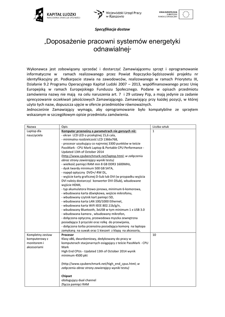 Specyfikacja dostaw Doposażenie pracowni systemów energetyki odnawialnej” „ Wykonawca jest zobowiązany sprzedać i dostarczyć Zamawiającemu sprzęt i oprogramowanie informatyczne w ramach realizowanego przez Powiat Ropczycko-Sędziszowski projektu nr identyfikacyjny pt. Podkarpacie stawia na zawodowców, realizowanego w ramach Priorytetu IX, Działanie 9.2 Programu Operacyjnego Kapitał Ludzki 2007 – 2013, współfinansowanego przez Unię Europejską w ramach Europejskiego Funduszu Społecznego. Podane w opisach przedmiotu zamówienia nazwy nie mają na celu naruszenia art. 7 i 29 ustawy Pzp, a mają jedynie za zadanie sprecyzowanie oczekiwań jakościowych Zamawiającego. Zamawiający przy każdej pozycji, w której użyto tych nazw, dopuszcza ujęcie w ofercie przedmiotów równoważnych. Jednocześnie Zamawiający wymaga, aby oprogramowanie było kompatybilne ze sprzętem wskazanym w szczegółowym opisie przedmiotu zamówienia. Nazwa Laptop dla nauczyciela Kompletny zestaw komputerowy z monitorem i akcesoriami Opis Komputer przenośny o parametrach nie gorszych niż: - ekran LCD LED o przekątnej 15,6 cala, - minimalna rozdzielczość LCD 1366x768, - procesor uzyskujący co najmniej 3300 punktów w teście PassMark - CPU Mark Laptop & Portable CPU Performance Updated 13th of October 2014 (http://www.cpubenchmark.net/laptop.html; w załączeniu obraz strony zawierający wyniki testu) - wielkość pamięci RAM min 8 GB DDR3 1600MHz, - dysk twardy minimum 500 GB SATA, - napęd optyczny DVD+/-RW DL, - wyjście karty graficznej D-Sub lub DVI (w przypadku wyjścia DVI należy dostarczyć konwerter DVI-DSub), wbudowane wyjście HDMI, - typ akumulatora litowo-jonowa, minimum 6-komorowa, - wbudowana karta dźwiękowa, wejście mikrofonu, - wbudowany czytnik kart pamięci SD, - wbudowana karta LAN 100/1000 Ethernet, - wbudowana karta WiFi IEEE 802.11b/g/n, - wbudowany Bluetooth, 3xUSB w tym minimum 1 x USB 3.0 - wbudowana kamera , wbudowany mikrofon, - dołączona optyczna, przewodowa myszka zewnętrzna posiadająca 3 przyciski oraz rolkę do przewijania, - dołączona torba przenośna posiadająca komorę na laptopa zamykaną na suwak oraz 1 kieszeń z klapą na akcesoria, Procesor Klasy x86, dwurdzeniowy, dedykowany do pracy w komputerach stacjonarnych osiągający z teście PassMark - CPU Mark High End CPUs - Updated 13th of October 2014 wynik minimum 4500 pkt (http://www.cpubenchmark.net/high_end_cpus.html; w załączeniu obraz strony zawierający wyniki testu) Chipset obsługujący dual channel Złącza pamięci RAM Liczba sztuk 1 10 min. 2 gniazda DDR, obsługa min. 8 GB, dual channel Porty 1xVGA, 1xRJ45, 4xUSB 2.0, 2xUSB 3.0 (w tym 2 do wyprowadzenia z przodu obudowy) Pamięć RAM DDR3 8 GB (2x4 GB) 1333 MHz Dysk twardy SATA, min. 1TB TB 7200 RPM Karta graficzna Nie może być zintegrowana, pamięć własna 1 GB DDR3 ze wsparciem: DirectX 11 i OpenGl 4.2 kompatybilna z zaoferowanym systemem operacyjnym Karta muzyczna Zintegrowana karta dźwiękowa zgodna z High Definition Karta sieciowa 10/100/1000 Ethernet RJ 45 Napęd optyczny Wewnętrzny napęd DVD+/-RW z możliwością zapisywania na nośnikach dwuwarstwowych wraz z oprogramowaniem do nagrywania płyt w wersji polskojęzycznej pod zaoferowanym systemem operacyjnym Obudowa Obudowa typu Tower, zapewniająca właściwe chłodzenie elementów, wyciszenie jednostki oraz wymagany w Unii Europejskiej poziom ekranowania elektromagnetycznego (CE). Wolne miejsce 1 dodatkowy napęd 5,25’’ oraz na 1 dysk twardy 3,5’’. Zasilacz Zasilacz 230V 50Hz o mocy min. 500 W, aktywny filtr PFC, zgodnie z normą EN61000-3-2 o sprawności energetycznej min. 80%. Klawiatura USB, standard US - QWERTY (układ polski programisty), pełnowymiarowa 104 klawisze, złącze USB Mysz Przewodowa, optyczna USB z rolką przewijania Warunki gwarancji Okres gwarancji: 2 lata. Możliwość rozbudowy sprzętu przez pracowników Zamawiającego bez utraty praw do gwarancji na pozostałe elementy jednostki centralnej. System operacyjny MS Windows 8 pro lub równoważny Monitor LCD lub LED min. 21.5”, Rozdzielczość podstawowa min. 1920x1080, Jasność: minimum 200 cd/m2, Kontrast: 1000:1, czas reakcji 5 ms, Komplet kabli potrzebnych do uruchomienia i podłączenia urządzenia do komputera. Opis równoważności: - System konfigurowalny w całości z interfejsu graficznego, w pełni zgodny z usługą Active Directory funkcjonującą u zamawiającego w oparciu o Windows Serwer 2008 R2 - System operacyjny w najnowszej oficjalnej wersji 11 oprogramowania i polskiej wersji językowej, wraz z narzędziem do szybkiego odtworzenia systemu operacyjnego - Możliwość dokonywania aktualizacji i poprawek systemu przez Internet; Możliwość dokonywania uaktualnień sterowników urządzeń przez Internet – witrynę producenta systemu; - Darmowe aktualizacje w ramach wersji systemu operacyjnego przez Internet (niezbędne aktualizacje, poprawki, biuletyny bezpieczeństwa muszą być dostarczane bez dodatkowych opłat) – wymagane podanie nazwy strony serwera WWW; - Internetowa aktualizacja zapewniona w języku polskim; - Wbudowana zapora internetowa (firewall) dla ochrony połączeń internetowych; zintegrowana z systemem konsola do zarządzania ustawieniami zapory i regułami IPSec v4 i v6; - Zlokalizowane w języku polskim, co najmniej następujące elementy: menu, przeglądarka internetowa, pomoc, komunikaty systemowe; - Wsparcie dla większości powszechnie używanych urządzeń peryferyjnych (np.: drukarek, urządzeń sieciowych, standardów USB, Plug&Play, Wi-Fi); - System działa w trybie graficznym z elementami 3D, zintegrowana z interfejsem użytkownika interaktywna część pulpitu służącą do uruchamiania aplikacji, które użytkownik może dowolnie wymieniać i pobrać ze strony producenta; -Możliwość zdalnej automatycznej instalacji, konfiguracji, administrowania oraz aktualizowania systemu; - Zabezpieczony hasłem hierarchiczny dostęp do systemu,