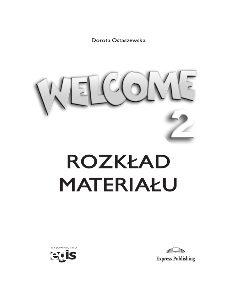 Dorota Ostaszewska ROZK£AD MATERIA£U Redakcja Wydawnictwo EGIS Copyright © Wydawnictwo EGIS Sp. z o. o. Wydanie I, 2007 All rights reserved. No part of this publication may be reproduced, stored in a retrieval system, transmitted, in any form or by any means, electronic, mechanical, photocopying, recording or otherwise, without the prior written permission of the publishers. Wszelkie prawa zastrze¿one. ¯adna czêœæ tej pracy nie mo¿e byæ powielana, czy rozpowszechniana w jakiejkolwiek formie w jakikolwiek sposób, b¹dŸ elektroniczny, b¹dŸ mechaniczny, w³¹cznie z fotokopiowaniem, nagrywaniem na taœmy lub przy u¿yciu innych systemów, bez pisemnej zgody wydawcy. Wydawnictwo EGIS Sp. z o.o. ul. Pilotów 71, 31-462 Kraków, Poland tel. +48 12 410 86 25, fax +48 12 410 86 21 [email protected], www.egis.com.pl Wstęp Welcome 2 to druga część kursu języka angielskiego opracowanego z myślą o dzieciach w wieku 10-13 lat. Podręcznik przeznaczony jest dla uczniów piątej klasy szkoły podstawowej, którzy opanowali słownictwo i struktury zawarte w Welcome 1. Bazując na pierwszej części kursu, Welcome 2 podnosi sprawność językową dzieci. Jednocześnie autorzy kontynuują zaprezentowany w Welcome 1 sposób wprowadzania gramatyki – uczniowie zapoznają się ze strukturami językowymi w odpowiednim kontekście sytuacyjnym. Takie podejście do nauki języka odzwierciedla naturalny sposób, w jaki dziecko opanowuje język rodzimy. Podobnie jak w Welcome 1, każdy rozdział Welcome 2 zawiera prezentację nowych jednostek leksykalnych, materiał gramatyczny, a także ćwiczenia stymulujące rozwój sprawności językowych: słuchania, czytania, mówienia i pisania. Słownictwo wprowadzane jest za pomocą obrazków – w ten sposób nauczyciel unika tłumaczenia nowych słów na język polski, pozwalając by w pamięci dziecka powstało jedynie skojarzenie obcego wyrazu ze znanym obiektem. Identyczne jak w podręczniku obrazki pojawiają się następnie w Zeszycie ćwiczeń, ułatwiając utrwalanie nowych słów w pamięci ucznia. Kolejną zaletą Welcome 2 jest integracja czterech sprawności językowych: słuchania, czytania, mówienia i pisania. Krótkie scenki, których zadaniem jest prezentacja nowego materiału leksykalnego, przeznaczone są zarówno do czytania, jak i do słuchania, a ilustrujące je obrazki wspomagają proces przyswajania słownictwa. Jednocześnie scenki stanowią materiał wyjściowy do mówienia. Oprócz tego każdy rozdział podręcznika zawiera zadania, w których uczniowie najpierw powtarzają krótkie wypowiedzi za kasetą, bądź nauczycielem, a następnie, korzystając ze wskazówek wizualnych, sami tworzą dialogi na podstawie podanego modelu. Dzięki tego typu ćwiczeniom nauczyciel kształtuje u dzieci nie tylko właściwą wymowę i intonację, lecz także prawidłowe nawyki językowe. Podobnie rozwijana jest umiejętność pisania – podstawą do tworzenia zdań jest zazwyczaj ćwiczenie wymagające rozumienia ze słuchu, a tworzenie krótkich tekstów opiera się na modelu służącym jednocześnie jako sprawdzian rozumienia tekstu czytanego. W końcowej części każdego rozdziału Welcome 2 pojawia się twister – ćwiczenie, które ułatwia uczniom opanowanie właściwej wymowy poszczególnych angielskich dźwięków. Łatwe do zapamiętania zdania mają na celu przyzwyczajenie dzieci do jednej z najtrudniejszych cech języka angielskiego – mianowicie: te same litery lub zlepki liter mogą być różnie wymawiane, a jednocześnie te same dźwięki są często reprezentowane przez różne litery. Autorzy podręcznika wzięli również pod uwagę psychikę dzieci w grupie wiekowej, do której adresowana jest książka. Tematyka poszczególnych rozdziałów znakomicie komponuje się z zainteresowaniami typowych jedenasto- i dwunastolatków, balansując pomiędzy baśnią, życiem codziennym i sprawami naprawdę poważnymi, jak choćby ochrona środowiska naturalnego. Gry i piosenki zawarte w Welcome 2 nie tylko wspomagają utrwalanie materiału językowego, ale także wprowadzają element rozrywki i rywalizacji. Dzięki temu podręcznikowy świat stworzony dla potrzeb nauki języka staje się odbiciem dobrze znanego, realnego świata, co daje dzieciom poczucie pewności siebie. W ten sposób zwiększa się prawdopodobieństwo osiągnięcia kompetencji komunikacyjnej. Podobnym celom służy jednakowa organizacja wszystkich rozdziałów podręcznika. Efektywna nauka wymaga zrównoważonych proporcji tego co znane i tego, co będąc nowością, stanowi wyzwanie. Nowe słownictwo i konstrukcje zwiększają zainteresowanie uczniów językiem, a niezmienna struktura podręcznika daje im poczucie bezpieczeństwa. Celem prezentowanego rozkładu materiału jest odzwierciedlenie treści i celów podręcznika Welcome 2. Autorzy kursu podzielili każdy rozdział na trzy pięćdziesięciominutowe jednostki lekcyjne. Nauczyciel polskiej szkoły podstawowej, po odliczeniu czasu przeznaczonego na wykonanie czynności administracyjnych i sprawdzenie stopnia, w jakim uczniowie opanowali materiał poprzedniej lekcji, dysponuje jednostkami trzydziestominutowymi. Zatem w rozkładzie materiału założono, że realizacja każdego z rozdziałów podręcznika zajmie około sześciu lekcji, a każdy z czterech rozdziałów powtórzeniowych wymaga co najmniej dwóch jednostek. W rozkładzie uwzględniono także dwa rozdziały okolicznościowe, zawarte w końcowej części podręcznika. 2 Jednostka 1 wrzesień 2 wrzesień przyimki dotyczące miejsca (between, next to, opposite); nazwy miejsc (station, bank, record shop, supermarket, restaurant, hotel); nazwy (części) umeblowania (cooker, wardrobe, sink, drawer); rzeczowniki: wall, hall, dining room; czasowniki: go (along), turn (left/right), put, tidy, wash, water, open; przymiotniki: upstairs, downstairs – – – – – – – – nazwy krajów i związane z nimi przymiotniki (Spain – Spanish, Fr