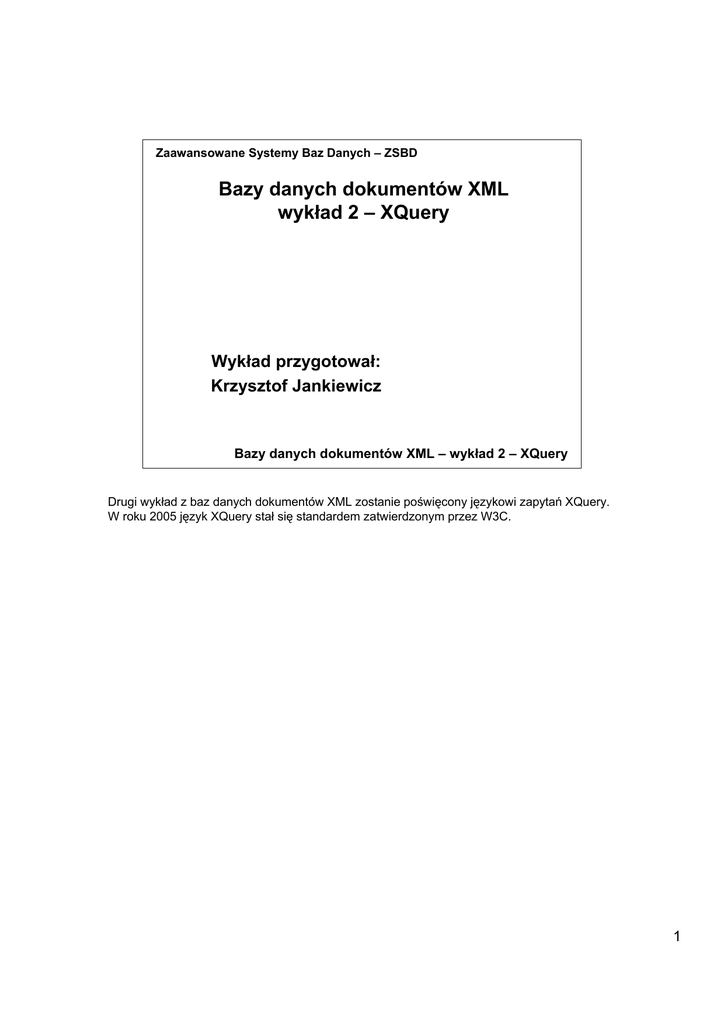 Drugi wykład z baz danych dokumentów XML zostanie poświęcony językowi zapytań XQuery.