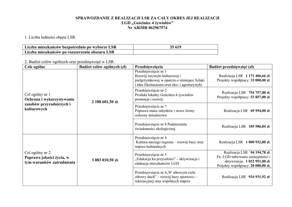 SPRAWOZDANIE Z REALIZACJI LSR ZA CAŁY OKRES JEJ REALIZACJI LGD „Gościniec 4 żywiołów” Nr ARiMR 062967574 1. Liczba ludności objęta LSR: Liczba mieszkańców bezpośrednio po wyborze LSR Liczba mieszkańców po rozszerzeniu obszaru LSR 2. Budżet celów ogólnych oraz przedsięwzięć w LSR: Cele ogólne Budżet celów ogólnych (zł) Cel ogólny nr 1 Ochrona i wykorzystywanie zasobów przyrodniczych i kulturowych 2 188 601,50 zł. 35 619 Przedsięwzięcia Realizacja LSR 1 171 406,66 zł. Projekty współpracy: 33 000,00 zł. Przedsięwzięcie nr 2 Produkt lokalny Gościńca 4 żywiołów promocja i rozwój Realizacja LSR 754 757,00 zł. Projekty współpracy: 53 857,00 zł. Przedsięwzięcie nr 7 Poprawa stanu zabytków i nowe formy ochrony dziedzictwa Przedsięwzięcie nr 8 Podniesienie świadomości ekologicznej Przedsięwzięcie nr 4 Kultura naszego regionu – rozwój bazy oraz imprez kulturalnych Cel ogólny nr 2 Poprawa jakości życia, w tym warunków zatrudnienia 3 083 010,50 zł. Budżet przedsięwzięć (zł) Przedsięwzięcie nr 1 Rozwój turystyki kulturowej i pielgrzymkowej w oparciu o istniejące Szlaki i idee Ekomuzeum oraz eko- i agroturystyki Przedsięwzięcie nr 5 „Edukacja ku przyszłości” – aktywizacja i edukacja mieszkańców LGD Przedsięwzięcie nr 6„W zdrowym ciele zdrowy duch” – rozwój bazy sportowo – rekreacyjnej oraz wspólnych imprez Realizacja LSR 69 994,00 zł. Realizacja LSR 105 586,84 zł. Realizacja LSR 1 000 932,80 zł. Realizacja LSR 94 194,78 zł. Fn. LGD nabywanie umiejętności i aktywizacja 1 032 951,00 zł. Projekty współpracy: 20 000,00 zł. Realizacja LSR 934 931,92 zł. 3. Budżet realizacji celów ogólnych oraz przedsięwzięć w okresie realizacji LSR: Cele ogólne Cel ogólny nr 1 Ochrona i wykorzystywanie zasobów przyrodniczych i kulturowych Cel ogólny nr 2 Poprawa jakości życia, w tym warunków zatrudnienia Realizacja celów ogólnych (zł) Wdrażanie LSR: 1 580 205,68 zł. Projekty współpracy: 98 975,21 zł. RAZEM: 1 679 180,89 zł. Przedsięwzięcia Przedsięwzięcie nr 1 Rozwój turystyki kulturowej i pielgrzymkowej w oparciu o istniejące Szlaki i idee Ekomuzeum oraz eko- i agrotyrystyki Przedsięwzięcie nr 2 Produkt lokalny Gościńca 4 żywiołów promocja i rozwój Razem wdrażanie LSR: 730 832,50 zł. Projekty współpracy: 45 637,66 zł. Razem wdrażanie LSR: 456 313,04 zł. Projekty współpracy: 53 337,55 zł. Przedsięwzięcie nr 7 Poprawa stanu zabytków i nowe formy ochrony dziedzictwa Przedsięwzięcie nr 8 Podniesienie świadomości ekologicznej Przedsięwzięcie nr 4 Kultura naszego regionu – rozwój bazy oraz imprez kulturalnych Wdrażanie LSR: 1 806 450,52 zł. Przedsięwzięcie nr 5 Projekty współpracy: 0,00 zł. „Edukacja ku przyszłości” – Fn. LGD nabywanie umiejętności i aktywizacja i edukacja mieszkańców aktywizacja: 1 032 831,95 zł. LGD RAZEM: 2 839 282,47 zł. Realizacja przedsięwzięć (zł) Przedsięwzięcie nr 6 „W zdrowym ciele zdrowy duch” – rozwój bazy sportowo – rekreacyjnej oraz wspólnych imprez Razem wdrażanie LSR: 272 473,66 zł. Razem wdrażanie LSR: 120 586,48 zł. Razem wdrażanie LSR: 676 731,93 zł. Razem wdrażanie LSR 81 272,06 zł. Fn. LGD nabywanie umiejętności i aktywizacja: 1 032 831,95 zł. Projekty współpracy: 0,00 zł. Razem wdrażanie LSR: 1 048 446,53 zł. 4. Realizacja projektów współpracy w okresie realizacji LSR: 2012 2014 2013 2014 Znak sprawy Akronim projektu współpracy Tytuł projektu współpracy Pomoc przyznana LGD „Smaki Łączą Regiony – Festiwal Smaków” „Smakowity Międzyregionalny RWSMAK Alternatywny Konkurs – Festiwal VII.7161.1.12013.KW Smaków II” „Wioski tematyczne pomysłem na UM06-6931WTPnIPTW innowacyjne produkty turystyki UM0600004/13 wiejskiej” UM06-6931„Tradycyjna kuchnia polska i TKPiL UM0600027/13 irlandzka” UM06-6931UM0600022/11 5. Innowacyjność LSR: Liczba wniosków o przyznanie pomocy w ramach działania 413 Wdrażanie LSR, wybranych przez LGD: a) w tym liczba innowacyjnych operacji w ramach wniosków o przyznanie pomocy w ramach działania 413 Wdrażanie LSR, wybranych przez LGD b) w tym liczba zintegrowanych operacji w ramach wniosków o przyznanie pomocy w ramach działania 413 Wdrażanie LSR, wybranych przez LGD SLRfs Pomoc wypłacona LGD 17 950,00 zł. 11 536,33 zl. 8 060,00 zł. 8 060,00 zł. 45 637,70 zł. 45 637,66 zł. 33 773,21 zł. 33 741,22 zł. 132 Rodzaje innowacji - 107 - 46 Rodzaje zintegrowania Rok podmioty x Liczba wniosków w ramach danego rodzaju innowacji Liczba wniosków w ramach danego rodzaju zintegrowania - Przykład - - - - Przykład 19 Np. projekt zakłada integrację podmiotów KGW, Zespołu ludowego, strażaków Np. wykorzystanie w projekcie zasobów LGD – Questów opracowanych dla 4 gmin.Np. Integracja celów LGD Gościniec 4 żywiołów rozwój bazy turystycznej oraz promocja i rozwój produktów lokalnych zasoby x 64 x 52 cele 6. Zatrudnienie w LGD w okresie realizacji LSR: Poziom zatrudnienia na początku realizacji LSR (liczba osób zatrudnionych na podstawie umowy o pracę) Poziom zatrudnienia na koniec realizacji LSR (liczba osób zatrudnionych na podstawie umowy o pracę) Maksymalny poziom zatrudnienia w okresie: Minimalny poziom zatrudnienia w okresie: 3 1 3 od. 16.09.2009 r. do 31.12.2014 r. 1 od. 01.01.2015 r. do nadal 7. Działalność LGD w ramach KSOW w okresie realizacji LSR: LGD „Gościniec 4 żywiołów” jest członkiem KSOW, uczestniczy w działaniach proponowanych przez KSOW. Działania realizowane w okresie wdrażania LSR: 1. 2. 3. 4. 5. 6. Zgłoszenie propozycji przez LGD wyjazdu zagranicznego wraz z innymi partnerami z Małopolski. Prowadzenie projektu dla małopolskiej sieci „Wzmocnienie procesów integracji sektora pozarządowego w Małopolsce w 2009 roku” Współorganizację z KSOW spotkania z przedstawicielami sieci z polski 8 maj 2009 r. – Debrzno. Dostarczenie informacji do katalogu promocyjnego o d