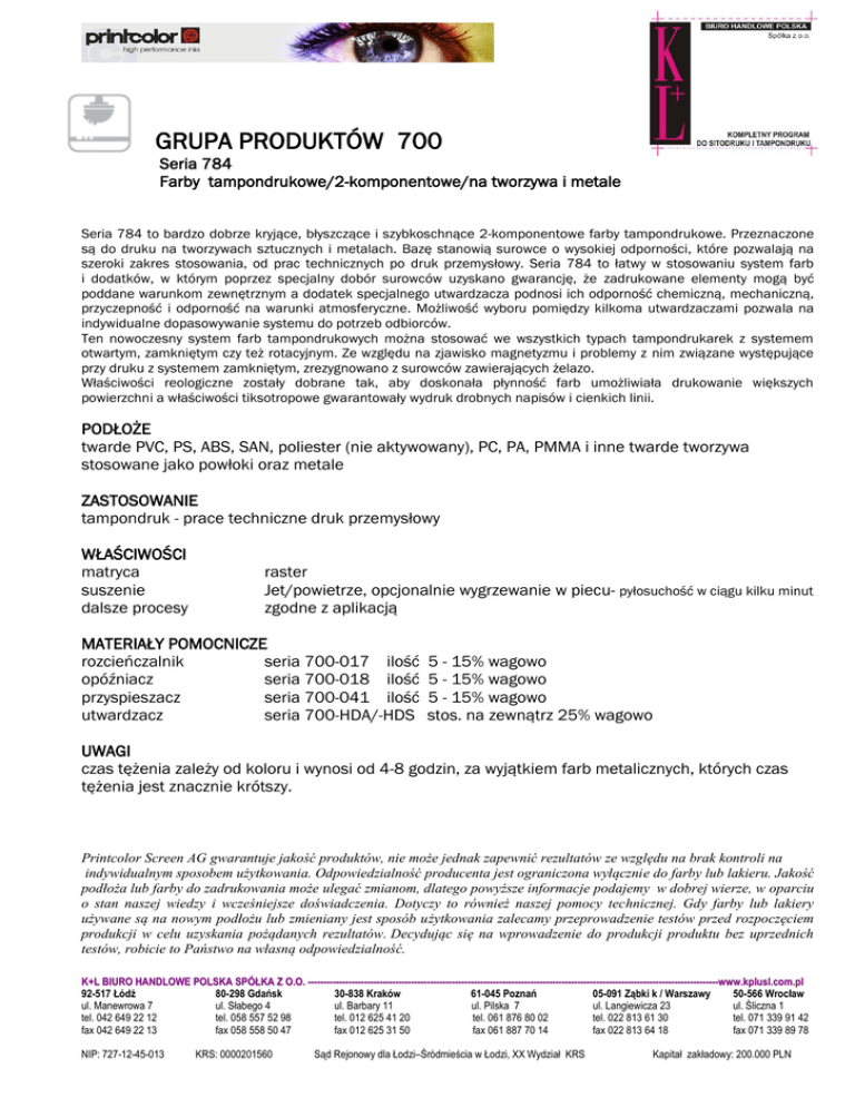 GRUPA PRODUKTÓW 700 Seria 784 Farby tampondrukowe/2-komponentowe/na tworzywa i metale Seria 784 to bardzo dobrze kryjące, błyszczące i szybkoschnące 2-komponentowe farby tampondrukowe. Przeznaczone są do druku na tworzywach sztucznych i metalach. Bazę stanowią surowce o wysokiej odporności, które pozwalają na szeroki zakres stosowania, od prac technicznych po druk przemysłowy. Seria 784 to łatwy w stosowaniu system farb i dodatków, w którym poprzez specjalny dobór surowców uzyskano gwarancję, że zadrukowane elementy mogą być poddane warunkom zewnętrznym a dodatek specjalnego utwardzacza podnosi ich odporność chemiczną, mechaniczną, przyczepność i odporność na warunki atmosferyczne. Możliwość wyboru pomiędzy kilkoma utwardzaczami pozwala na indywidualne dopasowywanie systemu do potrzeb odbiorców. Ten nowoczesny system farb tampondrukowych można stosować we wszystkich typach tampondrukarek z systemem otwartym, zamkniętym czy też rotacyjnym. Ze względu na zjawisko magnetyzmu i problemy z nim związane występujące przy druku z systemem zamkniętym, zrezygnowano z surowców zawierających żelazo. Właściwości reologiczne zostały dobrane tak, aby doskonała płynność farb umożliwiała drukowanie większych powierzchni a właściwości tiksotropowe gwarantowały wydruk drobnych napisów i cienkich linii. PODŁOŻE twarde PVC, PS, ABS, SAN, poliester (nie aktywowany), PC, PA, PMMA i inne twarde tworzywa stosowane jako powłoki oraz metale ZASTOSOWANIE tampondruk - prace techniczne druk przemysłowy WŁAŚCIWOŚCI matryca suszenie dalsze procesy raster Jet/powietrze, opcjonalnie wygrzewanie w piecu- pyłosuchość w ciągu kilku minut zgodne z aplikacją MATERIAŁY POMOCNICZE rozcieńczalnik seria 700-017 ilość opóźniacz seria 700-018 ilość przyspieszacz seria 700-041 ilość utwardzacz seria 700-HDA/-HDS 5 - 15% wagowo 5 - 15% wagowo 5 - 15% wagowo stos. na zewnątrz 25% wagowo UWAGI czas tężenia zależy od koloru i wynosi od 4-8 godzin, za wyjątkiem farb metalicznych, których czas tężenia jest znacznie krótszy. Printcolor Screen AG gwarantuje jakość produktów, nie może jednak zapewnić rezultatów ze względu na brak kontroli na indywidualnym sposobem użytkowania. Odpowiedzialność producenta jest ograniczona wyłącznie do farby lub lakieru. Jakość podłoża lub farby do zadrukowania może ulegać zmianom, dlatego powyższe informacje podajemy w dobrej wierze, w oparciu o stan naszej wiedzy i wcześniejsze doświadczenia. Dotyczy to również naszej pomocy technicznej. Gdy farby lub lakiery używane są na nowym podłożu lub zmieniany jest sposób użytkowania zalecamy przeprowadzenie testów przed rozpoczęciem produkcji w celu uzyskania pożądanych rezultatów. Decydując się na wprowadzenie do produkcji produktu bez uprzednich testów, robicie to Państwo na własną odpowiedzialność. K+L BIURO HANDLOWE POLSKA SPÓŁKA Z O.O. -----------------------------------------------------------------------------------------------------------------------------------www.kplusl.com.pl 92-517 Łódź 80-298 Gdańsk 30-838 Kraków 61-045 Poznań 05-091 Ząbki k / Warszawy 50-566 Wrocław ul. Manewrowa 7 ul. Słabego 4 ul. Barbary 11 ul. Pilska 7 ul. Langiewicza 23 ul. Śliczna 1 tel. 042 649 22 12 tel. 058 557 52 98 tel. 012 625 41 20 tel. 061 876 80 02 tel. 022 813 61 30 tel. 071 339 91 42 fax 042 649 22 13 fax 058 558 50 47 fax 012 625 31 50 fax 061 887 70 14 fax 022 813 64 18 fax 071 339 89 78 NIP: 727-12-45-013 KRS: 0000201560 Sąd Rejonowy dla Łodzi–Śródmieścia w Łodzi, XX Wydział KRS Kapitał zakładowy: 200.000 PLN