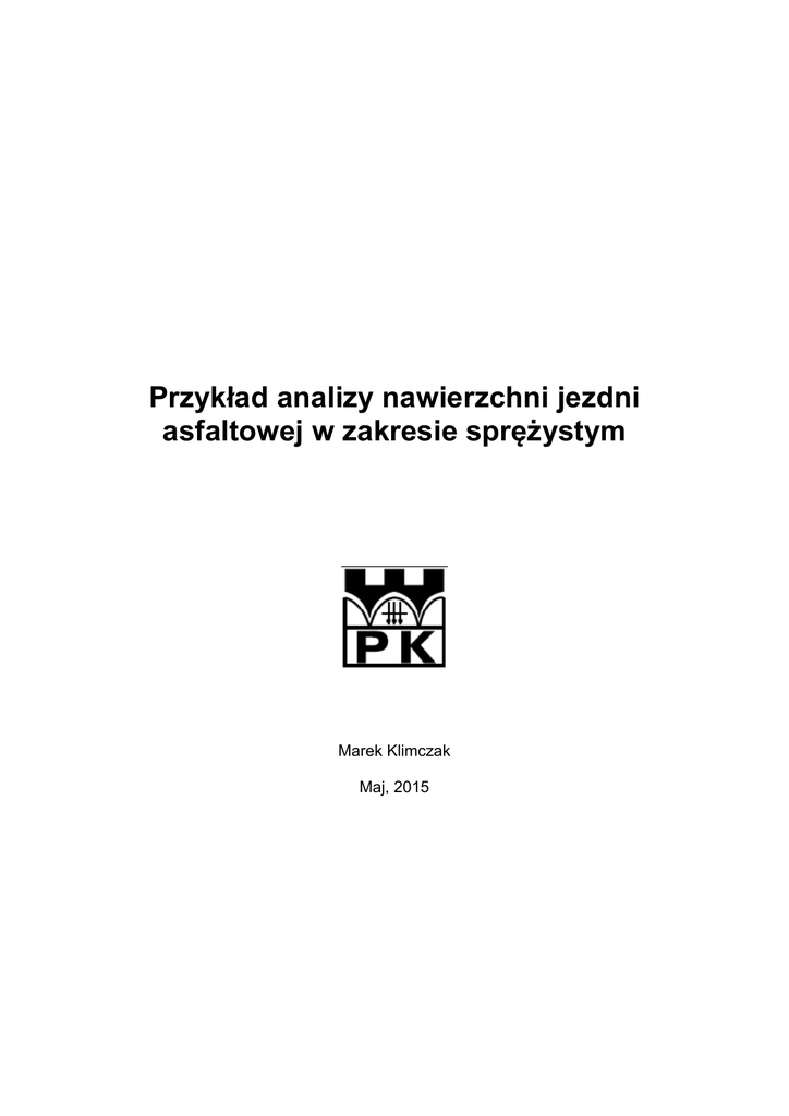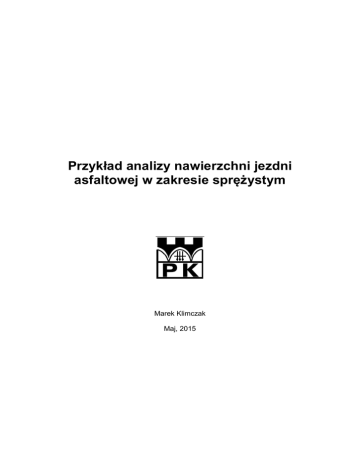 Przykład analizy nawierzchni jezdni asfaltowej w zakresie sprężystym Marek Klimczak Maj, 2015 I. Analiza podatnej konstrukcji nawierzchni jezdni Celem ćwiczenia jest wykonanie numerycznej analizy typowej podatnej konstrukcji nawierzchni jezdni za pomocą pakietu ABAQUS, aby następnie na podstawie uzyskanych wyników oszacować jej trwałość wg kryteriów zmęczeniowych Instytutu Asfaltowego. Wejściowymi wartościami do analizy zmęczeniowej będzie rozkład odkształceń w konstrukcji. W wyniku obliczeń określona zostanie trwałość konstrukcji nawierzchni określona jako dopuszczalna liczba obciążeń osią 100kN na pas obliczeniowy. Analizie poddana zostanie typowa konstrukcja nawierzchni jezdni przyjęta na podstawie „Katalogu typowych konstrukcji nawierzchni podatnych i półsztywnych” (https://www.gddkia.gov.pl/userfiles/articles/p/prace-naukowo-badawcze-po-roku2_3432/Weryfikacja%20KataloguTNPiP_Etap4_final_11%2003%202013.pdf), przedstawiona schematycznie na poniższym rysunku. ZAŁOŻENIA Przyjęte założenia projektowe: - układ warstw oraz dane materiałowe przyjęte zostały wg. „Katalogu…”, - obciążenie stanowi oś obliczeniowa 100kN. Intensywność obciążenia przyjęto wg „Katalogu..” równą 850kN/m2. Przyjęte założenia do modelowania: - zadanie zostanie rozwiązane w płaskim stanie odkształcenia (PSO) ze względu na ograniczenia studenckiej wersji programu Abaqus (max 1000 węzłów) – w przypadku analizy 3D uniemożliwiałoby to wygenerowanie odpowiednio gęstej siatki ES, - zachowanie konstrukcji analizowane jest w zakresie liniowo sprężystym, 2 - w obliczeniach wykorzystana zostanie symetria obciążenia oraz geometrii, tj. wykonamy obliczenia dla pojedynczego pasa ruchu, - założony jest równomierny rozkład obciążenia, - cały obszar zamodelowano jako prostokąt, w obrębie którego dokonano wyodrębnienia partycji charakteryzujących się innymi stałymi materiałowymi – podejście to eliminuje konieczność modelowania kontaktu na granicy warstw, - dolna i prawa krawędź obszaru modelowane są jako w pełni utwierdzone, natomiast na lewej krawędzi odebrano możliwość przemieszczenia w kierunku prostopadłym do osi symetrii. IMPLEMENTACJA NUMERYCZNA W PROGRAMIE ABAQUS DEFINICJA GEOMETRII W niniejszym przykładzie przedstawione zostały elementy procesu modelowania, które nie pojawiły się w poprzednich instrukcjach do zajęć. Na tym etapie wymagana jest już pełna znajomość poleceń w nich wykorzystywanych. 1. W okienku Create part tworzymy część o nazwie „nawierzchnia” pozostałe ustawienia wprowadzamy jak dla tarczy (manual p.t. „Wprowadzenie do programu ABAQUS oraz przykład rozwiązania tarczy”). znajdującej 2. W module Part klikamy na ikonie Create Lines: Rectangle się u góry paska narzędziowego, aby utworzyć prostokąt o wymiarach 5m x 2m. Współrzędne naprzeciwległych narożników prostokąta najlepiej przyjąć równe odpowiednio 0,0 i 5,2 – znacząco usprawni to wprowadzanie współrzędnych punktów określających wierzchołki przekrojów warstw nawierzchni. 3. Kliknąć na przycisk Done lub wcisnąć kółeczko myszy, aby zaakceptować wprowadzoną geometrię. 4. Kliknąć na ikonce Create Datum Points: Enter Coordinates ( ) i wprowadzić współrzędne wspomnianych powyżej punktów charakterystycznych. Oznaczone będą one żółtymi kółeczkami jak na rysunku obok. 5. Kliknąć na ikonce Partition Face: Sketch ( ) i utworzyć partycje określające poszczególne warstwy oraz ośrodek gruntowy. Należy wskazać obszar, który chcemy podzielić na podobszary, a następnie za pomocą polecenia Create Lines: Connected ( ) narysować granice pojedynczej warstwy i zaakceptować – wystarczy wykreślić granice, nie należy obrysowywać całej warstwy. Czynności te należy powtórzyć dla każdej warstwy. Efekt powinien wyglądać jak na przedstawionym poniżej rysunku. 3 6. Ze względu na to, iż obciążenie będzie przyłożone jedynie na części górnej powierzchni warstwy ścieralnej, należy utworzyć 4 dodatkowe Datum Points, na podstawie których wykonana zostanie partycja górnego brzegu tej warstwy. Współrzędne punktów należy określić na podstawie rysunku przedstawiającego analizowany obszar – obciążenie przyjąć jako symetryczne względem osi przedstawionego pasa drogi. 7. Kliknąć na ikonce Partition Edge: Select Midpoint/Datum Point ( aby dokonać podziału górnej krawędzi warstwy ścieralnej. ), 8. Po akceptacji utworzonego szkicu mamy określony obszar, którego poszczególne podobszary są w pewien sposób niezależne – pomimo, iż tworzą w dalszym ciągu jedną część (Part), to jednak możemy przypisać im różne przekroje (Sections). W porównaniu do poprzednio analizowanych przykładów 2D ten wymaga dodatkowo utworzenia większej ilości materiałów w zakładce Materials w Model Tree. Zakładamy dla każdego z materiałów model liniowo sprężysty wprowadzając odpowiednie stałe materiałowe dla każdego z ośrodków. 4 9. Trzeba dodatkowo utworzyć (odpowiadającą liczbie zdefiniowanych materiałów) liczbę przekrojów w zakładce Sections w Model Tree każdorazowo wybierając odpowiedni materiał, kategorię (Category: Solid) oraz określając wartość parametru Plane strain/stress thickness równą 1.0. 10. Następnie przypisać musimy każdej partycji odpowiedni przekrój. Klikając na ikonę Section Assignment w Model Tree wskazujemy poszczególne partycje oraz odpowiednie przekroje, które im przypisujemy. WARUNKI BRZEGOWE Kolejne etapy tworzenia modelu obliczeniowego przebiegają podobnie jak dla analizowanych wcześniej zagadnień. Komentarza wymaga jedynie określenie kinematycznych warunków brzegowych. Zakładamy, że krawędź dolna oraz krawędź prawa są w pełni utwierdzone, natomiast krawędź lewa (ze względu na przyjętą symetrię zadania) wymaga zablokowania możliwości przesuwu w kierunku prostopadłym do osi 