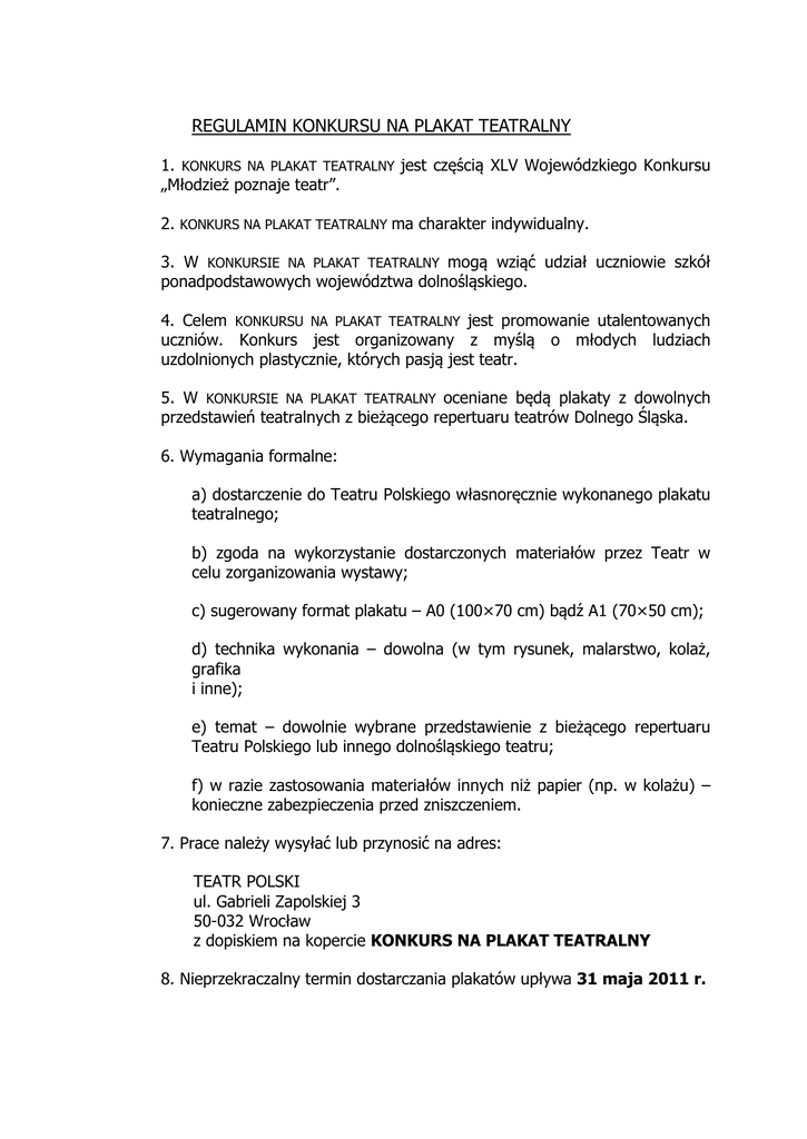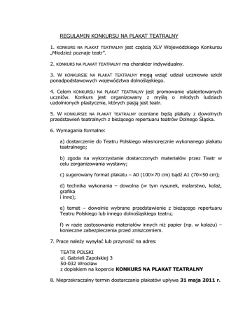 REGULAMIN KONKURSU NA PLAKAT TEATRALNY 1. KONKURS NA PLAKAT TEATRALNY jest częścią XLV Wojewódzkiego Konkursu „Młodzież poznaje teatr”. 2. KONKURS NA PLAKAT TEATRALNY ma charakter indywidualny. 3. W KONKURSIE NA PLAKAT TEATRALNY mogą wziąć udział uczniowie szkół ponadpodstawowych województwa dolnośląskiego. 4. Celem KONKURSU NA PLAKAT TEATRALNY jest promowanie utalentowanych uczniów. Konkurs jest organizowany z myślą o młodych ludziach uzdolnionych plastycznie, których pasją jest teatr. 5. W KONKURSIE NA PLAKAT TEATRALNY oceniane będą plakaty z dowolnych przedstawień teatralnych z bieżącego repertuaru teatrów Dolnego Śląska. 6. Wymagania formalne: a) dostarczenie do Teatru Polskiego własnoręcznie wykonanego plakatu teatralnego; b) zgoda na wykorzystanie dostarczonych materiałów przez Teatr w celu zorganizowania wystawy; c) sugerowany format plakatu – A0 (100×70 cm) bądź A1 (70×50 cm); d) technika wykonania – dowolna (w tym rysunek, malarstwo, kolaż, grafika i inne); e) temat – dowolnie wybrane przedstawienie z bieżącego repertuaru Teatru Polskiego lub innego dolnośląskiego teatru; f) w razie zastosowania materiałów innych niż papier (np. w kolażu) – konieczne zabezpieczenia przed zniszczeniem. 7. Prace należy wysyłać lub przynosić na adres: TEATR POLSKI ul. Gabrieli Zapolskiej 3 50-032 Wrocław z dopiskiem na kopercie KONKURS NA PLAKAT TEATRALNY 8. Nieprzekraczalny termin dostarczania plakatów upływa 31 maja 2011 r. 9. Teatr Polski nie ponosi odpowiedzialności za prace uszkodzone w czasie transportu lub źle przygotowane do prezentacji. 10. Dla zwycięzców w KONKURSIE NA PLAKAT TEATRALNY przewidziane są nagrody indywidualne. Laureaci tradycyjnie otrzymają zniżki bądź darmowe abonamenty na spektakle Teatru Polskiego w bieżącym lub kolejnym sezonie oraz cenne nagrody rzeczowe. Dyrekcja zastrzega sobie prawo do zwiększenia puli nagród oraz zmian w regulaminie.