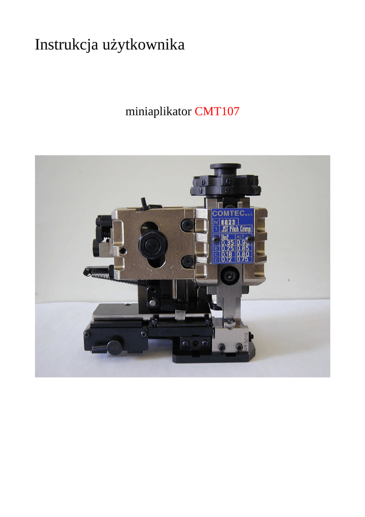 Instrukcja użytkownika miniaplikator CMT107 1. Spis treści: - nastawianie - warunki gwarancji - lista elementów - lista elementów-schemat - specyfikacja techniczna 2. Ostrzeżenie Przed zamontowaniem miniaplikatora konieczne jest sprawdzenie, czy zagniatarka została zaprojektowana zgodnie z obowiązującymi normami dotyczącymi bezpieczeństwa. Należy codziennie sprawdzić wszystkie urządzenia zabezpieczające i osłony zagniatarki w celu usunięcia jakichkolwiek pozostałości procesu produkcyjnego. Miniaplikator powinien być czyszczony codziennie, a jego elementy ruchome smarowane olejem lub smarem o niskiej gęstości. Nie należy smarować ostrzy aplikatora ani stempli – może spowodować to przyklejanie się odpadków produkcyjnych. Okresowe wymieniać części zużywalne (stemple, ostrza etc) 3. Gwarancja Miniaplikator CMT107 podlega gwarancji na 12 (dwanaście) miesięcy od daty dostarczenia, pod warunkiem, że jest on użytkowany prawidłowo, przez oryginalnego nabywcę w oryginalnym miejscu instalacji. W okresie ważności gwarancji wymiana części, które nie mogą być użytkowane ze względu na defekty materiałowe zostają wymienione na zasadzie rękojmi. Gwarancja traci swoją ważność, jeżeli produkt został zmodyfikowany, naprawiony lub zdemontowany, nawet częściowo, bez uprzedniego uzyskania pisemnej zgody od COMTEC S. R. L. Podczas okresu gwarancji wszystkie części uznane za wadliwe zostaną wymienione bez dodatkowych opłat. Gwarancja nie obejmuje instalacji urządzenia. Gwarancja nie obejmuje części, które zużywają się w wyniku prawidłowego użytkowania (ostrza, stemple etc). Gwarancja nie ma zastosowania, a dostawca nie ponosi odpowiedzialności za żadne defekty, błędy, zaniechania i usterki jeśli miniaplikator był użytkowany nieprawidłowo lub został zmodyfikowany, zdemontowany lub uszkodzony przez osoby trzecie lub był użytkowany w nieprawidłowych warunkach lub pracował poza zakresem określonych przez producenta możliwości. 4. Instrukcje ogólne Ta instrukcja użytkownika musi być uznawana za integralną część miniaplikatora. Przed rozpoczęciem użytkowania miniaplikatora oraz zawsze przed dokonaniem jakichkolwiek prac konserwacyjnych należy zapoznać się z instrukcją. W przypadku jakichkolwiek wątpliwości lub problemów nie opisanych w instrukcji przed podjęciem samodzielnych kroków prosimy o skontaktowanie się z serwisem technicznym. Uwaga: Producent zastrzega sobie prawo do dokonania dowolnych zmian nastaw koniecznych do polepszenia produktu, bez konieczności wprowadzania zmian produkcyjnych lub aktualizowania starszych instrukcji. Z powodu regularnych ulepszeń implementowanych w naszych produktach możliwe są pewne rozbieżności pomiędzy treścią instrukcji a miniaplikatorem znajdującym się w posiadaniu użytkownika. Nie uprawnia to do żadnej rekompensaty. 5. Lista elementów N. 1 2 3 4 5 6 7 8 9 10 11 12 NAZWA FRAME SCREW M5X45 (PCS.6) CREW M3X6 (PCS.2) COUNTER COVER COUNTER STRIPPER FEED ROLLER FEED PIN SCREW M4X10 SCREW M3X6 (PCS.2) SCREW M3X10 (PCS.2) FRONT GUIDE NUMER IDENTYFIKACYJNY. 7198 6118 6117 6116 6115 7912 543 6104 6159 6117 6160 1030 13 14 15 16 17 18 19 20 21 22 23 24 25 26 27 28 29 30 31 32 33 34 35 36 37 38 39 40 41 42 43 44 45 46 47 48 49 50 51 52 53 54 55 56 57 58 59 60 61 62 63 64 65 66 67 68 69 70 71 72 73 74 75 76 77 78 REAR GUIDE ADJUSTMENT BLOCK PLATE TERMINAL GUIDE UIDE PLATE SUPPORT CLUTCH BLOCK PLATE BASE SCREW M6X16 (PCS.2) SCREW M5X10 (PCS.2) SCREW M5X12 (PCS.2) CREW M5X45 PLATE SCREW M3X6 (PCS.2) SNAP RING D.6 SCREW M3X6 (PCS.2) CLUTCH LEVER CLUTCH PLATE TERMINAL CLUTCH SPRING CLUTCH (PCS.2) FEEDING FINGER FINGER SUPPORT COVER SCREW M5X12 (PCS.2) SCREW M6X20 DADO M12 NUT M12 WASHER FEEDING COVER NUT M4 SCREW M4X30 SNAP RING D.4 SCREW M4X10 SPRING BRACKET THREADED BUSH SPING FINGER SPING FINGER PIN FOR LEVER FEED FEED LEVER SPING SCREW SPRING FEED SCREW M4X20 (PCS.2) BRACKET FEED SMALL BLOCK FEED ADJUSTMENT SCREW FEED LEVER SCREW M4X8 FEED EQUALIZER PIN 5X12 RAM WIRE ADJUSTMENT DISC INSULATION ADJ. DISC SPACER FOR ADJ. DISC MAGNET BRASS RING SCREW M6X6 RAM INSULATION SMALL BLOCK WIRE CRIMP DIE ANVIL SUPPORT SCREW M5X10 (PCS.2) WIRE ANVIL INSULATION ANVIL SCREW M4X16 NUT M12 SCREW M5X10 (PCS.2) SPRING DIE CUT OFF SCREW M3X25 (PCS.2) FRONT DIE CUT OFF CM769/3 6264 CM5838/9 6254 6256 7915 6127 6097 6112 6118 6253 6117 6266 6117 6257 6263 6252 495 1034 6180 7199 6112 6234 6111 6110 7200 6184 6183 6105 6159 6261 6108 6122 6267 6103 6071 6067 6068 6195 6091 6265 6079 6070 6133 6078 6068 8216 CM5058/D=8,05 6082 6086 7193 0002 6093 6169 6121 CM9051 6097 CM9060 CM9061 6191 6184 6097 CM6999 6192 CM7558 *** *** *** *** 79 80 81 82 83 84 85 86 87 88 89 90 BLOCK DIE CUT OFF SCREW M8X20 FRONT PUNCH INSULATION CRIMP RING INSULATION CRIP DIE CRIMPER SPACER INSULATION ADJ. SCREW SCREW M4X8 FEED CAMME BALL (PCS.2) SCREW M4X6 (PCS.2) SPRING CAMME (PCS.2) CM2082 6190 CM5988-5989 CM5044/3,2 CM5173 CM5051/0,5 6119 6089 6262 6083 6085 6084 *** *** *** Części zużywalne, wskazane jest posiadanie większej ich liczby. 6. Specyfikacja techniczna Model Numer seryjny Posuw Wysokość uniesienia zagniatarki Wykonawca Numer części CMT107 7731 40mm 135.79mm LEAR 26198