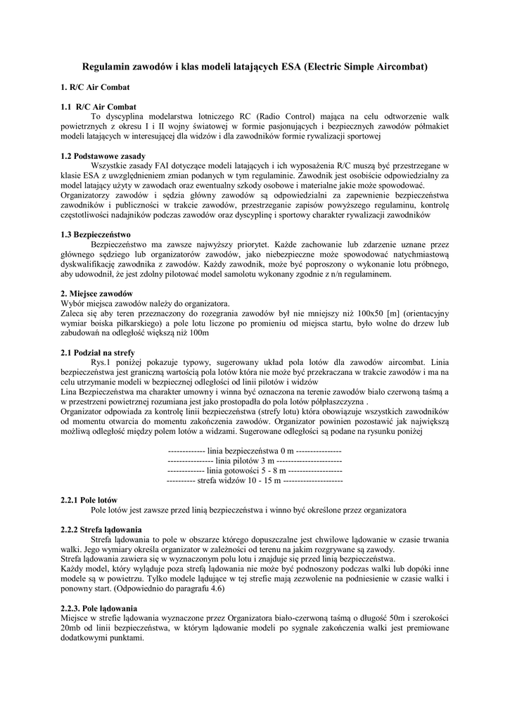 Regulamin zawodów i klas modeli latających ESA (Electric Simple Aircombat) 1. R/C Air Combat 1.1 R/C Air Combat To dyscyplina modelarstwa lotniczego RC (Radio Control) mająca na celu odtworzenie walk powietrznych z okresu I i II wojny światowej w formie pasjonujących i bezpiecznych zawodów półmakiet modeli latających w interesującej dla widzów i dla zawodników formie rywalizacji sportowej 1.2 Podstawowe zasady Wszystkie zasady FAI dotyczące modeli latających i ich wyposażenia R/C muszą być przestrzegane w klasie ESA z uwzględnieniem zmian podanych w tym regulaminie. Zawodnik jest osobiście odpowiedzialny za model latający użyty w zawodach oraz ewentualny szkody osobowe i materialne jakie może spowodować. Organizatorzy zawodów i sędzia główny zawodów są odpowiedzialni za zapewnienie bezpieczeństwa zawodników i publiczności w trakcie zawodów, przestrzeganie zapisów powyższego regulaminu, kontrolę częstotliwości nadajników podczas zawodów oraz dyscyplinę i sportowy charakter rywalizacji zawodników 1.3 Bezpieczeństwo Bezpieczeństwo ma zawsze najwyższy priorytet. Każde zachowanie lub zdarzenie uznane przez głównego sędziego lub organizatorów zawodów, jako niebezpieczne może spowodować natychmiastową dyskwalifikację zawodnika z zawodów. Każdy zawodnik, może być poproszony o wykonanie lotu próbnego, aby udowodnił, że jest zdolny pilotować model samolotu wykonany zgodnie z n/n regulaminem. 2. Miejsce zawodów Wybór miejsca zawodów należy do organizatora. Zaleca się aby teren przeznaczony do rozegrania zawodów był nie mniejszy niż 100x50 [m] (orientacyjny wymiar boiska piłkarskiego) a pole lotu liczone po promieniu od miejsca startu, było wolne do drzew lub zabudowań na odległość większą niż 100m 2.1 Podział na strefy Rys.1 poniżej pokazuje typowy, sugerowany układ pola lotów dla zawodów aircombat. Linia bezpieczeństwa jest graniczną wartością pola lotów która nie może być przekraczana w trakcie zawodów i ma na celu utrzymanie modeli w bezpiecznej odległości od linii pilotów i widzów Lina Bezpieczeństwa ma charakter umowny i winna być oznaczona na terenie zawodów biało czerwoną taśmą a w przestrzeni powietrznej rozumiana jest jako prostopadła do pola lotów półpłaszczyzna . Organizator odpowiada za kontrolę linii bezpieczeństwa (strefy lotu) która obowiązuje wszystkich zawodników od momentu otwarcia do momentu zakończenia zawodów. Organizator powinien pozostawić jak największą możliwą odległość między polem lotów a widzami. Sugerowane odległości są podane na rysunku poniżej ------------- linia bezpieczeństwa 0 m ------------------------------- linia pilotów 3 m ----------------------------------- linia gotowości 5 - 8 m ---------------------------- strefa widzów 10 - 15 m --------------------2.2.1 Pole lotów Pole lotów jest zawsze przed linią bezpieczeństwa i winno być określone przez organizatora 2.2.2 Strefa lądowania Strefa lądowania to pole w obszarze którego dopuszczalne jest chwilowe lądowanie w czasie trwania walki. Jego wymiary określa organizator w zależności od terenu na jakim rozgrywane są zawody. Strefa lądowania zawiera się w wyznaczonym polu lotu i znajduje się przed linią bezpieczeństwa. Każdy model, który wyląduje poza strefą lądowania nie może być podnoszony podczas walki lub dopóki inne modele są w powietrzu. Tylko modele lądujące w tej strefie mają zezwolenie na podniesienie w czasie walki i ponowny start. (Odpowiednio do paragrafu 4.6) 2.2.3. Pole lądowania Miejsce w strefie lądowania wyznaczone przez Organizatora biało-czerwoną taśmą o długość 50m i szerokości 20mb od linii bezpieczeństwa, w którym lądowanie modeli po sygnale zakończenia walki jest premiowane dodatkowymi punktami. 2.2.4. Pole celów naziemnych – słupki W klasie modeli WWI przewiduje się rozlokowanie 6 słupków styropianowych o wymiarach 3x3x100cm symulujących cele naziemne. W walce modele mogą atakować słupki co premiowane jest dodatkowymi punktami. Słupki powinny być tak rozlokowane w polu lądowania aby nie było możliwości poprowadzenia linii prostej przez trzy słupki a odległość między nimi nie była mniejsza niż 10m Ataki na cele naziemne można przeprowadzać jedynie równolegle do linii bezpieczeństwa a kierunek od nalotu ustala sędzia główny zawodów) stosownie do warunków lokalnych i pogodowych. Zabronione są ataki prostopadłe do linii bezpieczeństwa. Zabronione jest atakowanie słupków w trakcie startu, cięcie słupka musi być poprzedzone min. 10 sekundami lotu od chwili startu 2.2.5 Linia bezpieczeństwa Linia bezpieczeństwa biegnie równolegle do linii pilotów w odległości 3 metrów. Model nie może lecieć bliżej pilotów niż wskazuje ta linia. Każdy model, który przekroczy tę linię podlega karze i zasadom dyskwalifikacji. Ten punkt obowiązuje przez cały czas od otwarcia zawodów do oficjalnego zakończenia. Dotyczy to wszystkich lotów ( walki, testowych, pokazowych), wszystkich modeli w każdym przypadku. 2.2.6 linia gotowości + ewentualne Boksy Startowe Boksy startowe powinny zapewniać odległość 3-5 metrów między pilotami. Linia gotowości powinna biec równolegle do linii pilotów w odległości 5-8 metrów. Wszyscy piloci i pomocnicy powinni startować zza tej linii. 2.3 Publiczność Publiczność powinna przebywać w bezpiecznej odległości, przynajmniej nie mniej niż 10m, za linią bezpieczeństwa lub być chroniona przez zabezpieczenia typu siatka. Obszar zabezpieczony przez siatkę jest definiowany, jako obszar zaczynający się przy siatce do odległości równej jej wysokości, tzn.: dla siatki 3m wysokiej, bezpieczny obszar to do 3-go metra za siatką. 2.4 Pierwsza pomoc Na miejscu zawodów powinien być oznaczony punkt pierwszej pomocy. W tym punkcie powinna być apteczka pierwszej pomocy dostępna w każdej chwili w razie wypadku. 3 Modele i Wyposażenie w 