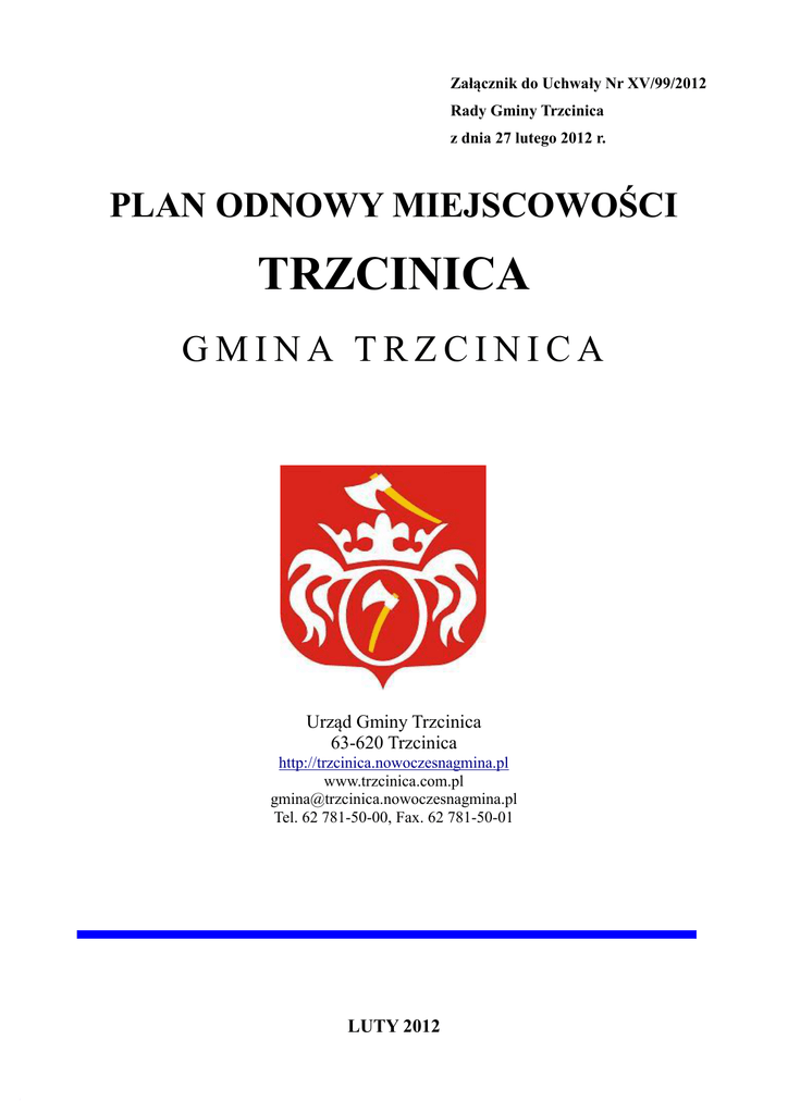 Załącznik do Uchwały Nr XV/99/2012 Rady Gminy Trzcinica z dnia 27 lutego 2012 r. PLAN ODNOWY MIEJSCOWOŚCI TRZCINICA GMINA TRZCINICA Urząd Gminy Trzcinica 63-620 Trzcinica http://trzcinica.nowoczesnagmina.pl www.trzcinica.com.pl [email protected] Tel. 62 781-50-00, Fax. 62 781-50-01 LUTY 2012 Plan Odnowy Miejscowości Trzcinica, Gmina Trzcinica SPIS TREŚCI WSTĘP ...................................................................................................................................... 4 1.OBSZAR I CZAS REALIZACJI PLANU ODNOWY MIEJSCOWOŚCI TRZCINICA .......................................................................................................................................... 7 2. ANALIZA ZASOBÓW MIEJSCOWOŚCI TRZCINICA ............................................... 8 2.1 Położenie ............................................................................................................................ 8 2.2 Środowisko przyrodnicze.................................................................................................... 8 2.2.1 Rzeźba terenu ............................................................................................................. 8 2.2.2 Klimat ......................................................................................................................... 9 2.2.3 Grunty i gleby ............................................................................................................. 9 2.2.4 Wody ......................................................................................................................... 12 2.2.5 Świat roślinny i zwierzęcy........................................................................................ 12 2.2.6 Obszary chronionego krajobrazu .............................................................................. 13 2.2.7 Surowce mineralne ................................................................................................... 13 2.3 Środowisko kulturowe, zabytki ........................................................................................ 13 2.4 Dziedzictwo historyczne .................................................................................................. 14 2.5 Opis i charakterystyka obszaru o szczególnym znaczeniu dla zaspokojenia potrzeb mieszkańców, sprzyjający nawiązywaniu kontaktów społecznych, ze względu na jego położenie oraz cechy funkcjonalno - społeczne ..................................................................... 16 2.6 Gospodarka, rolnictwo ..................................................................................................... 18 2.6.1 Bezrobocie ................................................................................................................ 18 2.6.2 Rolnictwo.................................................................................................................. 21 2.6.3 Przedsiębiorstwa ....................................................................................................... 22 2.7 Infrastruktura techniczna .................................................................................................. 23 2.7.1 Wodociągi i zaopatrzenie w wodę ............................................................................ 23 2.7.2 Kanalizacja i gospodarka ściekowa .......................................................................... 23 2.7.3 Gospodarka odpadami stałymi ................................................................................. 23 2.7.4 Gazyfikacja – zaopatrzenie w gaz ............................................................................ 24 2.7.5 Energetyka – zaopatrzenie w energię elektryczną .................................................... 24 2.7.6 Telefonizacja ............................................................................................................. 24 2.7.7 Drogownictwo i komunikacja .................................................................................. 24 2.7.8 Sytuacja mieszkaniowa............................................................................................. 25 2.8 Infrastruktura społeczna ................................................................................................... 26 2.8.1 Oświata i wychowanie .............................................................................................. 26 2.8.2 Kultura, sport, usługi dla ludności ............................................................................ 27 2.8.3 Pomoc społeczna ...................................................................................................... 29 2.8.4 Ochrona zdrowia....................................................................................................... 41 2.8.5 Bezpieczeństwo publiczne ........................................................................................ 41 2.8.6 Ochrona przeciwpożarowa ....................................................................................... 42 2.9 Ludność ............................................................................................................................ 43 3. OCENA ZASOBÓW MIEJSCOWOŚCI TRZCINICA .................................................. 44 4. DIAGNOZA AKTUALNEJ SYTUACJI TRZCINICY– JACY JESTEŚMY? ............ 46 5. PODSUMOWANIE SYTUACJI ROZWOJOWEJ MIEJSCOWOŚCI TRZCINICA– ANALIZA SWOT ......................................................................................................... 48 2 Plan Odnowy Miejscowości Trzcinica, Gmina Trzcinica 6. WIZJA ROZWOJU WSI – NASZA MIEJSCOWOŚĆ ZA 7 LAT................................. 50 7. WIZJA STANU DOCELOWEGO – JAKA MA BYĆ TRZCINICA ZA KILKA LAT? .... 51 8. PLAN ODNOWY MIEJSCOWOŚCI TRZCINICA – NASZA MAŁA STRATEGIA 53 8.1. Specyfikacja celów rozwojowych ................................................................................... 53 8.2. Hierarchizacja przedsię