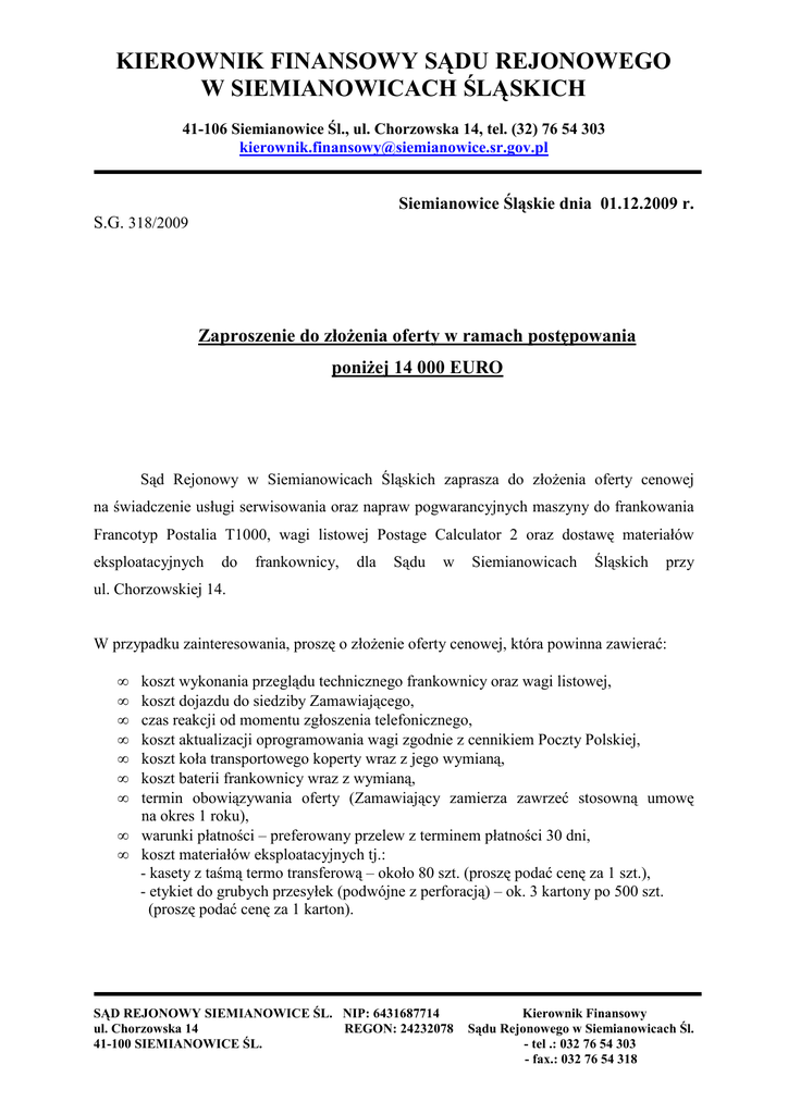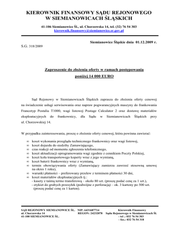 KIEROWNIK FINANSOWY SĄDU REJONOWEGO W SIEMIANOWICACH ŚLĄSKICH 41-106 Siemianowice Śl., ul. Chorzowska 14, tel. (32) 76 54 303 [email protected] Siemianowice Śląskie dnia 01.12.2009 r. S.G. 318/2009 Zaproszenie do złoŜenia oferty w ramach postępowania poniŜej 14 000 EURO Sąd Rejonowy w Siemianowicach Śląskich zaprasza do złoŜenia oferty cenowej na świadczenie usługi serwisowania oraz napraw pogwarancyjnych maszyny do frankowania Francotyp Postalia T1000, wagi listowej Postage Calculator 2 oraz dostawę materiałów eksploatacyjnych do frankownicy, dla Sądu w Siemianowicach Śląskich przy ul. Chorzowskiej 14. W przypadku zainteresowania, proszę o złoŜenie oferty cenowej, która powinna zawierać: • • • • • • • koszt wykonania przeglądu technicznego frankownicy oraz wagi listowej, koszt dojazdu do siedziby Zamawiającego, czas reakcji od momentu zgłoszenia telefonicznego, koszt aktualizacji oprogramowania wagi zgodnie z cennikiem Poczty Polskiej, koszt koła transportowego koperty wraz z jego wymianą, koszt baterii frankownicy wraz z wymianą, termin obowiązywania oferty (Zamawiający zamierza zawrzeć stosowną umowę na okres 1 roku), • warunki płatności – preferowany przelew z terminem płatności 30 dni, • koszt materiałów eksploatacyjnych tj.: - kasety z taśmą termo transferową – około 80 szt. (proszę podać cenę za 1 szt.), - etykiet do grubych przesyłek (podwójne z perforacją) – ok. 3 kartony po 500 szt. (proszę podać cenę za 1 karton). SĄD REJONOWY SIEMIANOWICE ŚL. NIP: 6431687714 ul. Chorzowska 14 REGON: 24232078 41-100 SIEMIANOWICE ŚL. Kierownik Finansowy Sądu Rejonowego w Siemianowicach Śl. - tel .: 032 76 54 303 - fax.: 032 76 54 318 KIEROWNIK FINANSOWY SĄDU REJONOWEGO W SIEMIANOWICACH ŚLĄSKICH 41-106 Siemianowice Śl., ul. Chorzowska 14, tel. (32) 76 54 303 [email protected] Oferty naleŜy składać na adres: Sekcja Gospodarcza Sądu Rejonowego w Siemianowicach Śląskich ul. Chorzowska 14, 41-106 Siemianowice Śląskie, faksem na numer 032 7654318 w godzinach pracy Sądu tj. od 730 do 1530 lub pocztą elektroniczną na adres [email protected] – w terminie do dnia 10 grudnia 2009r. W przypadku przedłoŜenia oferty za pomocą faksu lub poczty elektronicznej, prosimy o przesłanie oryginału drogą pocztową. Z wybranym wykonawcą zostanie podpisana stosowna umowa. W przypadku pytań proszę o kontakt telefoniczny z pracownikiem Sekcji Gospodarczej – tel. 32/7654318. (oryginał podpisał) KIEROWNIK FINANSOWY GRZEGORZ MAKOWSKI Załączniki : 1. Brak Otrzymują: 1. Strona www 2. a/a SĄD REJONOWY SIEMIANOWICE ŚL. NIP: 6431687714 ul. Chorzowska 14 REGON: 24232078 41-100 SIEMIANOWICE ŚL. Kierownik Finansowy Sądu Rejonowego w Siemianowicach Śl. - tel .: 032 76 54 303 - fax.: 032 76 54 318