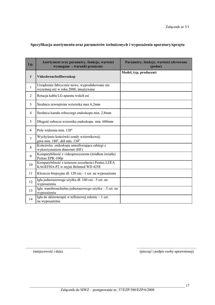 Załącznik nr 3/1 Specyfikacja asortymentu oraz parametrów technicznych i wyposaŜenia aparatury/sprzętu Lp. Asortyment oraz parametry, funkcje, wartości wymagane - warunki graniczne Parametry, funkcje, wartości oferowane (podać) Model, typ, producent: I Videobronchofiberoskop 1 Urządzenie fabrycznie nowe, wyprodukowane nie wcześniej niŜ w roku 2008, nieuŜywane 2 Rotacja kabla LG aparatu wokół osi 3 Średnica zewnętrzna wziernika max 6,2mm 4 Średnica kanału roboczego endoskopu min. 2,8mm 5 Długość robocza wziernika endoskopu min. 600mm 6 Pole widzenia min. 120º 7 8 9 10 11 12 13 14 Wychylenie końcówki sondy wziernikowej: góra min. 180º, dół min. 130º Końcówka endoskopu umoŜliwiająca zabiegi z wykorzystaniem diatermii (HF) Kompatybilność z videoprocesorem (źródłem światła) Pentax EPK-100p Kompatybilność z testerem szczelności Pentax LEEA KAGEFHA-P2 w myjni Belimed WD 425E Kleszcze biopsyjne dł. 120 cm - 1 szt. na wyposaŜeniu Igła jednorazowego uŜytku dł. 160 cm - 5 szt. na wyposaŜeniu Igła transbronchialna jednorazowego uŜytku – 5 szt. na wyposaŜeniu Igła do skleroterapii w teflonowej osłonie – 1 szt. na wyposaŜeniu ............................................................. (miejscowość i data) .................................................................. (pieczęć i podpis osoby uprawnionej) ______________________________________________________________________________________ 17 Załącznik do SIWZ – postępowanie nr: 37/EZP/380/EZP/6/2008 Załącznik nr 3/2 Specyfikacja asortymentu oraz parametrów technicznych i wyposaŜenia aparatury/sprzętu Lp. Asortyment oraz parametry, funkcje, wartości wymagane - warunki graniczne Parametry, funkcje, wartości oferowane (podać) Model, typ, producent: II Gastroskop 1 Urządzenie fabrycznie nowe, wyprodukowane nie wcześniej niŜ w roku 2008, nieuŜywane 2 Średnica sondy 9,8 mm 3 Średnica kanału roboczego 2,8 mm 4 Kąt zagięcia końcówki góra/dół 210/90 stopni 5 Kąt zgięcia końcówki prawo/lewo 100/100 stopni 6 Długość robocza 1030 mm 7 Pole widzenia 100 stopni 8 Głębia ostrości 3 – 100 mm 9 Kleszczyki do biopsji min. 2 szt. 10 Szczoteczka czyszcząca min. 1 szt. 11 Ustnik min. 2 szt. 12 Szczoteczka cytologiczna min. 1 szt. 13 Rurka infuzyjna min. 1 szt. 14 Zbiorniczek na wodę min. 1 szt. 15 Zatyczka ochronna na kanał roboczy min. 10 szt. 16 Uszczelka pierścieniowa min. 1 szt. 17 Olej silikonowy min. 1 szt. 18 Iniektor rurkowy min. 1 szt. 19 Miernik nieszczelności min. 1 szt. 20 Zatyczka powietrzna min. 1 szt. ....................................................... (miejscowość i data) .................................................................. (pieczęć i podpis osoby uprawnionej) ______________________________________________________________________________________ 18 Załącznik do SIWZ – postępowanie nr: 37/EZP/380/EZP/6/2008 Załącznik nr 3/3 Specyfikacja asortymentu oraz parametrów technicznych i wyposaŜenia aparatury/sprzętu Lp. III 1 2 3 4 Asortyment oraz parametry, funkcje, wartości wymagane - warunki graniczne Koncentratory tlenu Napięcie robocze 230, 50Hz ZuŜycie energii do 350 W CięŜar do 20 kg 6 Poziom głośności max. 35 dB 7 Wymiary nie przekraczające 55 x 25x 55 bez kółeczek 8 Przepływ tlenu na wyjściu od 0 – 6 l/min 10 11 Koncentracja tlenu: 1-4 l/min 95% +/- 3% 4-5 l/min 85 % +/- 3% 5-6 l/min 75% +/- 3% Temperatura tlenu w temperaturze otoczenia max. + 2 °C Praca ciągła stęŜenie wydalanego tlenu nie mniej niŜ 90% 12 NawilŜacz na wyposaŜeniu 13 Przepływomierz z moŜliwością regulacji płynnej min. od 1 do 6 l/min 14 Filtr wyjściowy na wyposaŜeniu 15 Przewody nosowe (wąsy tlenowe): 2 m oraz 5m 16 Okres gwarancji: minimum 5 lat 17 18 19 Model, typ, producent: Urządzenia fabrycznie nowe, wyprodukowane nie wcześniej niŜ w roku 2008, nieuŜywane Aparat przenośny (rączka, uchwyt, kółka jezdne) 5 9 Parametry, funkcje, wartości oferowane (podać) Karta gwarancyjna oraz karta aparatu (paszport techniczny) dla kaŜdego koncentratora Urządzenie zastępcze w przypadku konieczności naprawy poza domem pacjenta Czas reakcji serwisu na zgłoszenie awarii nie dłuŜszy niŜ 24 godziny ............................................................. (miejscowość i data) ............................................................ (pieczęć i podpis osoby uprawnionej) ______________________________________________________________________________________ 19 Załącznik do SIWZ – postępowanie nr: 37/EZP/380/EZP/6/2008 Załącznik nr 3/4 Specyfikacja asortymentu oraz parametrów technicznych i wyposaŜenia aparatury/sprzętu Lp. IV 1 --2 3 4 5 6 7 8 9 10 11 12 --13 14 15 16 17 Asortyment oraz parametry, funkcje, wartości wymagane - warunki graniczne Aparat do nieinwazyjnej wentylacji Urządzenie fabrycznie nowe, wyprodukowane nie wcześniej niŜ w roku 2008, nieuŜywane Parametry ogólne Urządzenie do nieinwazyjnej wentylacji osób dorosłych o masie ciała pow. 30 kg z niewydolnością oddechową lub zespołem obturacyjnego bezdechu sennego System do gromadzenia i analizy danych terapeutycznych wraz z niezbędnymi urządzeniami do zapisu w/w danych Maksymalne wymiary 30x25x18 cm Maksymalna waga: 3,0 kg Zakres ciśnienia wdechowego IPAP: 4-30 cm H20 Częstość oddychania 4-30 oddech/min Czas trwania wdechu: 0,5- 3,0 s Regulacja czasu zmiany ciśnienia z fazy wydechu na wdech (EPAP na IPAP) w zakresie 0,1 - 0,5 sek. MoŜliwość nastawienia czasu liniowego narastania ciśnienia w zakresie 5 - 45 min. ułatwiającego zaśnięcie pacjenta Automatyczne progi wyzwalające zmianę ciśnienia pomiędzy fazami oddechowymi (wdech-wydech) reagujące na spontaniczny wysiłek oddechowy pacjenta bez konieczności manualnego dostosowania przez lekarza Tryby pracy Dostarczenie powietrza pod stałym ciśnieniem o tej samej wartości (CPAP) do 20 cm H20 Dwupoziomowy Spontaniczny (S) Dwupoziomowy Spontaniczno-czasowy (