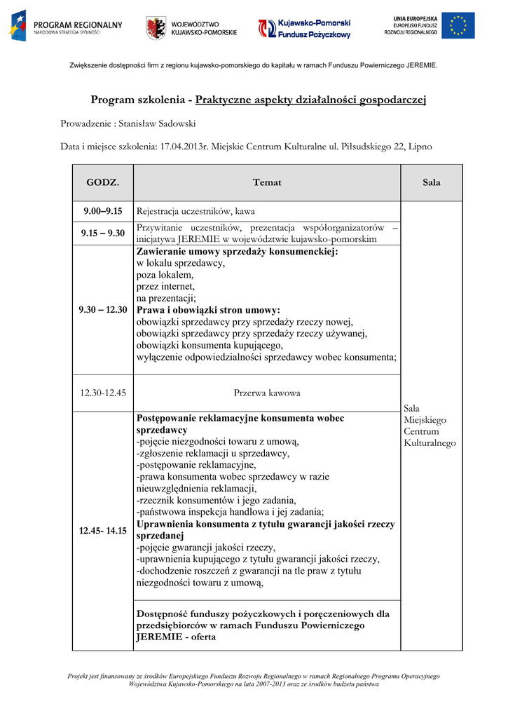 Zwiększenie dostępności firm z regionu kujawsko-pomorskiego do kapitału w ramach Funduszu Powierniczego JEREMIE. Program szkolenia - Praktyczne aspekty działalności gospodarczej Prowadzenie : Stanisław Sadowski Data i miejsce szkolenia: 17.04.2013r. Miejskie Centrum Kulturalne ul. Piłsudskiego 22, Lipno GODZ. 9.00–9.15 Temat Sala Rejestracja uczestników, kawa Przywitanie uczestników, prezentacja współorganizatorów – inicjatywa JEREMIE w województwie kujawsko-pomorskim Zawieranie umowy sprzedaży konsumenckiej: w lokalu sprzedawcy, poza lokalem, przez internet, na prezentacji; 9.30 – 12.30 Prawa i obowiązki stron umowy: obowiązki sprzedawcy przy sprzedaży rzeczy nowej, obowiązki sprzedawcy przy sprzedaży rzeczy używanej, obowiązki konsumenta kupującego, wyłączenie odpowiedzialności sprzedawcy wobec konsumenta; 9.15 – 9.30 12.30-12.45 Przerwa kawowa Sala Postępowanie reklamacyjne konsumenta wobec Miejskiego sprzedawcy Centrum -pojęcie niezgodności towaru z umową, Kulturalnego -zgłoszenie reklamacji u sprzedawcy, -postępowanie reklamacyjne, -prawa konsumenta wobec sprzedawcy w razie nieuwzględnienia reklamacji, -rzecznik konsumentów i jego zadania, -państwowa inspekcja handlowa i jej zadania; Uprawnienia konsumenta z tytułu gwarancji jakości rzeczy 12.45- 14.15 sprzedanej -pojęcie gwarancji jakości rzeczy, -uprawnienia kupującego z tytułu gwarancji jakości rzeczy, -dochodzenie roszczeń z gwarancji na tle praw z tytułu niezgodności towaru z umową, Dostępność funduszy pożyczkowych i poręczeniowych dla przedsiębiorców w ramach Funduszu Powierniczego JEREMIE - oferta Projekt jest finansowany ze środków Europejskiego Funduszu Rozwoju Regionalnego w ramach Regionalnego Programu Operacyjnego Województwa Kujawsko-Pomorskiego na lata 2007-2013 oraz ze środków budżetu państwa Zwiększenie dostępności firm z regionu kujawsko-pomorskiego do kapitału w ramach Funduszu Powierniczego JEREMIE. 14.15- 14.30 14.30-15.00 15.00 Przerwa kawowa Dochodzenie przez konsumenta roszczeń przed Sądem -postępowanie polubowne, -pozew sądowy w sprawach reklamacyjnych, -przebieg postępowania przed sądem, -egzekucja zasądzonego przez sąd roszczenia. Zakończenie szkolenia Projekt jest finansowany ze środków Europejskiego Funduszu Rozwoju Regionalnego w ramach Regionalnego Programu Operacyjnego Województwa Kujawsko-Pomorskiego na lata 2007-2013 oraz ze środków budżetu państwa