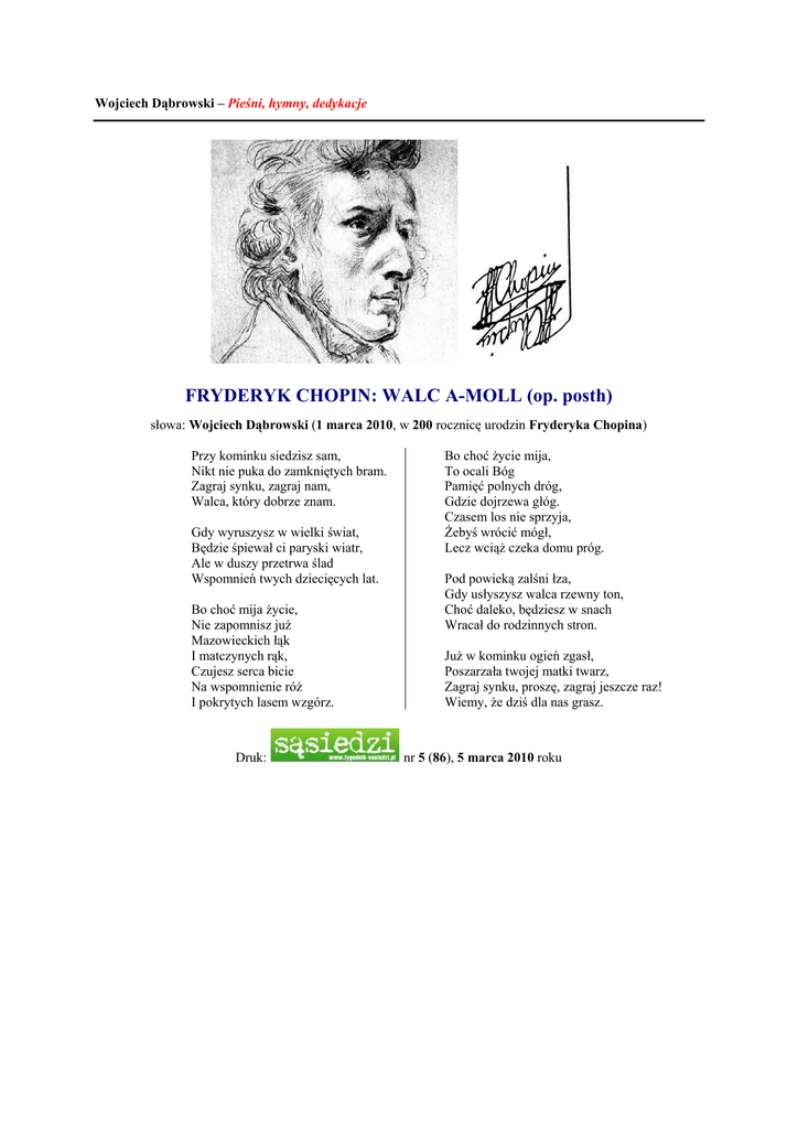 Wojciech Dąbrowski – Pieśni, hymny, dedykacje FRYDERYK CHOPIN: WALC A-MOLL (op. posth) słowa: Wojciech Dąbrowski (1 marca 2010, w 200 rocznicę urodzin Fryderyka Chopina) Przy kominku siedzisz sam, Nikt nie puka do zamkniętych bram. Zagraj synku, zagraj nam, Walca, który dobrze znam. Gdy wyruszysz w wielki świat, Będzie śpiewał ci paryski wiatr, Ale w duszy przetrwa ślad Wspomnień twych dziecięcych lat. Bo choć mija życie, Nie zapomnisz już Mazowieckich łąk I matczynych rąk, Czujesz serca bicie Na wspomnienie róż I pokrytych lasem wzgórz. Druk: Bo choć życie mija, To ocali Bóg Pamięć polnych dróg, Gdzie dojrzewa głóg. Czasem los nie sprzyja, Żebyś wrócić mógł, Lecz wciąż czeka domu próg. Pod powieką zalśni łza, Gdy usłyszysz walca rzewny ton, Choć daleko, będziesz w snach Wracał do rodzinnych stron. Już w kominku ogień zgasł, Poszarzała twojej matki twarz, Zagraj synku, proszę, zagraj jeszcze raz! Wiemy, że dziś dla nas grasz. nr 5 (86), 5 marca 2010 roku