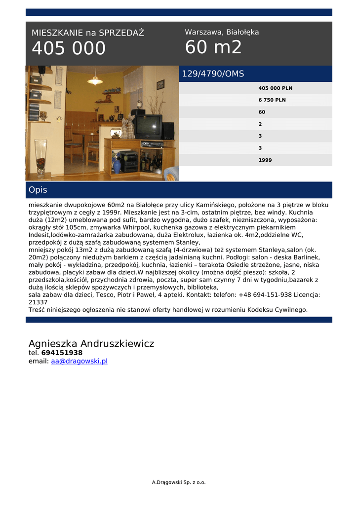 Warszawa, Białołęka MIESZKANIE na SPRZEDAŻ 60 m2 405 000 129/4790/OMS 405 000 PLN 6 750 PLN 60 2 3 3 1999 Opis mieszkanie dwupokojowe 60m2 na Białołęce przy ulicy Kamińskiego, położone na 3 piętrze w bloku trzypiętrowym z cegły z 1999r. Mieszkanie jest na 3-cim, ostatnim piętrze, bez windy. Kuchnia duża (12m2) umeblowana pod sufit, bardzo wygodna, dużo szafek, niezniszczona, wyposażona: okrągły stół 105cm, zmywarka Whirpool, kuchenka gazowa z elektrycznym piekarnikiem Indesit,lodówko-zamrażarka zabudowana, duża Elektrolux, łazienka ok. 4m2,oddzielne WC, przedpokój z dużą szafą zabudowaną systemem Stanley, mniejszy pokój 13m2 z dużą zabudowaną szafą (4-drzwiowa) też systemem Stanleya,salon (ok. 20m2) połączony niedużym barkiem z częścią jadalnianą kuchni. Podłogi: salon - deska Barlinek, mały pokój - wykładzina, przedpokój, kuchnia, łazienki – terakota Osiedle strzeżone, jasne, niska zabudowa, placyki zabaw dla dzieci.W najbliższej okolicy (można dojść pieszo): szkoła, 2 przedszkola,kościół, przychodnia zdrowia, poczta, super sam czynny 7 dni w tygodniu,bazarek z dużą ilością sklepów spożywczych i przemysłowych, biblioteka, sala zabaw dla dzieci, Tesco, Piotr i Paweł, 4 apteki. Kontakt: telefon: +48 694-151-938 Licencja: 21337 Treść niniejszego ogłoszenia nie stanowi oferty handlowej w rozumieniu Kodeksu Cywilnego. Agnieszka Andruszkiewicz tel. 694151938 email: [email protected] A.Drągowski Sp. z o.o. Powered by TCPDF (www.tcpdf.org)