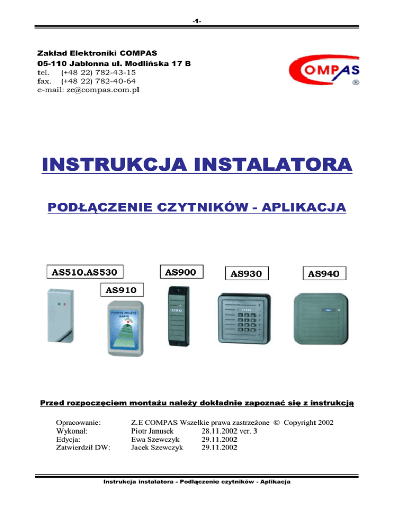 -1- Zakład Elektroniki COMPAS 05-110 Jabłonna ul. Modlińska 17 B tel. (+48 22) 782-43-15 fax. (+48 22) 782-40-64 e-mail: [email protected] INSTRUKCJA INSTALATORA PODŁĄCZENIE CZYTNIKÓW - APLIKACJA AS510,AS530 AS900 AS930 AS940 AS910 Przed rozpoczęciem montażu należy dokładnie zapoznać się z instrukcją Opracowanie: Wykonał: Edycja: Zatwierdził DW: Z.E COMPAS Wszelkie prawa zastrzeżone Copyright 2002 Piotr Janusek 28.11.2002 ver. 3 Ewa Szewczyk 29.11.2002 Jacek Szewczyk 29.11.2002 Instrukcja instalatora - Podłączenie czytników - Aplikacja -2- SPIS TREŚCI 1. Podłączenia czytników ze sterownikiem AS 1510/W Czytnik AS 900 strona 3 Czytnik AS 930 strona 3 Czytnik AS 530 strona 4 Czytnik AS 910 strona 4 Czytnik AS 940 strona 5 2. Podłączenia czytników ze sterownikiem AS 1510 Czytnik AS 510 strona 6 Czytnik AS 600 strona 6 3. Podłączenia czytników z kontrolerem AS1550 Czytnik AS 510 strona 7 Czytnik AS 530 strona 7 Czytnik AS 900 strona 8 Czytnik AS 910 strona 8 Czytnik AS 940 strona 9 4. POŁĄCZENIA CZYTNIKÓW Z KONTROLEREM AS 1560 i AS 1562 Czytnik AS 530 strona 10 Czytnik AS 900 strona 10 Czytnik AS 930 strona 11 Czytnik AS 910 strona 12 Czytnik AS 940 strona 12 Instrukcja instalatora - Podłączenie czytników - Aplikacja -3- 1. POŁĄCZENIA CZYTNIKÓW ZE STEROWNIKIEM AS 1510/W Rys. 1 Połączenie AS 1510/W z AS 900 - czytnik kart zbliżeniowych HID MiniProx Rys. 2 Połączenie AS 1510/W z AS 930 - czytnik zbliżeniowy HID+klawiatura ProProx Instrukcja instalatora - Podłączenie czytników - Aplikacja -4- Rys.3 Połączenie AS 1510/W z AS 530 - czytnik pamięci dotykowych DALLAS Wiegand26 Rys.4 Połączenie AS 1510/W z AS 910 - czytnik kart zbliżeniowych HID Instrukcja instalatora - Podłączenie czytników - Aplikacja -5- Rys.5 Połączenie AS 1510/W z AS 940 - czytnik kart zbliżeniowych HID MaxiProx Instrukcja instalatora - Podłączenie czytników - Aplikacja -6- 2. POŁĄCZENIA CZYTNIKÓW ZE STEROWNIKIEM AS 1510 Rys.1 Połączenie AS 1510 z AS 510 - czytnik pamięci dotykowych DALLAS Rys.2 Połączenie AS 1510 z AS 600 - czytnik pamięci dotykowych DALLAS z matrycą klawiaturową Instrukcja instalatora - Podłączenie czytników - Aplikacja -7- 3. POŁĄCZENIA CZYTNIKÓW Z KONTROLEREM AS 1550 Rys.1 Podłączenie AS1550 z AS 510 - czytnik pamięci dotykowych DALLAS Rys.2 Podłączenie AS 1550 z AS 530- czytnik pamięci dotykowych DALLAS Wiegand26 Instrukcja instalatora - Podłączenie czytników - Aplikacja -8- Rys.3 Połączenie AS1550 z AS 900- czytnik kart zbliżeniowych HID MiniProx Rys.4 Połączenie AS1550 z AS 910- czytnik kart zbliżeniowych HID Instrukcja instalatora - Podłączenie czytników - Aplikacja -9- Rys.5 Połączenie AS1550 z AS 940- czytnik kart zbliżeniowych HID MaxiProx Instrukcja instalatora - Podłączenie czytników - Aplikacja -10- 4. POŁĄCZENIA CZYTNIKÓW Z KONTROLEREM AS 1560 i AS 1562 Rys.1 Podłączenie AS 1560 z AS 530- czytnik pamięci dotykowych DALLAS Wiegand26 Instrukcja instalatora - Podłączenie czytników - Aplikacja -11- Rys.2 Połączenie AS1560 z AS 900- czytnik kart zbliżeniowych HID MiniProx Rys. 3 Połączenie AS 1560 i AS 1562 z AS 930 - czytnik zbliżeniowy HID+klawiatura ProProx Instrukcja instalatora - Podłączenie czytników - Aplikacja -12- Rys.4 Połączenie AS1560 z AS 910- czytnik kart zbliżeniowych HID Rys.5 Połączenie AS1560 z AS 940- czytnik kart zbliżeniowych HID MaxiProx Instrukcja instalatora - Podłączenie czytników - Aplikacja