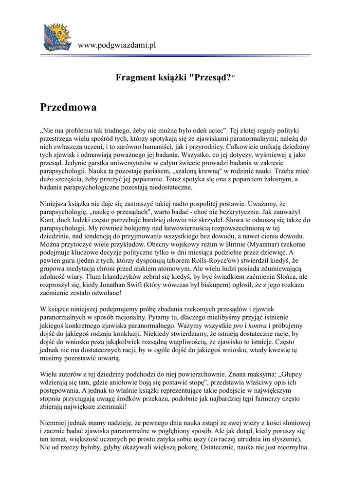 www.podgwiazdami.pl Fragment książki "Przesąd?" Przedmowa „Nie ma problemu tak trudnego, żeby nie można było odeń uciec". Tej złotej reguły polityki przestrzega wielu spośród tych, którzy spotykają się ze zjawiskami paranormalnymi; należą do nich zwłaszcza uczeni, i to zarówno humaniści, jak i przyrodnicy. Całkowicie unikają dziedziny tych zjawisk i odmawiają poważnego jej badania. Wszystko, co jej dotyczy, wyśmiewaj ą jako przesąd. Jedynie garstka uniwersytetów w całym świecie prowadzi badania w zakresie parapsychologii. Nauka ta pozostaje pariasem, „szaloną krewną" w rodzinie nauki. Trzeba mieć dużo szczęścia, żeby przeżyć jej popieranie. Toteż spotyka się ona z poparciem żałosnym, a badania parapsychologiczne pozostają niedostateczne. Niniejsza książka nie daje się zastraszyć takiej nadto pospolitej postawie. Uważamy, że parapsychologię, „naukę o przesądach", warto badać - choć nie bezkrytycznie. Jak zauważył Kant, duch ludzki często potrzebuje bardziej ołowiu niż skrzydeł. Słowa te odnoszą się także do parapsychologii. My również bolejemy nad łatwowiernością rozpowszechnioną w tej dziedzinie, nad tendencją do przyjmowania wszystkiego bez dowodu, a nawet cienia dowodu. Można przytoczyć wiele przykładów. Obecny wojskowy reżim w Birmie (Myanmar) rzekomo podejmuje kluczowe decyzje polityczne tylko w dni miesiąca podzielne przez dziewięć. A pewien guru (jeden z tych, którzy dysponują taborem Rolls-Royce'ów) stwierdził kiedyś, że grupowa medytacja chroni przed atakiem atomowym. Ale wielu ludzi posiada zdumiewającą zdolność wiary. Tłum Irlandczyków zebrał się kiedyś, by być świadkiem zaćmienia Słońca, ale rozproszył się, kiedy Jonathan Swift (który wówczas był biskupem) ogłosił, że z jego rozkazu zaćmienie zostało odwołane! W książce niniejszej podejmujemy próbę zbadania rzekomych przesądów i zjawisk paranormalnych w sposób racjonalny. Pytamy tu, dlaczego mielibyśmy przyjąć istnienie jakiegoś konkretnego zjawiska paranormalnego. Ważymy wszystkie pro i kontra i próbujemy dojść do jakiegoś rodzaju konkluzji. Niekiedy stwierdzamy, że istnieją dostateczne racje, by dojść do wniosku poza jakąkolwiek rozsądną wątpliwością, że zjawisko to istnieje. Często jednak nie ma dostatecznych racji, by w ogóle dojść do jakiegoś wniosku; wtedy kwestię tę musimy pozostawić otwartą. Wielu autorów z tej dziedziny podchodzi do niej powierzchownie. Znana maksyma: „Głupcy wdzierają się tam, gdzie aniołowie boją się postawić stopę", przedstawia właściwy opis ich postępowania. A jednak to właśnie książki reprezentujące takie podejście w największym stopniu przyciągają uwagę środków przekazu, podobnie jak najbardziej tępi farmerzy często zbierają największe ziemniaki! Niemniej jednak mamy nadzieję, że pewnego dnia nauka zstąpi ze swej wieży z kości słoniowej i zacznie badać zjawiska paranormalne w pogłębiony sposób. Ale jak dotąd, kiedy poruszy się ten temat, większość uczonych po prostu zatyka sobie uszy (co raczej utrudnia im słyszenie). Nie od rzeczy byłoby, gdyby okazywali większą pokorę. Ostatecznie, nauka nie jest nieomylna. www.podgwiazdami.pl W 1896 roku słynny fizyk Lord Kelvin oświadczył, że żaden metalowy pojazd nie może latać! Ale nawet nauka może nie być w stanie wyjaśnić wszystkich problemów poruszonych w tej książce. Wielki logik Kurt Goedel dowiódł, że matematyka i w istocie wszystkie dość obszerne systemy logiczne zawierały twierdzenia, które były prawdziwe, ale których nie sposób było udowodnić. Jeśli jest tak w przypadku takiej nauki ścisłej, jak matematyka, to nikogo nie powinno zdziwić, gdyby udało się dowieść tego w odniesieniu do o wiele mniej ścisłej dziedziny, z którą mamy tu do czynienia. Ale zanim zdecydujemy, czy zajmujemy się tu problemami nierozerwalnymi, musimy się z nimi zapoznać. Jak dotąd, nauka miała skłonność do odrzucania tej sprawy bez badania jej. Ale podejście to nie jest ani racjonalne, ani naukowe. Każda negacja jakiegokolwiek zjawiska musi opierać się na poważnych argumentach. To nonszalanckie odrzucanie rzekomych przesądów wyrządza również złą c /wyklym liul/mm hadwyjna iiici)>\%ync liniowa \\idu kultur starożytnych kiedyś zbywano jako przesąd i hokuspokus. Ale wiele z jej leków ma dużo do zaofiarowania, jak w przypadku starej indyjskiej ajurwedy, dziś uznawanej przez Światową Organizację Zdrowia (World Health Organization -WHO), jak również szeregu aspektów tradycyjnej medycyny chińskiej, takich jak akupunktura. Nigeria próbowała połączyć tradycyjną medycynę ludową z medycyną zachodnią. Ta ostatnia musiała zacisnąć zęby i uznać pewne starożytne tradycje. Jednakże w ostatecznym rezultacie może to ograniczyć właściwe medycynie ortodoksyjnej poleganie na lekach, które mają wiele szkodliwych efektów ubocznych. Większość naszych przykładów dotyczących sfery zjawisk paranormalnych zaczerpnęliśmy z Biblii i ze starożytnej literatury skandynawskiej, tych dwóch filarów literatury światowej. Zarówno w Biblii, jak i w sagach znajdujemy każdy możliwy fenomen paranormalny. Ale również Azja ma tu swój własny wkład, o czym świadczą literatury indyjska i chińska. Biblia była najważniejszą księgą na Zachodzie przez ostatnie 2000 lat. Przełożona na ponad 2000 języków, jest przez cały czas bestsellerem. Ale w okresie Średniowiecza czytanie jej w językach narodowych było ściśle zabronione. Tylko duchowni mieli prawo czytać ją w jej językach oryginalnych. O ironio, ludziom świeckim nie wolno było czytać tego, w co mieli wierzyć! kiedy Jacob van Liesveldt tłumaczył Biblię na niderlandzki, jedna z jego marginesowych uwag głosiła: „Zbawienie człowieka pochodzi jedynie od Jezusa Chrystusa". Innymi słowy, nie można było, jego zdaniem, wkupić się do n