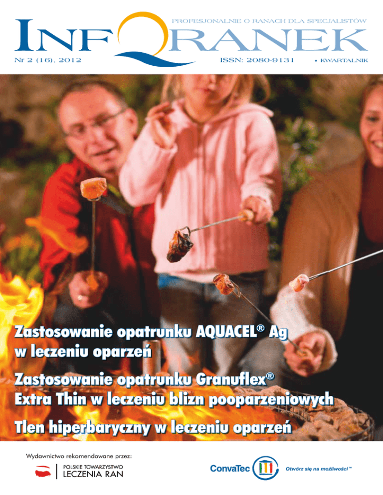 Nr 2 (16), 2012 ISSN: 2080-9131 KWARTALNIK Zastosowanie opatrunku AQUACEL® Ag w leczeniu oparzeń Zastosowanie opatrunku Granuflex® Extra Thin w leczeniu blizn pooparzeniowych Tlen hiperbaryczny w leczeniu oparzeń Wydawnictwo rekomendowane przez: Słowo przewodnie Spis treści Zastosowanie opatrunku AQUACEL® Ag w leczeniu oparzeń i odmrożeń, zespołu Lyella oraz ran przewlekłych............................................ 4 Zastosowanie opatrunku Granuflex® Extra Thin w leczeniu blizn pooparzeniowych i pooperacyjnych ................................................ 10 Tlen hiperbaryczny w leczeniu oparzeń ................ 14 Leczenie zachowawcze rany oparzeniowej I i II stopnia z zastosowaniem nowoczesnych środków o działaniu miejscowym ..........................15 „Powolne wirusy” i spory bakteryjne w środowisku szpitalnym ..................................... 18 Zakupy opatrunków przez internet ....................... 21 Specjalistyczne Centra Leczenia Ran ................... 22 Apteki patronackie.............................................. 26 100% ConvaTec .................................................. 28 Podróże po dyżurze – Wiedeń ............................. 29 Jadło = sadło – Kącik kulinarny .......................... 31 Nr 2 (16), 2012 ISSN: 2080-9131 KWARTALNIK Bezpłatny magazyn. Ukazuje się co 3 miesiące od marca 2008 r. Redaktor naczelny: Patryk Martynus Adres redakcji: onvaTec Polska Sp. z o.o. C Al. Armii Ludowej 26, 00-609 Warszawa Prenumerata: Bezpłatną prenumeratę można zamawiać, pobierając kupon prenumeraty ze strony www.mojarana.pl lub dzwoniąc pod bezpłatny numer infolinii 800 627 262 Wydawca: onvaTec Polska Sp. z o.o. C Al. Armii Ludowej 26, 00-609 Warszawa tel. (22) 579 66 50, faks (22) 579 66 44 © 2012 Copyright by ConvaTec Polska Sp. z o.o. Wszelkie prawa zastrzeżone. Żadna część tego kwartalnika nie może być kopiowana ani odtwarzana w jakiejkolwiek formie i przy użyciu jakichkolwiek środków bez pisemnej zgody Wydawcy. Drodzy Czytelnicy, W poprzednim wydaniu pisałem o zmianach w zapisach ustawy refundacyjnej, które miały miejsce w grudniu zeszłego roku, a obowiązują od stycznia tego roku. Sytuacja ta w końcu poprawiła jakość leczenia pacjentów specjalistycznymi opatrunkami. Leczenie ran przewlekłych w naszym kraju ma wielką szansę stać się standardem postępowania wśród większej grupy pacjentów. To właśnie dlatego w maju tego roku firma ConvaTec dodatkowo zdecydowała się przeprowadzić kampanię edukacyjną zarówno w mediach (głównie w TV oraz w internecie), jak i wśród lekarzy POZ oraz innych specjalistów. Celem tej kampanii jest wzrost świadomości leczenia pacjentów z raną specjalistycznymi opatrunkami. Do tej pory niewiele ponad 10% pacjentów było leczonych metodami nowoczesnymi. Pierwsze wyniki kampanii pokazują, że jest ona motywatorem do podjęcia tego sposobu leczenia oraz bardzo dobrze odbierana jest zarówno w środowisku medycznym, jak i przez pacjentów. Aktywność ta daje nam niepowtarzalną szansę na odmianę sytuacji pacjentów z przewlekłą raną w Polsce i wspólnie powinniśmy ją jak najlepiej wykorzystać. W lipcu br. w wyniku decyzji Ministerstwa Zdrowia oraz nowelizacji listy refundacyjnej, kolejny opatrunek firmy ConvaTec zostanie objęty refundacją, będzie to AQUACEL® Ag 2 cm x 45 cm (wzmocnione paski ze srebrem). Nadmienię, że wspomniane zmiany w listach refundacyjnych to efekt starań naszej firmy o umieszczenie w wykazach kolejnych opatrunków oraz z pewnością krok naprzód w procesie podnoszenia standardów leczenia ran w Polsce, który umożliwi pacjentom lepszy dostęp do specjalistycznych produktów. Wracając do aktualnego wydania magazynu, polecam Państwa uwadze artykuły związane z leczeniem oparzeń pośredniej grubości skóry, wspieraniem gojenia blizn pooparzeniowych, czy też wykorzystaniem systemu do pomiaru ciśnienia śródbrzusznego u pacjentów oparzonych. Zgodnie z zapowiedziami podróżnikom polecamy zwiedzanie Wiednia, w którym to mieście odbył się kolejny kongres EWMA. Z kolei kulinarne inspiracje w tym wydaniu to propozycje naszej koleżanki ze stolicy Dolnego Śląska. Niezmiennie publikujemy aktualną listę placówek uczestniczących w programie SCLR (Specjalistyczne Centra Leczenia Ran) oraz aptek patronackich. Stanowią one stałe pozycje „Inforanka”. W serwisie www.mojarana.pl odnajdą Państwo m.in. pełną wersję naszego przekazu mediowego wraz z filmem. Od marca 2011 roku mają Państwo możliwość bezpośredniego zakupu opatrunków w sklepie internetowym w ramach serwisu. W sklepie dostępna jest pełna oferta firmy ConvaTec w atrakcyjnych cenach. Nowoczesne rozwiązanie platformy sklepu pozwala nam bezpiecznie realizować transakcje kartami płatniczymi lub kredytowymi. Możliwe jest również dokonanie przelewu bankowego. Wszelkie uwagi czy komentarze odnośnie magazynu mogą Państwo przesłać mailem na adres [email protected] lub w sposób tradycyjny, pocztą na adres redakcji. bezpłatna infolinia: 800 627 262 e-mail: [email protected] www.convatec.pl lub www.mojarana.pl 2 Bezpłatna linia informacyjna: 800 627 262 Życzę interesującej lektury Patryk Martynus Szanowni Państwo, Skóra jako największy zewnętrzny narząd ludzkiego organizmu spełnia nie tylko funkcję biologiczną – ochronną, regulacyjną i integracyjną – ale również psychiczną, tworząc obraz własnego ciała, postrzegania siebie i odbioru przez otoczenie. Wygląd skóry w znaczący sposób wpływa na samoakceptację osoby oparzonej, szczególnie gdy oparzenie dotyczyło miejsc odsłoniętych (np. twarz, szyja, dłonie i inne). Powstająca po wyleczeniu rany oparzeniowej blizna może być twarda, włóknista, pozbawiona przydatków (np. mieszki włosowe, gruczoły). Spotykane skutki oparzenia i pozostające po nim blizny odsłoniętych części ciała, a także powikłania fizyczne i psychiczne, jak doświa