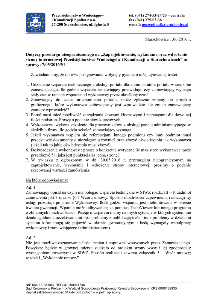 Przedsiębiorstwo Wodociągów i Kanalizacji Spółka z o.o. 27-200 Starachowice, ul. Iglasta 5 tel. (041) 274-53-24/25 – centrala fax (041) 275-03-36 e-mail: [email protected] Starachowice 1.06.2016 r. Dotyczy przetargu nieograniczonego na „Zaprojektowanie, wykonanie oraz wdrożenie strony internetowej Przedsiębiorstwa Wodociągów i Kanalizacji w Starachowicach” nr sprawy: 7/05/2016/SI Zawiadamiamy, że do w/w postępowania wpłynęły pytania o niżej cytowanej treści: 1. Udzielenie wsparcia technicznego z obsługi portalu dla administratora portalu w siedzibie zamawiającego. Ile godzin wsparcia zamawiający przewiduje, czy zamawiający wymaga stały etat w ramach wsparcia od wykonawcy przez określony czas? 2. Zmawiający do czasu uruchomienia portalu, może zgłaszać zmiany do projektu graficznego, które wykonawca zobowiązany jest wprowadzić. ile zmian zamawiający zamierz wprowadzić? 3. Portal musi mieć możliwość zarządzania słowami kluczowymi i metatagami dla dowolnej ilości podstron. Proszę o podanie słów kluczowych 4. Wykonawca wykona szkolenie dla pracownika/ów z obsługi panelu administracyjnego w siedzibie firmy. Ile godzin szkoleń zamawiający wymaga. 5. Jeżeli wykonawca wspiera się referencjami innego podmiotu czy inny podmiot musi przedstawić dokumenty o niezaleganiu również oraz złożyć oświadczenia jak wykonawca (jeżeli tak to jakie oświadczenia musi złożyć) 6. Doświadczenie wykonawcy : proszę o konkretne wytyczne ile max stron wykonawca może przedłożyć ? ii jaka jest punktacja za jedną stronę? 7. W związku z ogłoszonym w dn. 30.05.2016 r. przetargiem nieograniczonym na zaprojektowanie, wykonanie i wdrożenie strony internetowej, prosimy o podanie szacowanej wartości zamówienia. Na które odpowiadamy: Ad. 1 Zamawiający opisał na czym ma polegać wsparcie techniczne w SIWZ rozdz. III – Przedmiot zamówienia pkt 3 oraz w §11 Wzoru umowy. Sposób możliwości zapewnienia realizacji tej usługi pozostaje po stronie Wykonawcy. Ilość godzin wsparcia jest nielimitowana w okresie trwania gwarancji. Wparcie może odbywać się za pomocą TeamViewer lub innego programu o zbliżonych możliwościach. Pisząc o wsparciu mamy na myśli sytuacje w których system nie działa zgodnie z oczekiwaniami np.: problemy z publikacją treści, inne problemy w działaniu systemu które mogą się pojawić w okresie gwarancyjnym i będą wymagały współpracy wykonawcy i zamawiającego (administratorem). Ad. 2 Nie jest możliwe oszacowanie ilości zmian i poprawek wnoszonych przez Zamawiającego. Powyższe będzie w głównej mierze zależało od projektu strony www i jej zgodności z wymaganiami zawartymi w SIWZ. Sposób realizacji zawiera załącznik 5 – Wzór umowy; rozdział „Wykonanie umowy” __________________________________________________________________________________________ NIP 664-18-08-503, REGON 290941746 Sąd Rejonowy w Kielcach, X Wydział Gospodarczy Krajowego Rejestru Sądowego nr KRS 0000139930. Kapitał zakładowy wynosi: 64 644 600 złotych – w pełni opłacony. Przedsiębiorstwo Wodociągów i Kanalizacji Spółka z o.o. 27-200 Starachowice, ul. Iglasta 5 tel. (041) 274-53-24/25 – centrala fax (041) 275-03-36 e-mail: [email protected] Ad. 3 Dla każdej z tworzonych podstron na etapie tworzenia lub modyfikacji istnieje możliwość podania słów kluczowych które są związane z prezentowaną treścią. Jeśli będzie to strona o jakości wody jaką dostarczają wodociągi na pewno słowami kluczowymi będą: jakość wody Starachowice pwik, w przypadku ścieków słowa kluczowe będą inne. Niemniej to osoba redagująca treść dobiera stosowne słowa kluczowe. Ad. 4 Szkolenie ma na celu przeszkolenie wybranych pracowników Zamawiającego w zakresie obsługi strony opartej na systemie CMS. Zamawiający nie precyzuje ilości godzin jednak zakłada, że obsługa systemu będzie na tyle intuicyjna, że ilość 7 godz. będzie wystarczająca. Ad. 5 Podmiot udzielający jedynie referencji, który nie bierze w żaden sposób opisany w SIWZ udziału w realizacji zamówienia nie musi składać dokumentów i oświadczeń potwierdzających spełnienie warunków udziału w postępowaniu. Ad. 6 Zamawiający nie stawia limitu ilości wykazanych wykonanych przez Wykonawcę stron internetowych. Punktacja za kryterium doświadczenie nie jest liczona za stronę lecz zgodnie z opisem zawartym w rozdziale XXI SIWZ – Kryteria oceny, pkt. 4. Ze wzoru opisanego w SIWZ wynika, że najkorzystniej jest przedstawić największą liczbę wykonanych stron www. Ad. 7 Przedmiotowe zamówienie jest zamówieniem sektorowym o wartości poniżej stosowania ustawy Prawo zamówień publicznych (tekst jednolity Dz.U.Nr 19 z 2004 r. poz. 177 z.p.zm.). Jest ono prowadzone na podstawie Regulaminu udzielania zamówień (dostępny na stronie: http://bip.pwik.starachowice.pl/regulaminy-,20.html). Zamawiający nie podaje przed otwarciem ofert kwoty jaką zamierza przeznaczyć na realizację zamówienia jak też wartości szacunkowej zamówienia. Można jednak przyjąć, że wartość szacunkowa zamówienia nie przekracza 7 tys. pln. <Prezes Zarządu Spółki> __________________________________________________________________________________________ NIP 664-18-08-503, REGON 290941746 Sąd Rejonowy w Kielcach, X Wydział Gospodarczy Krajowego Rejestru Sądowego nr KRS 0000139930. Kapitał zakładowy wynosi: 64 644 600 złotych – w pełni opłacony. Przedsiębiorstwo Wodociągów i Kanalizacji Spółka z o.o. 27-200 Starachowice, ul. Iglasta 5 tel. (041) 274-53-24/25 – centrala fax (041) 275-03-36 e-mail: [email protected] __________________________________________________________________________________________ NIP 664-18-08-503, REGON 290941746 Sąd Rejonowy w Kielcach, X Wydział Gospodarczy Krajowego Rejestru Sądowego nr KRS 0000139930. Kapitał zakładowy wynosi: 64 644 600 złotych – w pełni opłacony.