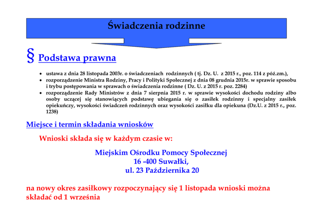-++++++++++++ Świadczenia rodzinne § Podstawa prawna ustawa z dnia 28 listopada 2003r. o świadczeniach rodzinnych ( tj. Dz. U. z 2015 r., poz. 114 z póź.zm.), rozporządzenie Ministra Rodziny, Pracy i Polityki Społecznej z dnia 08 grudnia 2015r. w sprawie sposobu i trybu postępowania w sprawach o świadczenia rodzinne ( Dz. U. z 2015 r. poz. 2284) rozporządzenie Rady Ministrów z dnia 7 sierpnia 2015 r. w sprawie wysokości dochodu rodziny albo osoby uczącej się stanowiących podstawę ubiegania się o zasiłek rodzinny i specjalny zasiłek opiekuńczy, wysokości świadczeń rodzinnych oraz wysokości zasiłku dla opiekuna (Dz.U. z 2015 r., poz. 1238) Miejsce i termin składania wniosków Wnioski składa się w każdym czasie w: Miejskim Ośrodku Pomocy Społecznej 16 -400 Suwałki, ul. 23 Października 20 na nowy okres zasiłkowy rozpoczynający się 1 listopada wnioski można składać od 1 września Świadczenia rodzinne Prawo do zasiłku rodzinnego przysługuje: 1. rodzicom, opiekunowi prawnemu dziecka, opiekunowi faktycznemu dziecka, osobie uczącej się. 2. obywatelom polskim zamieszkującym na terenie Polski przez okres zasiłkowy, w którym otrzymuje się świadczenia rodzinne, chyba że przepisy o koordynacji systemów zabezpieczeń społecznych lub dwustronne umowy międzynarodowe o zabezpieczeniu społecznym stanowią inaczej, 3. cudzoziemcom zamieszkującym na terenie Polski przez okres zasiłkowy w którym otrzymują świadczenia rodzinne: do których stosuje się przepisy o koordynacji systemów zabezpieczeń społecznych, jeżeli wynika to z wiążących Rzeczpospolitą Polską umów dwustronnych o zabezpieczeniu społecznym, przebywającym na terenie RP na podstawie zezwolenia na pobyt stały, zezwolenia na pobyt rezydenta długoterminowego Unii Europejskiej, zezwolenia na pobyt czasowy udzielonego w związku z okolicznościami, o których mowa w art. 127 lub art. 186 ust. 1 pkt 3 ustawy z dnia 12 grudnia 2013 r. o cudzoziemcach, lub w związku z uzyskaniem w Rzeczypospolitej Polskiej statusu uchodźcy lub ochrony uzupełniającej, jeżeli zamieszkują z członkami rodzin na terytorium Rzeczypospolitej Polskiej, posiadającym kartę pobytu z adnotacją „dostęp do rynku pracy”, z wyłączeniem obywateli państw trzecich, którzy uzyskali zezwolenie na pracę na terytorium państwa członkowskiego na okres nieprzekraczający sześciu miesięcy, obywateli państw trzecich przyjętych w celu podjęcia studiów oraz obywateli państw trzecich, którzy mają prawo do wykonywania pracy na podstawie wizy. Warunki uzyskania zasiłku rodzinnego : gdy dochód rodziny w przeliczeniu na osobę albo dochód osoby uczącej się nie przekracza kwoty: 674 zł w przypadku ustalania prawa do świadczeń rodzinnych na okres od 1-11-2015 r. do 31-10-2017 r. 754 zł w przypadku ustalania prawa do świadczeń rodzinnych na okres od 1-11-2017 r. gdy członkiem rodziny jest dziecko legitymujące się orzeczeniem o niepełnosprawności lub orzeczeniem o umiarkowanym albo znacznym stopniu niepełnosprawności dochód rodziny w przeliczeniu na osobę nie może przekraczać kwoty: 764 zł w przypadku ustalania prawa do świadczeń rodzinnych na okres od 1-11-2015 r. do 31-10-2017 r. 844 zł w przypadku ustalania prawa do świadczeń rodzinnych na okres od 1-11-2017 r. w przypadku ubiegania się o jednorazową zapomogę z tytułu urodzenia dziecka dochód rodziny w przeliczeniu na osobę nie może przekraczać 1922 zł, zasiłek rodzinny przysługuje do ukończenia przez dziecko: 18 roku życia, nauki w szkole, jednak nie dłużej niż do ukończenia przez dziecko 21 roku życia, 24 roku życia, jeżeli dziecko kontynuuje naukę w szkole lub w szkole wyższej i legitymuje się orzeczeniem o umiarkowanym lub znacznym stopniu niepełnosprawności. Od dnia 01 stycznia 2016 r. w przypadku gdy dochód rodziny przekracza kwotę kryterium uprawniającego do świadczeń rodzinnych o kwotę niższą niż łączna kwota zasiłków rodzinnych wraz z dodatkami, zasiłek rodzinny wraz z dodatkami przysługuje w wysokości różnicy między łączną kwotą zasiłków rodzinnych wraz z dodatkami, a kwotą o którą został przekroczony dochód rodziny. 3. Wymagane dokumenty: pisemny wniosek o ustalenie prawa do zasiłku rodzinnego oraz dodatków do zasiłku rodzinnego, skrócony odpis aktu urodzenia dziecka lub inny dokument potwierdzający wiek dziecka, orzeczenie o niepełnosprawności albo o umiarkowanym lub znacznym stopniu niepełnosprawności, w przypadku gdy w rodzinie wychowuje się dziecko niepełnosprawne, oświadczenie lub zaświadczenie ze szkoły, w przypadku gdy dziecko ukończyło 18 rok życia, oświadczenie lub zaświadczenie ze szkoły wyższej, w przypadku osoby uczącej się lub osoby legitymującej się orzeczeniem o umiarkowanym albo znacznym stopniu niepełnosprawności, jeżeli uczy się w szkole wyższej, oświadczenie członków rodziny o wysokości uzyskanego dochodu w roku kalendarzowym poprzedzającym okres zasiłkowy, jeżeli członkowie rodziny rozliczają się na podstawie przepisów o zryczałtowanym podatku dochodowym od niektórych przychodów osiąganych przez osoby fizyczne, oświadczenia członków rodziny o wysokości uzyskanego w roku kalendarzowym poprzedzającym okres zasiłkowy innych niż dochody podlegające opodatkowaniu podatkiem dochodowym od osób fizycznych na zasadach określonych w art. 27, art. 30b, art. 30c, art. 30e i art. 30f ustawy z dnia 26 lipca 1991r. o podatku dochodowym od osób fizycznych (Dz.U.z 2012 r., poz. 361 z póź.zm.) , oświadczenie lub zaświadczenie właściwego organu gminy lub nakaz płatniczy o wielkości gospodarstwa rolnego wyrażonego w hektarach przeliczeniowych ogólnej powierzchni w roku kalendarzowym poprzedzającym okres zasiłkowy, umowa dzierżawy, w przypadku oddania części lub całości znajdującego się w posiadaniu gospodarstwa rolnego w dzierżawę, na podstawie umowy zawartej stosownie do przepisów o ub