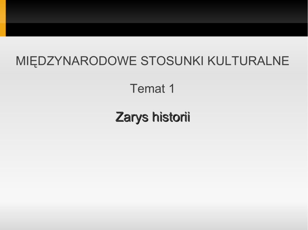 MIĘDZYNARODOWE STOSUNKI KULTURALNE Temat 1 Zarys historii Kultura w MSK Szerokie i wąskie rozumienie kultury Kultura jako zmienna niezależna zależna Czynnik ułatwiający współpracę międzynarodową Czynnik utrudniający Czynnik neutralny Etapy MSK 1) stosunki żywiołowe 1) do XIX w. 2) od XX/XXI 2) instytucjonalizacja stosunków międzynarodowych Stosunki żywiołowe dyfuzja kulturowa Instrumenty: handel, związki dynastyczne Jedwabne szlaki Jedwabny szlak rozpoczynał się w starożytnym Xi'an, dawnej stolicy Chin szlak północny i południowy Morski Szlak Jedwabny Przykłady dyfuzji kulturowej: Słowo ,,wino” Sanskryt (William Jones XVIII w.) Style architektoniczne Dyfuzja językowa polski matka (st.pol. Macierz/mać brat dwa sanskryt ang łacina maat.r mother mater bhrat.r brother frater dva two duo Gotyk Opactow St. Denis Oriflamme Gotyk SainteChapelle, Francja Kaplica pałacowa św. Trójcy, Lublin neogotyk Neuschwanstein (Bawaria) Ludwik II Bawarski XIX w. Stosunki żywiołowe współcześnie przykłady Angielski Indian English Akronimy: FOC ILU FOB = Fresh off the Boat Apartment, Department, Advisor, Budweiser Nowoczesne technologie Incydentalne porozumienia międzynarodowe Dwustronne umowy dot. Restytucji dóbr kultury zgrabionych w czasie wojny Pokój oliwski Kongres Wiedeński II instytucjonalizacja stosunków międzynarodowych Procesy Ogólna instytucjonalizacja SM Większa świadomość roli kultury 1883 Allaince Francaise Okres międzywojenny Większa dynamika Traktaty pokojowe Traktat wersalski 1919 Traktat ryski 1921 Liga Narodów Dwustronne umowy kulturalne Ochrona mniejszości Nowe instytucje promujące kultury narodowe Organy państwowe Instytucje prywatne Hybrydy Kolonializm Polityka ZSRR Po II Wojnie światowej UNESCO United Nations Educational, Scientific and Cultural Organization 16 listopad 1945 Londyn Zimna wojna Instytucjonalizacja kontaktów kulturowych Izolacja Kultura jako instrument wojny psychologicznej Zimna wojna Stosunki w państwach sojalistycznych Nowy model kultury Realizm socjalistyczny Maksym Gorki 1934 W Europie Zachodniej Pluralizm Stosunki rynkowe Rada Europy - 1949 W USA Walka z komunizmem ”czarna lista” American way of life - cocacolonialism makkartyzm Temat 2 Uwarunkowania MSK Rodzaje uwarunkowań Polityczne Różnorodne rodzaje wpływu Relatywizm kulturowy Dyplomacja kulturalna Kultura w polityce UE Polityka wobec mniejszości narodowych i etnicznych Ekonomiczne Potrzeba sponsoringu Kultura jako źródło zysku Społecznej Demokratyzacja życia społecznego Demokratyzacja kultury Polityczne Przyjęcie chrześcijaństwa Związki dynastyczne Rusyfikacja i germanizacja Traktaty pokojowe Izolacja polityczna Ustawy językowe Media publiczne Relatywizm kulturowy ”kultura powinna być postrzegana jako zespół cech duchowych i materialnych, intelektualnych i uczuciowych, charakteryzujących społeczeństwo lub grupę społeczną obejmuje ona, oprócz sztuki i literatury, sposoby zycia, formy wzajemnego współzycia, systemy wartości, tradycje i wierzenia" Deklaracje w sprawie Polityki Kulturalnej Meksyk 1982 Dyplomacja kulturalna Wizerunek państwa Ataszaty kulturowe Więzi z diasporą Kultura w polityce UE Traktat z Maastricht i Traktat amsterdamski Programy: Raphael, Adrianne, Kalejdoscope Kultura 2000 Dwa cele Rozwój prawa: Audiowizualnego Ochrona praw autorskich Wyjątek kulturalny Telewizja bez granic Polityka wobec mniejszości Organiczenia w USA Twierdza Europa Ekonomiczne Potrzeba sponsoringu Mecenat Kultura jako źródło zysku Efekt Bilbao Społeczne Demokratyzacja życia społecznego Demokratyzacja kultury