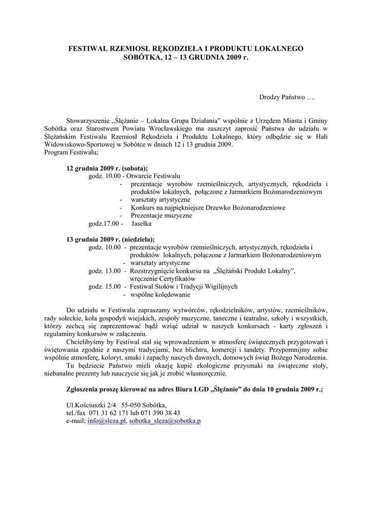 FESTIWAL RZEMIOSŁ RĘKODZIEŁA I PRODUKTU LOKALNEGO SOBÓTKA, 12 – 13 GRUDNIA 2009 r. Drodzy Państwo …. Stowarzyszenie „ŚlęŜanie – Lokalna Grupa Działania” wspólnie z Urzędem Miasta i Gminy Sobótka oraz Starostwem Powiatu Wrocławskiego ma zaszczyt zaprosić Państwa do udziału w ŚlęŜańskim Festiwalu Rzemiosł Rękodzieła i Produktu Lokalnego, który odbędzie się w Hali Widowiskowo-Sportowej w Sobótce w dniach 12 i 13 grudnia 2009. Program Festiwalu; 12 grudnia 2009 r. (sobota); godz. 10.00 - Otwarcie Festiwalu - prezentacje wyrobów rzemieślniczych, artystycznych, rękodzieła i produktów lokalnych, połączone z Jarmarkiem BoŜonarodzeniowym - warsztaty artystyczne - Konkurs na najpiękniejsze Drzewko BoŜonarodzeniowe - Prezentacje muzyczne godz.17.00 - Jasełka 13 grudnia 2009 r. (niedziela); godz. 10.00 - prezentacje wyrobów rzemieślniczych, artystycznych, rękodzieła i produktów lokalnych, połączone z Jarmarkiem BoŜonarodzeniowym - warsztaty artystyczne godz. 13.00 - Rozstrzygnięcie konkursu na „ŚlęŜański Produkt Lokalny”, wręczenie Certyfikatów godz. 15.00 - Festiwal Stołów i Tradycji Wigilijnych - wspólne kolędowanie Do udziału w Festiwalu zapraszamy wytwórców, rękodzielników, artystów, rzemieślników, rady sołeckie, koła gospodyń wiejskich, zespoły muzyczne, taneczne i teatralne, szkoły i wszystkich, którzy zechcą się zaprezentować bądź wziąć udział w naszych konkursach - karty zgłoszeń i regulaminy konkursów w załączeniu. Chcielibyśmy by Festiwal stał się wprowadzeniem w atmosferę świątecznych przygotowań i świętowania zgodnie z naszymi tradycjami, bez blichtru, komercji i tandety. Przypomnijmy sobie wspólnie atmosferę, koloryt, smaki i zapachy naszych dawnych, domowych świąt BoŜego Narodzenia. Tu będziecie Państwo mieli okazję kupić ekologiczne przysmaki na świąteczne stoły, niebanalne prezenty lub nauczycie się jak je zrobić własnoręcznie. Zgłoszenia proszę kierować na adres Biura LGD „ŚlęŜanie” do dnia 10 grudnia 2009 r.; Ul.Kościuszki 2/4 55-050 Sobótka, tel./fax 071 31 62 171 lub 071 390 38 43 e-mail; [email protected], [email protected]