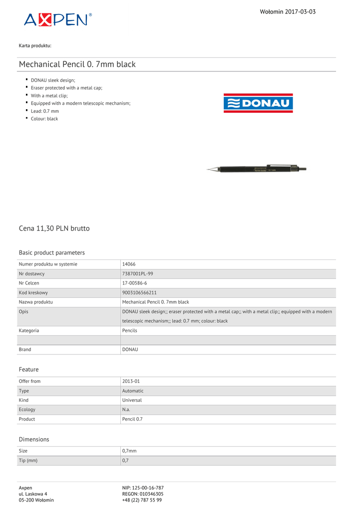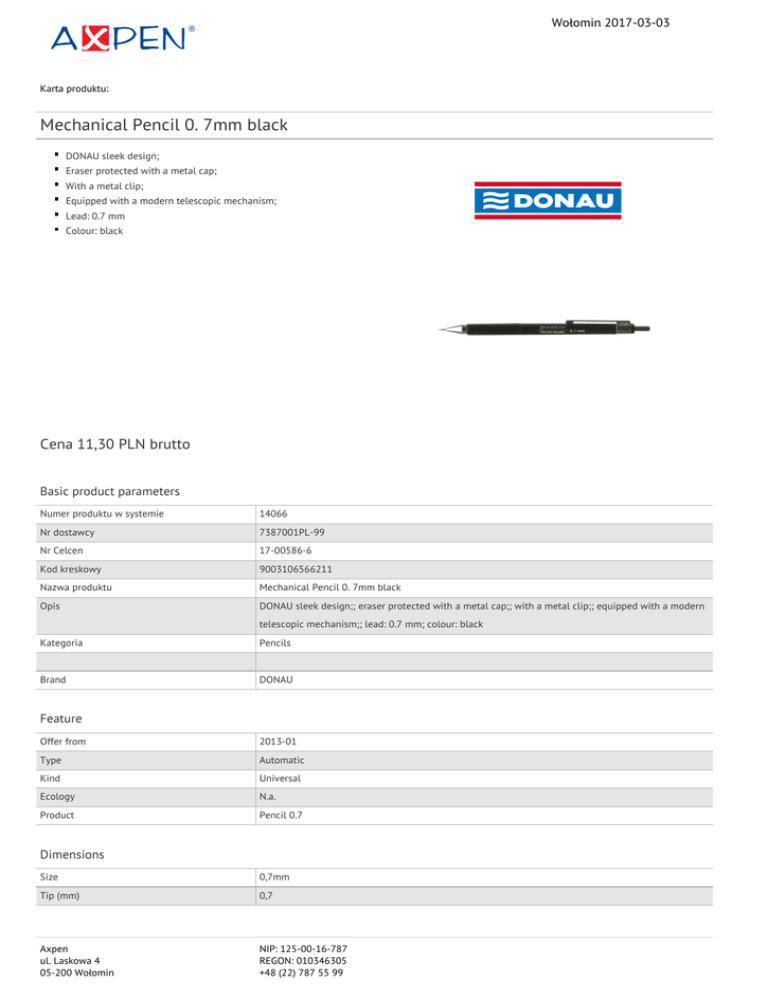 Wołomin 2017-03-03 Karta produktu: Mechanical Pencil 0. 7mm black DONAU sleek design; Eraser protected with a metal cap; With a metal clip; Equipped with a modern telescopic mechanism; Lead: 0.7 mm Colour: black Cena 11,30 PLN brutto Basic product parameters Numer produktu w systemie 14066 Nr dostawcy 7387001PL-99 Nr Celcen 17-00586-6 Kod kreskowy 9003106566211 Nazwa produktu Mechanical Pencil 0. 7mm black Opis DONAU sleek design;; eraser protected with a metal cap;; with a metal clip;; equipped with a modern telescopic mechanism;; lead: 0.7 mm; colour: black Kategoria Pencils Brand DONAU Feature Offer from 2013-01 Type Automatic Kind Universal Ecology N.a. Product Pencil 0.7 Dimensions Size 0,7mm Tip (mm) 0,7 Axpen ul. Laskowa 4 05-200 Wołomin NIP: 125-00-16-787 REGON: 010346305 +48 (22) 787 55 99 Wołomin 2017-03-03 Karta katalogowa produktu cd. Mechanical Pencil 0. 7mm black Procurement vocabulary CPV 30192131-8 Ołówki automatyczne Certifications New product Standard Hit Standard Colour Colour Black Serdecznie zapraszamy do współpracy Axpen zespół. Axpen ul. Laskowa 4 05-200 Wołomin NIP: 125-00-16-787 REGON: 010346305 +48 (22) 787 55 99
