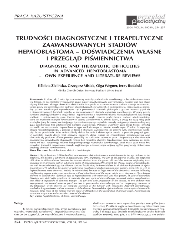 PRACA KAZUISTYCZNA 2004, VOL 34, NO3/4, 254-257 TRUDNOŒCI DIAGNOSTYCZNE I TERAPEUTYCZNE ZAAWANSOWANYCH STADIÓW HEPATOBLASTOMA – DOŒWIADCZENIA W£ASNE I PRZEGL¥D PIŒMIENNICTWA DIAGNOSTIC AND THERAPEUTIC DIFFICULTIES IN ADVANCED HEPATOBLASTOMA – OWN EXPERIENCE AND LITERATURE REVIEWS El¿bieta Zieliñska, Grzegorz Misiak, Olga Wegner, Jerzy Bodalski Klinika Chorób Dzieci Instytutu Pediatrii UM w £odzi Streszczenie: U dzieci do 3 roku ¿ycia nowotwory w¹troby pochodzenia zarodkowego – hepatoblastoma stanowi¹ trzeci¹, co do czêstoœci wystêpowania grupê guzów nowotworowych jamy brzusznej. Rosn¹cy guz daje sk¹pe objawy kliniczne i dlatego oko³o 40% dzieci trafia do szpitala w zaawansowanym stadium rozwoju nowotworu. Celem pracy jest przedstawienie trudnoœci diagnostycznych zwi¹zanych z koniecznoœci¹ ró¿nicowania pomiêdzy guzami zarodkowymi wywodz¹cymi siê z pierwotnych komórek p³ciowych a guzami wywodz¹cymi siê z niezró¿nicowanych komórek w¹troby w zaawansowanych stadiach w¹trobiaka zarodkowego. W pracy przedstawiono przebieg kliniczny u trojga dzieci hepatoblastoma o korzystnym utkaniu histopatologicznym, lecz ró¿nej wielkoœci i umiejscowieniu guza. Guzom tym towarzyszy³o znaczne podwy¿szenie wartoœci alfa-fetoproteiny, która jest markerem ró¿nych nowotworów o utkaniu zarodkowym. U dwójki dzieci, z uwagi na du¿¹ masê guza w obrêbie jamy brzusznej naciekaj¹cego i przemieszczaj¹cego s¹siednie narz¹dy, wstêpnie postawiono diagnozê guza zarodkowego bez zdefiniowania narz¹du wyjœciowego. Pobranie wycinków guza drog¹ biopsji otwartej pozwoli³o na rozpoznanie hepatoblastoma typu nab³onkowego o utkaniu zarodkowym. Pomimo korzystnego obrazu histopatologicznego, u jednego z dzieci z objawami wyniszczenia, po jednym cyklu chemioterapii wyst¹pi³y liczne powik³ania, które uniemo¿liwi³y dalsze leczenie i dziewczynka zmar³a z powodu progresji guza. U pozosta³ej dwójki dzieci, brak objawów ogólnych, dobra reakcja na chemioterapiê przedoperacyjn¹ oraz obni¿anie siê poziomu alfa-fetoproteiny pozwoli³y na ca³kowite usuniêcie guza. Uzupe³niaj¹ca chemioterapia pooperacyjna spowodowa³a d³ugotrwa³e remisje bez nawrotów choroby. Przedstawione opisy wskazuj¹, ¿e niezale¿nie od tzw. korzystnego utkania histopatologicznego w¹trobiaka zarodkowego, du¿a masa guza mo¿e byæ powodem trudnoœci rozpoznania narz¹du wyjœciowego, a towarzysz¹ce objawy ogólne prognozuj¹ niekorzystny przebieg choroby nowotworowej. S³owa kluczowe: hepatoblastoma, dzieci, chemioterapia Abstract: Hepatoblastoma (HB) is the third most common abdominal tumour in children under the age of three. At the diagnosis, the disease is advanced in approximately 40% of patients. The aim of the paper is to show the diagnostic difficulties in differentiation between the tumours derived from the germ cells and the tumours originating from immature liver precursor cells in advanced stages of hepatoblastoma.We present the clinical course of hepatoblastoma with favourable histology, but different size and localisation, in three children. In all children high levels of alphafetoprotein (AFP), which is the marker of embryonal neoplasms including tumours from primary germ cells as well as hepatoblastoma, were observed. Initially in two children, because of large mass of the abdominal tumours infiltrating neighbouring organs, embryonal neoplasms without identification of the organ origin were diagnosed. Open biopsy allowed to establish the epithelial type of hepatoblastoma with embryonal and fetal pattern. In spite of favourable histology, one child with symptoms of cachexia after one cycle of chemotherapy presented various complications, that made it impossible to continue therapy. The girl died with progression of the disease. In two children with asymptomatic abdominal tumours good reaction to preoperative chemotherapy and accompanying decrease of alfa-fetoprotein levels allowed for complete resection of the tumour with lobectomy. Adjuvant chemotherapy resulted in long remission without recurrence of the disease. Presented description indicates that in spite of favourable histology, large mass of the tumour may be cause of difficulties in the recognition of primary origin. Accompanying symptoms may cause unfavourable course of the disease. Key words: hepatoblastoma, children, chemotherapy Wstêp U dzieci poni¿ej trzeciego roku ¿ycia zarodkowy guz w¹troby, w¹trobiak zarodkowy - hepatoblastoma jest trzecim co do czêstoœci, po neuroblastoma i nephroblastoma, 254 PRZEGL¥D PEDIATRYCZNY 2004, VOL 34, NO 3/4 z³oœliwym nowotworem wywodz¹cym siê z narz¹dów jamy brzusznej. Punktem wyjœcia nowotworu s¹ zaburzenia proliferacji wielopotencjalnych komórek prekursorowych w¹troby i dlatego guz posiada morfologiczne cechy ró¿nych stadiów rozwoju narz¹du, a w 97% towarzyszy mu zwiêk- Trudnoœci diagnostyczne i terapeutyczne .. szona synteza alfa-fetoproteiny (1). Mediana wieku w chwili diagnozy wynosi 1 rok i niezwykle rzadko hepatoblastoma wystêpuje u dzieci po 3 roku ¿ycia. W populacji rasy bia³ej szacowana czêstoœæ wynosi oko³o1% nowotworów wieku dzieciêcego, z przewag¹ ch³opców (2-4). W piœmiennictwie polskim brak jest danych odnoœnie czêstoœci wystêpowania w¹trobiaka zarodkowego u dzieci, a jedyna retrospektywna analiza dotyczy 47 przypadków operowanych z powodu guzów w¹troby w latach 1985-1995. W opracowaniu tym, u 39 (83%) dzieci rozpoznano hepatoblastoma, w 6 przypadkach carcinoma hepatocellulare i w 2 przypadkach guzy o charakterze niezró¿nicowanych miêsaków (sarcoma) (5). Czasami w¹trobiak zarodkowy wspó³istnieje z innymi wadami wrodzonymi, wœród których na pierwszym miejscu wymienia siê zespó³ Beckwith-Wiedemana (BWS) oraz rodzinn¹ polipowatoœæ gruczolakowat¹ jelit (FAP, ang. familial adenomatosus polyposis). Pod³o¿em molekularnym tych chorób s¹ germinalne mutacje genów WT2 locus 11p15 w zespole BWS i genu A