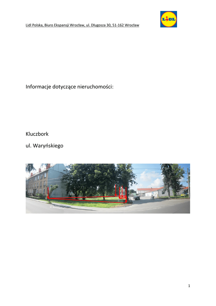 Lidl Polska, Biuro Ekspansji Wrocław, ul. Długosza 30, 51-162 Wrocław Informacje dotyczące nieruchomości: Kluczbork ul. Waryńskiego 1 Lidl Polska, Biuro Ekspansji Wrocław, ul. Długosza 30, 51-162 Wrocław Adres nieruchomości: Kluczbork ul. Waryńskiego 19 woj. opolskie Rodzaj nieruchomości: gruntowa Rodzaj transakcji: sprzedaż Rodzaj własności: użytkowanie wieczyste Powierzchnia: ok. 1.500 m2 Przeznaczenie w m.p.z.p: tereny zabudowy mieszkaniowej wielorodzinnej z usługami Cena: do uzgodnienia 2 Lidl Polska, Biuro Ekspansji Wrocław, ul. Długosza 30, 51-162 Wrocław Opis lokalizacji: Nieruchomość położona w Kluczborku (25 tys. mieszkańców), w sąsiedztwie osiedli wielorodzinnych oraz Rynku Położenie niedaleko drogi krajowej nr 42 (ul. Byczyńska) W bezpośrednim sąsiedztwie nieruchomości znajduje się sklep Lidl Opis nieruchomości: Oznaczenie geodezyjne nieruchomości: część działki nr 184/6, AM 5, obręb 0027 Kluczbork Działka w użytkowaniu wieczystym do 22.02.2095 r. Nieruchomość niezabudowana Obsługa nieruchomości odbywać się poprzez istniejące wjazdy Lidl na zasadzie służebności Media na działce lub w jej bezpośrednim sąsiedztwie Na przedmiotowej działce obowiązuje miejscowy plan zagospodarowania przestrzennego miasta Kluczborka uchwalonego przez Radę Miejską w Kluczborku uchwałą nr XXVII/348/08 z dnia 30 września 2008 r oraz uchwała nr L/657/10 Rady Miejskiej w Kluczborku z dnia 26 maja 2010 r. zmieniająca uchwałę nr XXVII/348/08 w sprawie zmiany miejscowego planu zagospodarowania przestrzennego miasta Kluczborka oraz wsi Ligota Dolna, Ligota Górna, i Ligota Zamecka w zakresie Kluczborka – części północnej. Zgodnie z zapisami m.p.z.p., działka nr 184/6 znajdują się na terenie oznaczonym na rysunku planu 5 MWU – tereny zabudowy mieszkaniowej wielorodzinnej z usługami. 3 Lidl Polska, Biuro Ekspansji Wrocław, ul. Długosza 30, 51-162 Wrocław Położenie nieruchomości na mapie miasta 4 Lidl Polska, Biuro Ekspansji Wrocław, ul. Długosza 30, 51-162 Wrocław Mapa zasadnicza 5 Lidl Polska, Biuro Ekspansji Wrocław, ul. Długosza 30, 51-162 Wrocław Wyrys z planu miejscowego 6 Lidl Polska, Biuro Ekspansji Wrocław, ul. Długosza 30, 51-162 Wrocław Osoba kontaktowa: Tomasz Kopacz Lidl Polska Sp. z o.o. Biuro Ekspansji Wrocław ul. J. Długosza 30 51-162 Wrocław Tel. 71/324 60 11 e-mail: [email protected] 7