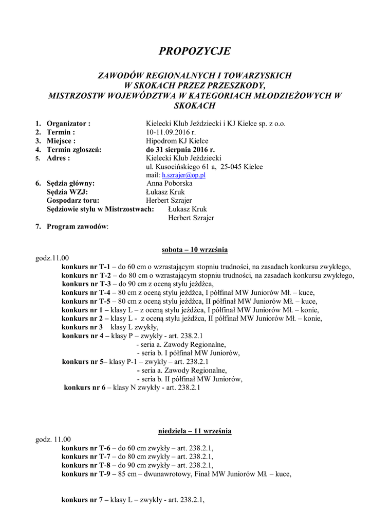 PROPOZYCJE ZAWODÓW REGIONALNYCH I TOWARZYSKICH W SKOKACH PRZEZ PRZESZKODY, MISTRZOSTW WOJEWÓDZTWA W KATEGORIACH MŁODZIEŻOWYCH W SKOKACH 1. 2. 3. 4. Organizator : Termin : Miejsce : Termin zgłoszeń: 5. Adres : Kielecki Klub Jeździecki i KJ Kielce sp. z o.o. 10-11.09.2016 r. Hipodrom KJ Kielce do 31 sierpnia 2016 r. Kielecki Klub Jeździecki ul. Kusocińskiego 61 a, 25-045 Kielce mail: [email protected] 6. Sędzia główny: Anna Poborska Sędzia WZJ: Łukasz Kruk Gospodarz toru: Herbert Szrajer Sędziowie stylu w Mistrzostwach: Łukasz Kruk Herbert Szrajer 7. Program zawodów: sobota – 10 września godz.11.00 konkurs nr T-1 – do 60 cm o wzrastającym stopniu trudności, na zasadach konkursu zwykłego, konkurs nr T-2 – do 80 cm o wzrastającym stopniu trudności, na zasadach konkursu zwykłego, konkurs nr T-3 – do 90 cm z oceną stylu jeźdźca, konkurs nr T-4 – 80 cm z oceną stylu jeźdźca, I półfinał MW Juniorów Mł. – kuce, konkurs nr T-5 – 80 cm z oceną stylu jeźdźca, II półfinał MW Juniorów Mł. – kuce, konkurs nr 1 – klasy L – z oceną stylu jeźdźca, I półfinał MW Juniorów Mł. – konie, konkurs nr 2 – klasy L - z oceną stylu jeźdźca, II półfinał MW Juniorów Mł. – konie, konkurs nr 3 klasy L zwykły, konkurs nr 4 – klasy P – zwykły - art. 238.2.1 - seria a. Zawody Regionalne, - seria b. I półfinał MW Juniorów, konkurs nr 5– klasy P-1 – zwykły – art. 238.2.1 - seria a. Zawody Regionalne, - seria b. II półfinał MW Juniorów, konkurs nr 6 – klasy N zwykły - art. 238.2.1 niedziela – 11 września godz. 11.00 konkurs nr T-6 – do 60 cm zwykły – art. 238.2.1, konkurs nr T-7 – do 80 cm zwykły – art. 238.2.1, konkurs nr T-8 – do 90 cm zwykły – art. 238.2.1, konkurs nr T-9 – 85 cm – dwunawrotowy, Finał MW Juniorów Mł. – kuce, konkurs nr 7 – klasy L – zwykły - art. 238.2.1, konkurs nr 8 – klasy P – zwykły - art. 238.2.1, konkurs nr 9 – klasy L1 – dwunawrotowy, Finał MW Juniorów Mł. – konie, konkurs nr 10 – klasy N – zwykły – art. 238.2.1, konkurs nr 11 – klasy N – dwunawrotowy, Finał MW Juniorów, 8. Warunki techniczne : - parcours – piasek kwarcowy z włókniną o wymiarach 60 x 60 - rozprężalnia – piasek kwarcowy z włókniną o wymiarach 40 x 60 Sprawy organizacyjne i regulaminowe: 9. Mistrzostwa Województwa rozgrywane są zgodnie z regulaminem Finałów OOM i Mistrzostw Polski w skokach. Wysokość przeszkód mniejsza od 10 do 20 cm. Dokumenty jeźdźców i koni zgodnie z regulaminem i przepisami PZJ. W Mistrzostwach Juniorów Mł. na kucach wymagane dokumenty to: badanie sportowo-lekarskie, ubezpieczenie NW i zgoda rodziców. 10. Opłaty za udział w zawodach: - organizacyjna: 150 PLN od konia /90 zł za 1dzień, Mistrzostwa Województwa 200 zł od konia - boks w stajniach : 150 PLN za zawody - Wpłaty za boksy do 31 sierpnia na konto KKJ nr 90 2030 0045 1110 0000 0267 9080 (nie zapewniamy boksów nieopłaconych w terminie) - przyłączenie koniowozu do prądu – 50 PLN za okres zawodów. Na zgłoszeniu proszę zaznaczyć, że będziecie Państwo korzystać z przyłącza prądu. 11. Nagrody – w konkursach towarzyskich i w Mistrzostwach nagrody rzeczowe. Nagrody finansowe: Nr konkursu I miejsce II miejsce IIImiejsce 3, 7 200 100 50 4, 8 250 150 100 6, 10 300 200 150 Nagrody finansowe wypłacane będą zgodnie z poniższymi zasadami: Minimum 3 konie w konkursie: nagroda za I miejsce Od 5 do 8 koni w konkursie : nagroda za I i II miejsce Od 9 koni w konkursie: nagroda za I, II i III miejsce 12. 13. 14. 15. 16. 17. 18. 19. 20. 21. Reklamacje: - wyłącznie na piśmie z dołączeniem kaucji 200 PLN Każda zmiana na liście startowej po jej wywieszeniu – za zgodą Sędziego Głównego i opłatą 20 PLN. Stajnie przygotowane od dnia 9 września od godz. 15.00 Organizator zapewnia pierwszą ściółkę. Na terenie ośrodka istnieje możliwość nabycia słomy – 1 kostka - 15 PLN, siana – 1 kostka - 15 PLN. Wstęp do stajni: szefowie ekip, trenerzy, zawodnicy, luzacy, właściciele koni Organizator nie ponosi żadnej odpowiedzialności w razie wypadków i zachorowań zawodników, luzaków i koni, jak również w przypadku kradzieży, zniszczeń, pożarów i innych zdarzeń losowych Organizator zastrzega sobie prawo zmiany programu zawodów Wyżywienie w Barze Jeździeckim CZTERY KONIE na terenie ośrodka we własnym zakresie Rezerwacja miejsc noclegowych we własnym zakresie. Sprawy weterynaryjne Szczepienia ochronne przeciwko grypie koni. Obowiązuje następujący schemat szczepień: a. szczepienie podstawowe: pierwsze szczepienie – w dniu rozpoczęcia szczepień drugie szczepienie – nie wcześniej niż 21-go dnia i nie później niż 92 dnia od pierwszego szczepienia. 2 b. szczepienie przypominające: co 6 miesięcy od ostatniego szczepienia (jest dopuszczalny 21 dniowy okres karencji); żadne szczepienie przypominające nie może się odbyć później niż na 7 dni przed przybyciem na zawody. Polski Związek Jeździecki prosi wszystkie osoby zaangażowane w jakikolwiek sposób w sporty konne, o przestrzeganie poniżej przedstawionego kodeksu oraz zasady, że dobro konia jest najważniejsze. Dobro konia musi być zawsze i wszędzie uwzględniane w sportach konnych i nie może być podporządkowane współzawodnictwu sportowemu ani innym celom np. komercyjnym. KODEKS POSTĘPOWANIA Z KONIEM I. Na wszystkich etapach treningu i przygotowań konia do startu w zawodach, dobro konia musi stać ponad wszelkimi innymi wymaganiami. Dotyczy to stałej opieki, metod treningu, starannego obrządku, kucia i transportu. II. Konie i jeźdźcy muszą być wytrenowani, kompetentni i zdrowi zanim wezmą udział w zawodach. Odnosi się to także do podawania leków i środków medycznych, zabiegów chirurgicznych zagrażających dobru konia lub ciąży klaczy, oraz do przypadków nadużywania pomocy. III. Zawody nie mogą zagrażać dobru konia. Wymaga to zwróce