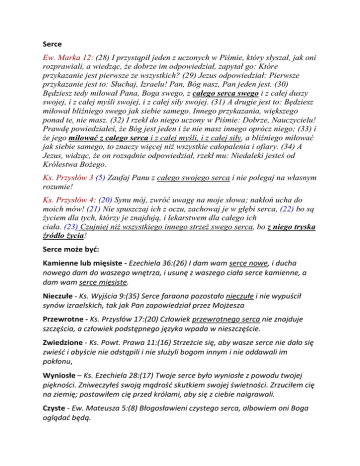 Serce Ew. Marka 12: (28) I przystąpił jeden z uczonych w Piśmie, który słyszał, jak oni rozprawiali, a wiedząc, że dobrze im odpowiedział, zapytał go: Które przykazanie jest pierwsze ze wszystkich? (29) Jezus odpowiedział: Pierwsze przykazanie jest to: Słuchaj, Izraelu! Pan, Bóg nasz, Pan jeden jest. (30) Będziesz tedy miłował Pana, Boga swego, z całego serca swego i z całej duszy swojej, i z całej myśli swojej, i z całej siły swojej. (31) A drugie jest to: Będziesz miłował bliźniego swego jak siebie samego. Innego przykazania, większego ponad te, nie masz. (32) I rzekł do niego uczony w Piśmie: Dobrze, Nauczycielu! Prawdę powiedziałeś, że Bóg jest jeden i że nie masz innego oprócz niego; (33) i że jego miłować z całego serca i z całej myśli, i z całej siły, a bliźniego miłować jak siebie samego, to znaczy więcej niż wszystkie całopalenia i ofiary. (34) A Jezus, widząc, że on rozsądnie odpowiedział, rzekł mu: Niedaleki jesteś od Królestwa Bożego. Ks. Przysłów 3 (5) Zaufaj Panu z całego swojego serca i nie polegaj na własnym rozumie! Ks. Przysłów 4: (20) Synu mój, zwróć uwagę na moje słowa; nakłoń ucha do moich mów! (21) Nie spuszczaj ich z oczu, zachowaj je w głębi serca, (22) bo są życiem dla tych, którzy je znajdują, i lekarstwem dla całego ich ciała. (23) Czujniej niż wszystkiego innego strzeż swego serca, bo z niego tryska źródło życia! Serce może być: Kamienne lub mięsiste - Ezechiela 36:(26) I dam wam serce nowe, i ducha nowego dam do waszego wnętrza, i usunę z waszego ciała serce kamienne, a dam wam serce mięsiste. Nieczułe - Ks. Wyjścia 9:(35) Serce faraona pozostało nieczułe i nie wypuścił synów izraelskich, tak jak Pan zapowiedział przez Mojżesza Przewrotne - Ks. Przysłów 17:(20) Człowiek przewrotnego serca nie znajduje szczęścia, a człowiek podstępnego języka wpada w nieszczęście. Zwiedzione - Ks. Powt. Prawa 11:(16) Strzeżcie się, aby wasze serce nie dało się zwieść i abyście nie odstąpili i nie służyli bogom innym i nie oddawali im pokłonu, Wyniosłe – Ks. Ezechiela 28:(17) Twoje serce było wyniosłe z powodu twojej piękności. Zniweczyłeś swoją mądrość skutkiem swojej świetności. Zrzuciłem cię na ziemię; postawiłem cię przed królami, aby się z ciebie naigrawali. Czyste - Ew. Mateusza 5:(8) Błogosławieni czystego serca, albowiem oni Boga oglądać będą. Pokorne - Ew. Mateusza 11:(29) Weźcie na siebie moje jarzmo i uczcie się ode mnie, że jestem cichy i pokornego serca, a znajdziecie ukojenie dla dusz waszych. Obdarzone mądrością - Ks. Wyjścia 36: (2) I wezwał Mojżesz Besalela i Oholiaba, i wszystkich zręcznych mężów, których serce Pan obdarzył mądrością, wszystkich, których serce poniosło, aby przystąpić do pracy i ją wykonać. stroskane, zranione, przeszyte, zbolałe, a nawet złamane. Może też być pogodne, zadowolone, radosne. Nasze najgłębsze myśli są przechowywane w sercu. Żeby należeć do Boga, trzeba się zaangażować całym sercem, uwierzyć sercem Czym jest serce i kto ma do niego dostęp? Ew. Mateusza 6:(21) Albowiem gdzie jest skarb twój - tam będzie i serce twoje. Ew. Mateusza 15:(19) Z serca bowiem pochodzą złe myśli, zabójstwa, cudzołóstwa, rozpusta, kradzieże, fałszywe świadectwa, bluźnierstwa. Ew. Łukasza 6:(45) Człowiek dobry z dobrego skarbca serca wydobywa dobro, a zły ze złego wydobywa zło; albowiem z obfitości serca mówią usta jego. Serce, uzyskuje głębię bożego spojrzenia na życie, wrażliwość na to, czego nie widzimy, wrażliwość na Boże słowo. Żyć życiem bożym, to patrzeć i słuchać, przeżywać w swoim sercu tak, jak Bóg patrzy, słucha i przeżywa w swoim sercu. Tym, który usiłuje zniszczyć nasze serce jest szatan. Ew. Jana 13:(2) A podczas wieczerzy, gdy diabeł wzbudził w sercu Judasza, syna Szymona Iskarioty, zamysł wydania go, Stale toczy się walka o nasze serce. Dzieje Apost. 5:(3) I rzekł Piotr: Ananiaszu, czym to omotał szatan serce twoje, że okłamałeś Ducha Świętego i zachowałeś dla siebie część pieniędzy za rolę? (4) Czyż póki ją miałeś, nie była twoją, a gdy została sprzedana, czy nie mogłeś rozporządzać pieniędzmi do woli? Cóż cię skłoniło do tego, żeś tę rzecz dopuścił do serca swego? Nie ludziom skłamałeś, lecz Bogu. Pierwszym atakiem na człowieka ze strony Złego jest kłamstwo. Przedstawia on nam nieprawdziwy obraz Boga. Stajemy się nieufni wobec Boga, podejrzliwi, zdystansowani. Szatan okłamuje nas w naszym sercu, usiłuje powiedzieć, że obietnice Boga wobec nas są nieprawdziwe, dobro jest niemożliwe, niemożliwe jest również życie w prawdzie, bycie uczciwym. Sugeruje nam określone pomysły, podsuwa skłonności, albo wrażenia, jakich warto doznać. List do Hebrajczyków 3: (10) Dlatego miałem wstręt do tego pokolenia i powiedziałem: Zawsze ich zwodzi serce; nie poznali też oni dróg moich, (11) tak iż przysiągłem w gniewie moim: Nie wejdą do odpocznienia mego. (12) Baczcie, bracia, żeby nie było czasem w kimś z was złego, niewierzącego serca, które by odpadło od Boga żywego, Żeby chronić serce przed zwiedzeniem, trzeba o nie walczyć. Walka ta polega najpierw na rozpoznaniu tego, kto ma na nie wpływ. O jakiej treści myśli i jakie emocje są dominujące w nim. Trzeba poznać, w jakich sprawach jestem jeszcze więźniem, do czego odnosi się mój brak wolności? Walka polega na tym, aby nie „kupić tego”, co szatan podsuwa, nie utożsamić się z tym, co proponuje. Nie podejmować określonych treści, jakie rodzą się w sercu, jako własnych. Nie utożsamiać się ze złą myślą, złym pragnieniem. Jego pomysłów nie uznać za własne. Szatan wymusza na nas zgodę na coś, na co nie powinniśmy jej wyrażać. Dąży do ugody z nami. Stąd walka powinna polegać na tym, aby nie myśleć tak, jak sugerują myśli, które się we mnie po