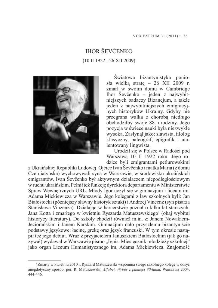 V O X PAT R U M 3 1 ( 2 0 11 ) t . 5 6 IHOR ŠEVČENKO (10 II 1922 - 26 XII 2009) Światowa bizantynistyka poniosła wielką stratę – 26 XII 2009 r. zmarł w swoim domu w Cambridge Ihor Ševčenko – jeden z najwybitniejszych badaczy Bizancjum, a także jeden z najwybitniejszych emigracyjnych historyków Ukrainy. Gdyby nie przegrana walka z chorobą niedługo obchodziłby swoje 88. urodziny. Jego pozycja w świece nauki była niezwykle wysoka. Zasłynął jako: slawista, filolog klasyczny, paleograf, epigrafik i utalentowany lingwista. Urodził się w Polsce w Radości pod Warszawą 10 II 1922 roku. Jego rodzice byli emigrantami petlurowskimi z Ukraińskiej Republiki Ludowej. Ojciec Ivan Ševčenko i matka Maria (z domu Czerniatyńska) wychowywali syna w Warszawie, w środowisku ukraińskich emigrantów. Ivan Ševčenko był aktywnym działaczem niepodległościowym w ruchu ukraińskim. Pełnił też funkcję dyrektora departamentu w Ministerstwie Spraw Wewnętrznych URL. Młody Igor uczył się w gimnazjum i liceum im. Adama Mickiewicza w Warszawie. Jego kolegami z ław szkolnych byli: Jan Białostocki (późniejszy sławny historyk sztuki) i Andrzej Vincenz (syn pisarza Stanisława Vinzenza). Działając w harcerstwie poznał o kilka lat starszych: Jana Kotta i zmarłego w kwietniu Ryszarda Matuszewskiego1 (obaj wybitni historycy literatury). Do szkoły chodził również m.in. z: Janem NowakiemJeziorańskim i Janem Karskim. Gimnazjum dało przyszłemu bizantyniście podstawy językowe: łacinę, grekę oraz język francuski. W tym okresie nastąpił też jego debiut. Wraz z przyjacielem Januszkiem Białostockim (jak go nazywał) wydawał w Warszawie pismo „Ignis. Miesięcznik młodzieży szkolnej” jako organ Liceum Humanistycznego im. Adama Mickiewicza. Znajomość 1 Zmarły w kwietniu 2010 r. Ryszard Matuszewski wspomina swego szkolnego kolegę w dosyć anegdotyczny sposób, por. R. Matuszewski, Alfabet. Wybór z pamięci 90-latka, Warszawa 2004, 444-446. 984 IN MEMORIAM języków okazała tu się przydatna, gdyż na potrzeby tego periodyku przełożył na język polski fragment Wieku Ludwika XIV Woltera2. Nauka w szkole średniej została uwieńczona maturą w tragicznym roku 1939. Okres II wojny światowej Ševčenko spędził na studiach na niemieckim Uniwersytecie Karola (Deutsche Karls-Universität) w Pradze, które uwieńczył doktoratem z filologii klasycznej w 1945 roku. Następnie mając nansenowski paszport wyjechał na Zachód. W 1945 r. zawarł małżeństwo z Oksaną Draj-Chmarą, córką Mychajły Draj-Chmary – wybitnego poligloty i slawisty, który zginął w ZSRR w okresie czystek, najprawdopodobniej w 1939 roku. Kolejnym etapem podróży była Belgia, gdzie spędził czas na studiach filologii klasycznej i bizantynologii na Université Catholique w Louvain; poznał tam wybitnego bizantynistę – Henry’ego Grégoire’a. Szybko stał się jednym z jego uczniów na brukselskim seminarium (1947-1949), prowadzonym w ramach Fundacji Bizantyńskiej; Ševčenko uznał go za swojego intelektualnego mistrza. H. Grégoire cieszył się wówczas ogromnym autorytetem i wywarł wielki wpływ na młodego przyszłego uczonego. Po latach Ševčenko stwierdził, że uczestnictwo w jego seminariach było jednym z najbardziej ekscytujących intelektualnych doświadczeń jego życia. Wdzięczność ta była tym większa, dlatego że on – obywatel bez państwa – bywał gościnnie przyjmowany przez Belga3. Drugi doktorat obronił I. Ševčenko w 1949 r.; został on jednak opublikowany dopiero po wielu latach (La vie intellectuelle et politique à Byzance sous les premiers Paléologues. Études sur la polémique entre Théodore Métochite et Nicéphore Choumnos, Brussels 1962): jest to erudycyjne studium na temat życia, działalności politycznej, twórczości naukowej i literackiej Teodora Metochitesa (1270-1332). Na początku 1950 r. wyjechał do USA, gdzie poznał innego wybitnego mediewistę – urodzonego w Poznaniu Ernsta Kantorowicza, co zaowocowało kolejnym ważnym intelektualnie kontaktem. Pierwszą pracę otrzymał na Uniwersytecie Kalifornijskim w Berkeley, gdzie prowadził wykłady z historii starożytnej i bizantyńskiej; tam również poznał swoją drugą żonę – Margaret (z domu Bentley). Obywatelstwo amerykańskie otrzymał dopiero w 1957 roku. Kolejne lata spędził na stypendium w Waszyngtonie oraz w Cambridge w stanie Massachusetts. W latach 1954-1957 wykładał języki słowiańskie, literaturę i historię bizantyńską na Uniwersytecie w Michigan. W okresie 19571965 r. był profesorem na Columbia University w Nowym Yorku, gdzie wykładał zagadnienia dotyczące stosunków Słowian i Bizancjum. Por. Voltaire, Podbój Flandrii (= Wiek Ludwika XIV, rozdz. 8), tłum. I. S., „Ignis. Miesięcznik młodzieży szkolnej” 1 (1938) nr 2, 29-32. 3 Więcej detali na temat życia I. Ševčenki można znaleźć w rozmowach, jakie przeprowadził z nim Łukasz Jasina na przełomie 2008/2009 r., por. Ukorzeniony kosmopolita. Ihor Szewczenko rozmawia z Łukaszem Jasiną, przypisy, bibliografie i indeks opracował M. Kozłowski, posłowie Ł. Jasina, Lublin 2010, Instytut Europy Środkowo-Wschodniej. 2 IN MEMORIAM 985 W 1960 r. uzyskał stypendium w Dumbarton Oaks w Waszyngtonie: była to już wówczas Mekka dla bizantynistów z całego świata. Od tego czasu rozpoczęła się współpraca naszego naukowca z Uniwersytetem Harvarda. Od 1965 r. spędzał czas przez osiem kolejnych lat w sielankowej okolicy Georgetown, gdzie miał fantastyczne warunki do pracy, mając pod ręką ogromny bizantynologiczny księgozbiór w Dumbarton Oaks. W tym okresie poznał też swojego wieloletniego przyjaciela, również bizantynologa – Cyrila Mango, jak również swoją kolejną żonę – późniejszą profesor sztuki bizantyńskiej Nancy (z domu Patterson). Z czasem I. Ševčenko i C. Mango stali się ikonami tamtejszej społeczności, poznając kolejnych bizantynistów prz
