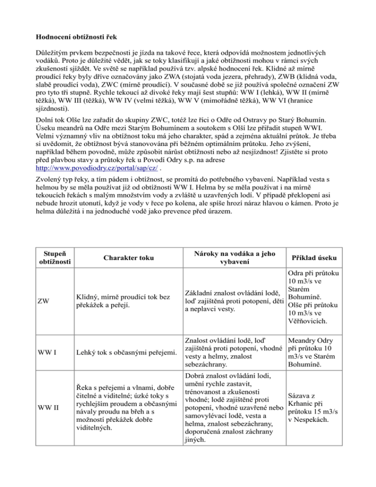 Hodnocení obtížnosti řek Důležitým prvkem bezpečnosti je jízda na takové řece, která odpovídá možnostem jednotlivých vodáků. Proto je důležité vědět, jak se toky klasifikují a jaké obtížnosti mohou v rámci svých zkušeností sjíždět. Ve světě se například používá tzv. alpské hodnocení řek. Klidné až mírně proudící řeky byly dříve označovány jako ZWA (stojatá voda jezera, přehrady), ZWB (klidná voda, slabě proudící voda), ZWC (mírně proudící). V současné době se již používá společné označení ZW pro tyto tři stupně. Rychle tekoucí až divoké řeky mají šest stupňů: WW I (lehká), WW II (mírně těžká), WW III (těžká), WW IV (velmi těžká), WW V (mimořádně těžká), WW VI (hranice sjízdnosti). Dolní tok Olše lze zařadit do skupiny ZWC, totéž lze říci o Odře od Ostravy po Starý Bohumín. Úseku meandrů na Odře mezi Starým Bohumínem a soutokem s Olší lze přiřadit stupeň WWI. Velmi významný vliv na obtížnost toku má jeho charakter, spád a zejména aktuální průtok. Je třeba si uvědomit, že obtížnost bývá stanovována při běžném optimálním průtoku. Jeho zvýšení, například během povodně, může způsobit nárůst obtížnosti nebo až nesjízdnost! Zjistěte si proto před plavbou stavy a průtoky řek u Povodí Odry s.p. na adrese http://www.povodiodry.cz/portal/sap/cz/ . Zvolený typ řeky, a tím pádem i obtížnost, se promítá do potřebného vybavení. Například vesta s helmou by se měla používat již od obtížnosti WW I. Helma by se měla používat i na mírně tekoucích řekách s malým množstvím vody a zvláště u uzavřených lodí. V případě překlopení asi nebude hrozit utonutí, když je vody v řece po kolena, ale spíše hrozí náraz hlavou o kámen. Proto je helma důležitá i na jednoduché vodě jako prevence před úrazem. Stupeň obtížnosti ZW WW I WW II Charakter toku Klidný, mírně proudící tok bez překážek a peřejí. Nároky na vodáka a jeho vybavení Příklad úseku Odra při průtoku 10 m3/s ve Starém Základní znalost ovládání lodě, Bohumíně. loď zajištěná proti potopení, děti Olše při průtoku a neplavci vesty. 10 m3/s ve Věřňovicích. Lehký tok s občasnými peřejemi. Znalost ovládání lodě, loď zajištěná proti potopení, vhodné vesty a helmy, znalost sebezáchrany. Meandry Odry při průtoku 10 m3/s ve Starém Bohumíně. Řeka s peřejemi a vlnami, dobře čitelné a viditelné; úzké toky s rychlejším proudem a občasnými návaly proudu na břeh a s možností překážek dobře viditelných. Dobrá znalost ovládání lodi, umění rychle zastavit, trénovanost a zkušenosti vhodné; lodě zajištěné proti potopení, vhodné uzavřené nebo samovylévací lodě, vesta a helma, znalost sebezáchrany, doporučená znalost záchrany jiných. Sázava z Krhanic při průtoku 15 m3/s v Nespekách. WW III Velmi dobrá znalost ovládání lodě a taktiky jízdy na rychlé a Těžký tok s nepravidelnými vlnami a občasným válcem, divoké vodě, uzavřené lodě někdy zablokované, nečekané nebo rafty, znalost sebezáchrany překážky; u úzkých toků a záchrany jiných, vesta, helma, nepřehledná místa s peřejemi v neopren, záchranné vybavení, je meandrech s náhlými překážkami. možná jízda bez prohlížení celého úseku. Labe od přehrady po Kukačku při průtoku 20 m3/s. WW IV Velmi těžký tok s velkými peřejemi, válce, silná rozhraní, návaly vody, zablokované s úzkými průjezdy a stupni dtto. WW III, velmi dobré znalosti záchrany, psychická odolnost a trénovanost, rychlá rozhodnutí, úsek předem prohlédnout. dtto. WW III, velmi dobré znalosti záchrany, psychická odolnost a trénovanost, rychlá rozhodnutí, úsek předem prohlédnout. Kamenice z Plavů do Návarova při průtoku 10 m3/s. WW V Extrémně těžký tok, velmi zablokované a nepřehledné, neustálé peřeje s málo místy na zastavení, vysoké kaskády a stupně, rychlý proud. Velmi rychlá rozhodnutí pod psychickým tlakem, velká zkušenost, velmi dobře sehrané skupinky s praxí v záchraně a velmi dobrým vybavením. Jizera z Mýta při průtoku nad 40 m3/s v Jablonci. WW VI Hranice sjízdnosti, kdy tok může být sjízdný v kombinaci s vhodným stavem vody a dalšími podmínkami. dtto. WW V Vydra za velké vody Stupně WW II až WW VI uvést jen při nadbytku místa. Ocena trudności rzek WaŜnym elementem bezpieczęństwa Ŝeglugi jest pływanie na takiej rzece, która odpowiada zdolnościom poszczególnych wodniaków. Niedocenienie wiedzy przez poszczególne osoby lub całą grupę w nieodpowiednim terenie jest zasadniczym naruszeniem zasad bezpieczeństwa. Ze względu na to, waŜne jest posiadanie wiedzy, jak są poszczególne cieki zakwalifikowane i jakie stopnie trudności mogą w ramach swych umiejętności spływać. W świecie się np. uŜywa tzw. alpejska kwalifikacja rzek. Spokojne i lekko bystre rzeki były wcześniej oznaczane znakiem ZWA (woda spokojna, jeziora, zapory), ZWB (woda spokojna, lekko bystra), ZWC (lekko bystra). W obecnej chwili juŜ uŜywa się wspólne oznaczenie ZW dla tych trzech stopni. Szabko płynące aŜ bystre rzeki są zakwalifikowanie do 6 stopni: WW I (lekka), WW II (lekko trudna), WW III (trudna), WW IV (bardzo trudna), WW V (nadzwyczajnie trudna), WW VI (granica moŜliwości spływów). Dolny odcinek rzeki Olzy moŜna zaszeregować do kategorii ZWC, to samo moŜna powiedzieć o Odrze od Ostrawy po Stary Bogumin. Odcinek meandrów na Odrze pomiędzy Starym Boguminem i spływem z Olzą moŜna zaszeregować do kategorii WWI. Bardzo duŜe znaczenie na określenie trudności cieku ma jego charakter, spadistość oraz zwlaszcza aktualny przeplyw. Nalezy sobie uświadomić, ze stopień trudności bywa określany przy optymalnym przepływie. Jego podwyzszenie, naprzyklad podczas powodzi, moŜe spowodować pows