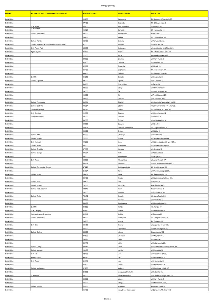 landing page sklepy KOD POCZTOWY MIEJSCOWOŚĆ ULICA i NR Butik I Like 11-200 Bartoszyce Pl. Konstytucji 3-go Maja 25, Butik I Like 97-400 Bełchatów Pl. G.Narutowicza 2, C.H Rywal C.H.Auchan 21-500 Biała Podlaska ul. Brzeska 27, 15-727 Białystok Ul. Hetmańska 16 Galeria Sarni Stok 43-300 Bielsko Biała Sarni Stok 2 23-400 Biłgoraj ul. T. Kościuszki 35, MARKA Butik I Like Butik I Like Butik I Like NAZWA SKLEPU / CENTRUM HANDLOWEGO Butik I Like Butik I Like Galeria Rondo 32-700 Bochnia ul.Partyzantów 2A Butik I Like Galeria Brodnica Rodzinne Centrum Handlowe 87-300 Brodnica ul. Mostowa 2-4 Butik I Like C.H Focus Park 85-097 Bydgoszcz ul. Jagielońska 39-47 lok.1.61, Butik I Like Agora Bytom 41-902 Bytom Pl. T.Kościuszki 1 lok.1.52 Butik I Like 77-100 Bytów Wojska Polskiego 36 B Butik I Like 89-600 Chojnice ul. Stary Rynek 9, Butik I Like 41-500 Chorzów ul. Wolności 22, Butik I Like 32-500 Chrzanów ul. Rynek 13, Butik I Like 06-400 Ciechanów Pl. T. Kościuszki 14, Butik I Like 43-400 Cieszyn ul. Świętego Krzyża 1 Butik I Like C.H M1 41-250 Czeladź ul. Będzińska 80 Butik I Like Galeria Dębicka 39-200 Dębica ul. Ks.Nosala 2, Butik I Like 58-200 Dzierżoniów ul.Rynek 31, Butik I Like 82-300 Elbląg ul. Hetmańska 3m, Butik I Like 19-300 Ełk ul. Armii Krajowej 36, Butik I Like 19-300 Ełk ul.Armii Krajowej 26, Butik I Like 08-400 Garwolin ul. Kościuszki 22 C Butik I Like Galeria Przymorze 80-334 Gdańsk ul. Obrońców Wybrzeża 1 lok.36, Butik I Like Galeria Bałtycka 80-264 Gdańsk Aleja Grunwaldzka 141 Lokal 23, Butik I Like Carrefour Morena 80-172 Gdańsk ul. Schuberta 102 A lok.34 Butik I Like C.H. Dominik 11-500 Giżycko ul. Kętrzyńskiego 12 Butik I Like Galeria Gniezno 62-200 Gniezno ul. Pałucka 2 , Butik I Like 38-300 Gorlice ul. A. Mickiewicza 9, Butik I Like 09-500 Gostynin ul. Rynek 8 Butik I Like 05-825 Grodzisk Mazowiecki ul. 11-go Listopada 2, Butik I Like 05-600 Grójec ul. Krótka 4, Butik I Like Galeria Alfa 86-300 Grudziądz ul. Chełmińska 4 Butik I Like Galeria Hosso 72-300 Gryfice ul. Wojska Polskiego 44, Butik I Like C.H. Jeziorak 14-200 Iława ul. Królowej Jadwigi 6 luk. 1.01 A Butik I Like Galeria Solna 88-100 Inowrocław ul. Wojska Polskiego 16 Butik I Like Galeria Grodzka 37-500 Jarosław ul. Grodzka 19 Butik I Like Galeria Europa 38-204 Jasło ul.Kościuszki 29 58-500 Jelenia Góra ul. Długa 16/17 , 58-506 Jelenia Góra ul. Jana Pawła II 17 40-098 Katowice ul.Plac Wilhelma Szewczyka 1, 47-220 Kędzierzyn Koźle Ul. Armii Krajowej 38 25-004 Kielce ul. Paderewskiego 26/28, 25-406 Kielce Ul. Świętokrzyska 20 44-190 Knurów ul. Kazimierza Wielkiego 20 , Butik I Like Butik I Like C.H. Tesco Butik I Like Butik I Like Galeria Odrzańskie Ogrody Butik I Like Butik I Like Galeria Echo Butik I Like Butik I Like Galeria Euro 62-600 Koło ul.Zielona 5, Butik I Like Galeria Hosso 78-100 Kołobrzeg Plac Ratuszowy 3 Butik I Like Galeria Nad Jeziorem 62-510 Konin Paderewskiego 8 26-200 Końskie ul.Spółdzielcza 8B, 75-452 Koszalin Al.. Jana Pawła II 20 Butik I Like 64-000 Kościan ul. Strzelecka 7, Butik I Like 83-400 Kościerzyna ul. Rzemieślnicza 25 , Butik I Like Butik I Like Galeria Emka Butik I Like C.H M1 31-580 Kraków Al.. Pokoju 67 Butik I Like C.H. Czyżyny 31-870 Kraków ul. Medweckiego 2 Butik I Like Auchan Kraków Bronowice 31-346 Kraków ul Stawowa 61 Butik I Like Galeria Panorama 22-300 Krasnystaw ul. Zakręcie 2 G lok. 19, 23-200 Kraśnik Pl. Wolności 10, 38-400 Krosno ul.Legionów 17 lok/108, 05-120 Legionowo ul. Piłsudskiego 17/19, 84-300 Lębork Staromiejska 17E Butik I Like 34-600 Limanowa ul. Mały Rynek 1, Butik I Like 20-081 Lublin ul. Staszica 1, Butik I Like 20-116 Lublin ul. Lubartowska 25, Butik I Like Butik I Like C.H. Eliot Butik I Like Butik I Like Galeria Delfino Butik I Like Galeria Olimp 20-147 Lublin al. Spółdzielczości Pracy 34 lok. 64 Butik I Like Galeria Veneda 18-400 Łomża ul. Zawadzka 38 Butik I Like C.H. M1 92-103 Łódź ul. Brzezińska 27/29, Butik I Like Pasaż Łódzki 93-570 Łódź ul.Jana Pawła II 30 Butik I Like C.H. Tesco 91-359 Łódź ul. Pojezierska 93 21-400 Łuków ul. Międzyrzecka 8, 82-200 Malbork ul. Kościuszki 14 lok. 15 21-560 Międzyrzec Podlaski ul. Lubelska 15, 05-300 Mińsk Mazowiecki ul. Konstytucji 3-ego Maja 13, Butik I Like 06-500 Mława ul. Stary Rynek 4, Butik I Like 14-300 Morąg ul. Mickiewicza 12 H, 11-700 Mrągowo Brzozowa 16 lok.4 05-100 Nowy Dwór Mazowiecki ul.Bohaterów Modlina 30/2, Butik I Like Butik I Like Galeria Malborska Butik I Like Butik I Like Butik I Like Butik I Like C.H.Olimp Galeria fabryka Strona 13 landing page sklepy Butik I Like 34-400 Nowy Targ ul. Sobieskiego 15, Butik I Like 48-300 Nysa ul. Celna 3/1, Butik I Like Galeria Atrium 32-300 Olkusz Rabsztyńska 2 Butik I Like Galeria Inspiro 26-300 Opoczno ul. M. Kopernika 1 B, Butik I Like Galeria Alius 07-410 Ostrołęka ul. Gorbatowa 11 lok. 10, Butik I Like Galeria Ostrowiec 27-400 Ostrowiec Świętokrzyski ul.Mickiewicza 30 Lok.26 B Butik I Like Galeria Mazurska 14.104 Ostróda Ul.Jana Pawła II 9 Butik I Like Galeria Ostrovia 63-400 Ostrów Wielkopolski Kaliska 120 Butik I Like C.H. Echo 95-200 Pabianice ul. Zamkowa 31, 05-500 Piaseczno ul. Szkolna 13,paw. 33/34 Butik I Like Butik I Like Galeria Kasztanowa 64-920 Piła ul. Powstańców Wielkopolskich 99, Butik I Like C.H Auchan 09-400 Płock ul. Wyszogrodzka 140, Butik I Like Galeria Mosty 09-400 Płock ul. Tysiąclecia 2 Butik I Like Galeria MM 61-805 Poznań Św. Marcin 24 60-737 Poznań ul. Głogowska 54, 61-693 Poznań Aleja Solidarności 47 05-800 Pruszków ul. Kraszewskiego 48, Butik I Like Butik I Like Poznań Pestka Butik I Like Butik I Like C.H. Stokrotka 06-300 Przasnysz ul. Orlika 18, Butik I Like Galeria Sanowa 37-700 Przemyśl ul. W.Brudzewskiego 1 37-200 Przeworsk ul. Kazimierzowska 14, Butik I Like Butik I Like Galeria Zielona 24-100 Puławy Lubelska 2 Butik I Like Galeria Srebrna 47-400 Racibórz ul. Opawska 7, Butik I Like C.H