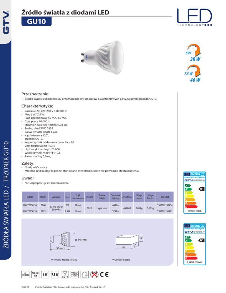 Źródło światła z diodami LED GU10 6W 38 W 7,5 W 46 W Przeznaczenie: • Źródło światła z diodami LED przeznaczone jest do opraw oświetleniowych posiadających gniazdo GU10. • • • • • • • • • • • • • • Zasilanie AC 220-240 V / 50-60 Hz. Moc 6 W/ 7,5 W. Prąd znamionowy 52 mA/ 65 mA. Czas pracy 40 000 h. Strumień świetlny 440 lm/ 570 lm. Rodzaj diod SMD 2835. Barwa światła ciepła biała. Kąt świecenia 120°. Trzonek GU10. Współczynnik oddawania barw Ra ≥ 80. Czas nagrzewania <0,1s. Liczba cykli wł./wył.: 20 000. Współczynnik mocy PF > 0,5. Zawartość Hg 0,0 mg. Zalety: • Niski pobór mocy. • Mleczna szybka daje łagodne, stonowane oświetlenie, które nie powoduje efektu olśnienia. Uwagi: LD-PC6010-30 • Nie współpracuje ze ściemniaczem. Indeks Model LD-PC6010-30 PC60 LD-PC7510-30 PC75 Prąd Moc znamionowy Trzonek Zasilanie AC 220-240 V/ 50-60 Hz 6W 52 mA 7,5 W 65 mA GU10 Barwa światła ciepła biała Strumień Żywotność świetlny 440 lm 570 lm 40 000 h Waga netto Waga brutto 0,05 kg 0,06 kg Kod EAN 5901867155436 5901867155405 6 kWh / 1000 h LD-PC7510-30 50 ŹRÓDŁA ŚWIATŁA LED / TRZONEK GU10 Charakterystyka: 50 mm 63 56 mm Wymiary źródła światła AC 220-240 V 2.04.02 50-60 Hz 6 W 7,5 W 120˚ Źródła Światła LED / Zamienniki żarówek G4, G9 / Trzonek GU10 Wymiary blistra 50 7,5 kWh / 1000 h