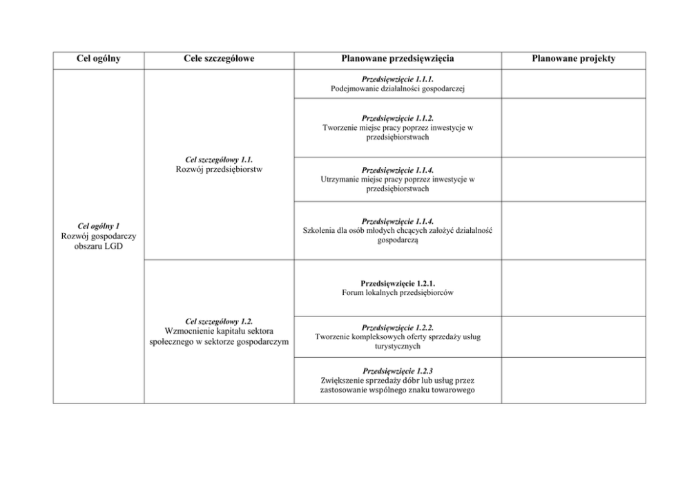 Cel ogólny Cele szczegółowe Planowane przedsięwzięcia Przedsięwzięcie 1.1.1. Podejmowanie działalności gospodarczej Przedsięwzięcie 1.1.2. Tworzenie miejsc pracy poprzez inwestycje w przedsiębiorstwach Cel szczegółowy 1.1. Rozwój przedsiębiorstw Przedsięwzięcie 1.1.4. Utrzymanie miejsc pracy poprzez inwestycje w przedsiębiorstwach Przedsięwzięcie 1.1.4. Szkolenia dla osób młodych chcących założyć działalność gospodarczą Cel ogólny 1 Rozwój gospodarczy obszaru LGD Przedsięwzięcie 1.2.1. Forum lokalnych przedsiębiorców Cel szczegółowy 1.2. Wzmocnienie kapitału sektora społecznego w sektorze gospodarczym Przedsięwzięcie 1.2.2. Tworzenie kompleksowych oferty sprzedaży usług turystycznych Przedsięwzięcie 1.2.3 Zwiększenie sprzedaży dóbr lub usług przez zastosowanie wspólnego znaku towarowego Planowane projekty Cel ogólny Cele szczegółowe Planowane przedsięwzięcia Przedsięwzięcie 1.1.1. Budowa/ przebudowa ogólnodostępnej i niekomercyjnej infrastruktury turystycznej lub rekreacyjnej Cel szczegółowy 2.1. Tworzenie atrakcyjnych form spędzania czasu wolnego Przedsięwzięcie 2.1.2. Tworzenie ścieżek rowerowych Przedsięwzięcie 2.1.3. Nordic walking Przedsięwzięcie 2.1.4. Cel ogólny 2 Wzrost atrakcyjności obszaru LGD Tworzenie oferty kulturalnej zmierzającej do zachowania dziedzictwa lokalnego Przedsięwzięcie 2.2.1. Cel szczegółowy 2.2. Promocja obszaru LGD oraz produktów lub usług z obszaru LGD Stworzenie nowych imprez cyklicznych promujących obszar LGD Przedsięwzięcie 2.2.2. Tworzenie nowych narzędzi promocji obszaru LGD Cel szczegółowy 2.3. Tworzenie nowych mechanizmów współpracy pomiędzy sektorem publicznym i społecznym na obszarze LGD Przedsięwzięcie 2.3.1. Forum NGO z obszaru LGD Planowane projekty Cel ogólny Cele szczegółowe Planowane przedsięwzięcia Przedsięwzięcie 3.1.1. Cel ogólny 3 Wsparcie innowacyjności na obszarze LGD poprzez zwiększanie kompetencji młodych ludzi Cel szczegółowy 3.1. Wyposażenie młodych ludzi w nowe kompetencje Lokalna sieć innowacji Przedsięwzięcie 3.1.2. Przedsiębiorczość dla gimnazjalistów Cel szczegółowy 3.2. Integracja mieszkańców obszaru LGD poprzez zastosowanie innowacji społecznych Przedsięwzięcie 3.2.1. Stworzenie nowych imprez cyklicznych promujących obszar LGD Planowane projekty