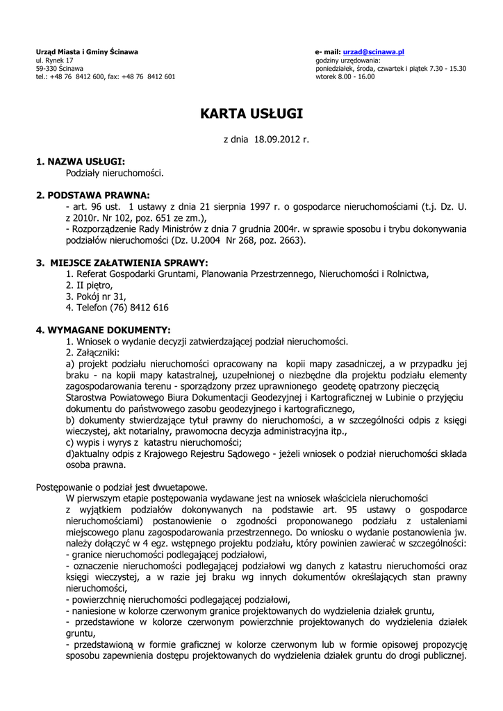 Urząd Miasta i Gminy Ścinawa ul. Rynek 17 59-330 Ścinawa tel.: +48 76 8412 600, fax: +48 76 8412 601 e- mail: [email protected] godziny urzędowania: poniedziałek, środa, czwartek i piątek 7.30 - 15.30 wtorek 8.00 - 16.00 KARTA USŁUGI z dnia 18.09.2012 r. 1. NAZWA USŁUGI: Podziały nieruchomości. 2. PODSTAWA PRAWNA: - art. 96 ust. 1 ustawy z dnia 21 sierpnia 1997 r. o gospodarce nieruchomościami (t.j. Dz. U. z 2010r. Nr 102, poz. 651 ze zm.), - Rozporządzenie Rady Ministrów z dnia 7 grudnia 2004r. w sprawie sposobu i trybu dokonywania podziałów nieruchomości (Dz. U.2004 Nr 268, poz. 2663). 3. MIEJSCE ZAŁATWIENIA SPRAWY: 1. Referat Gospodarki Gruntami, Planowania Przestrzennego, Nieruchomości i Rolnictwa, 2. II piętro, 3. Pokój nr 31, 4. Telefon (76) 8412 616 4. WYMAGANE DOKUMENTY: 1. Wniosek o wydanie decyzji zatwierdzającej podział nieruchomości. 2. Załączniki: a) projekt podziału nieruchomości opracowany na kopii mapy zasadniczej, a w przypadku jej braku - na kopii mapy katastralnej, uzupełnionej o niezbędne dla projektu podziału elementy zagospodarowania terenu - sporządzony przez uprawnionego geodetę opatrzony pieczęcią Starostwa Powiatowego Biura Dokumentacji Geodezyjnej i Kartograficznej w Lubinie o przyjęciu dokumentu do państwowego zasobu geodezyjnego i kartograficznego, b) dokumenty stwierdzające tytuł prawny do nieruchomości, a w szczególności odpis z księgi wieczystej, akt notarialny, prawomocna decyzja administracyjna itp., c) wypis i wyrys z katastru nieruchomości; d)aktualny odpis z Krajowego Rejestru Sądowego - jeżeli wniosek o podział nieruchomości składa osoba prawna. Postępowanie o podział jest dwuetapowe. W pierwszym etapie postępowania wydawane jest na wniosek właściciela nieruchomości z wyjątkiem podziałów dokonywanych na podstawie art. 95 ustawy o gospodarce nieruchomościami) postanowienie o zgodności proponowanego podziału z ustaleniami miejscowego planu zagospodarowania przestrzennego. Do wniosku o wydanie postanowienia jw. należy dołączyć w 4 egz. wstępnego projektu podziału, który powinien zawierać w szczególności: - granice nieruchomości podlegającej podziałowi, - oznaczenie nieruchomości podlegającej podziałowi wg danych z katastru nieruchomości oraz księgi wieczystej, a w razie jej braku wg innych dokumentów określających stan prawny nieruchomości, - powierzchnię nieruchomości podlegającej podziałowi, - naniesione w kolorze czerwonym granice projektowanych do wydzielenia działek gruntu, - przedstawione w kolorze czerwonym powierzchnie projektowanych do wydzielenia działek gruntu, - przedstawioną w formie graficznej w kolorze czerwonym lub w formie opisowej propozycję sposobu zapewnienia dostępu projektowanych do wydzielenia działek gruntu do drogi publicznej. Gdy postanowienie o zgodności proponowanego podziału z ustaleniami mpzp jest pozytywne, wnioskodawca winien przedłożyć Burmistrzowi Ścinawy wniosek o podział nieruchomości wraz z dokumentacją geodezyjną obejmującą: - postanowienie o zgodności proponowanego podziału z ustaleniami mpzp (do wglądu), - protokół z przyjęcia granic nieruchomości, - wykaz synchronizacyjny, jeżeli oznaczenie działek gruntu w katastrze nieruchomości jest inne niż w księdze wieczystej, - mapę z projektem podziału nieruchomości, sporządzoną przez uprawnionego geodetę, opatrzoną pieczęcią Starostwa Powiatowego Biuro Dokumentacji Geodezyjnej i Kartograficznej w Lubinie o przyjęciu dokumentu do państwowego zasobu geodezyjnego i kartograficznego. 5. MIEJSCE ZŁOŻENIA WNIOSKU: - Punkt Obsługi Mieszkańca - parter, - Sekretariat Urzędu Miasta i Gminy - I Piętro, pokój nr 21 6. OPŁATY: Nie podlega opłacie skarbowej. 7. CZAS ZAŁATWIENIA SPRAWY: Do 60 dni. 8. UWAGI: 1. Podział dokonuje się na wniosek i koszt osoby, która ma w tym interes prawny. 2. Wniosek powinien być podpisany przez osoby upoważnione do składania oświadczenia woli w imieniu i na rzecz osoby prawnej (wyciąg z właściwego rejestru na poświadczanie osób upoważnionych). 9. TRYB ODWOŁAWCZY: Na postanowienie o zgodności proponowanego podziału z ustaleniami miejscowego planu zagospodarowania przestrzennego, służy w terminie 7 dni od dnia jego doręczenia, zażalenie do Samorządowego Kolegium Odwoławczego w Legnicy. Od decyzji w sprawie podziału nieruchomości służy, za pośrednictwem Burmistrza Ścinawy, odwołanie do Samorządowego Kolegium Odwoławczego w Legnicy w terminie 14 dni od dnia doręczenia decyzji. Na wydawane w toku postępowania administracyjnego postanowienia, służy, w terminie 7 dni od dnia ich doręczenia, zażalenie do Samorządowego Kolegium Odwoławczego w Legnicy. Metryczka: Opracował: Aniela Kohden - Inspektor ds. Działalności gospodarczej i pozyskiwania środków unijnych; Sprawdził: Wiesława Kalinowska – Kierownik Referatu Gospodarki Gruntami, Planowania Przestrzennego, Nieruchomości i Rolnictwa; Zatwierdził: Patrycja Jugo - Sekretarz Miasta i Gminy; Dane Wnioskodawcy: Nazwisko i Imię / Jednostka:……………………………………………………………………………………………………………………….. Adres:……………………………………………………………………………………………………………………………………………………….. Nr PESEL/REGON:………………………………………………………………………………………………………………………………………. Nr telefonu………………………………………………………………………………………………………………………………………………… Burmistrz Ścinawy WNIOSEK O WYDANIE DECYZJI ZATWIERDZAJĄCEJ PODZIAŁ NIERUCHOMOŚCI Wnoszę o wydanie decyzji zatwierdzającej podział nieruchomości położonej w obrębie.............................. oznaczonej numerem geodezyjnym.........