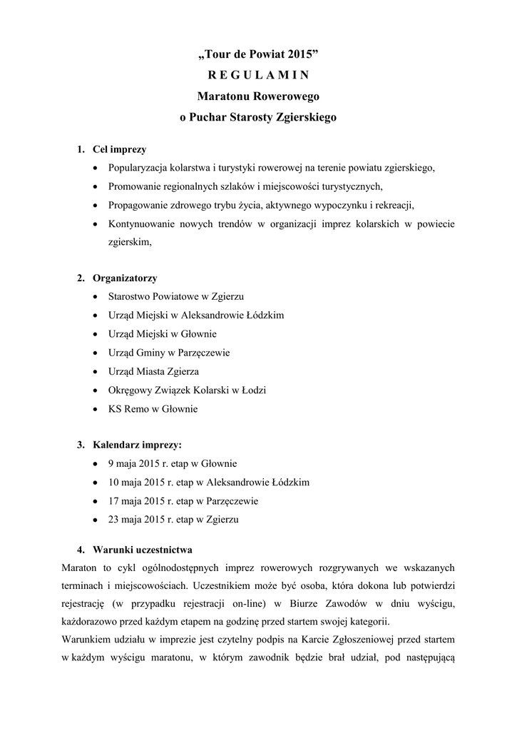 „Tour de Powiat 2015” REGULAMIN Maratonu Rowerowego o Puchar Starosty Zgierskiego 1. Cel imprezy Popularyzacja kolarstwa i turystyki rowerowej na terenie powiatu zgierskiego, Promowanie regionalnych szlaków i miejscowości turystycznych, Propagowanie zdrowego trybu życia, aktywnego wypoczynku i rekreacji, Kontynuowanie nowych trendów w organizacji imprez kolarskich w powiecie zgierskim, 2. Organizatorzy Starostwo Powiatowe w Zgierzu Urząd Miejski w Aleksandrowie Łódzkim Urząd Miejski w Głownie Urząd Gminy w Parzęczewie Urząd Miasta Zgierza Okręgowy Związek Kolarski w Łodzi KS Remo w Głownie 3. Kalendarz imprezy: 9 maja 2015 r. etap w Głownie 10 maja 2015 r. etap w Aleksandrowie Łódzkim 17 maja 2015 r. etap w Parzęczewie 23 maja 2015 r. etap w Zgierzu 4. Warunki uczestnictwa Maraton to cykl ogólnodostępnych imprez rowerowych rozgrywanych we wskazanych terminach i miejscowościach. Uczestnikiem może być osoba, która dokona lub potwierdzi rejestrację (w przypadku rejestracji on-line) w Biurze Zawodów w dniu wyścigu, każdorazowo przed każdym etapem na godzinę przed startem swojej kategorii. Warunkiem udziału w imprezie jest czytelny podpis na Karcie Zgłoszeniowej przed startem w każdym wyścigu maratonu, w którym zawodnik będzie brał udział, pod następującą klauzulą: „Organizator, wszystkie osoby z nim współpracujące, a także osoby związane z przeprowadzeniem i organizacją wyścigu nie ponoszą odpowiedzialności względem uczestników za szkody osobowe, rzeczowe i majątkowe, które wystąpią przed, w trakcie lub po wyścigu. Uczestnicy startują na własną odpowiedzialność. Uczestnicy ponoszą odpowiedzialność cywilną i prawną za wszystkie szkody. Przez akceptację niniejszej deklaracji uczestnicy zrzekają się prawa dochodzenia prawnego lub zwrotnego od organizatora lub jego zleceniobiorców w razie wypadku lub szkody związanej z zawodami. Przyjmuję do wiadomości, że w razie wypadku nie mogę wnosić żadnych roszczeń w stosunku do organizatora. Przyjmuję do wiadomości, że należy przestrzegać zarządzeń służb porządkowych oraz warunków regulaminu i programu zawodów w poszczególnych etapach. Zgadzam się z warunkami uczestnictwa i zgłaszam swoje uczestnictwo w/w. zawodach. W przypadku startu młodzieży poniżej 18 lat wymagana jest zgoda rodzica lub opiekuna prawnego, poprzez złożenie podpisu. Zdjęcia, nagrania filmowe oraz wywiady z moją osobą, a także wyniki z moimi danymi osobowymi mogą być wykorzystane przez prasę, radio i telewizję. Swoim podpisem zapewniam, że zapoznałem się z wszystkimi warunkami regulaminu zawodów i wypełniłem formularz zgłoszeniowy zgodnie z prawdą oraz kompletnie. Wyrażam zgodę na przetwarzanie moich danych osobowych przez Starostwo Powiatowe w Zgierzu zgodnie z ustawą z dnia 29 sierpnia 1997 r. o ochronie danych osobowych (Dz. U. Nr 133, poz. 883). Niniejsza deklaracja obowiązuje na wszystkich edycjach tegorocznego cyklu.” Impreza ma charakter otwarty. Każdy uczestnik startuje na własną odpowiedzialność (w przypadku zawodników niepełnoletnich na odpowiedzialność rodziców lub opiekunów prawnych). Start zawodnika w zawodach jest równoznaczny z wyrażeniem przez niego zgody na stosowanie się do zasad opisanych w niniejszym Regulaminie. Każdy uczestnik maratonu rowerowego jest zobowiązany do jazdy w kasku sztywnym. Do całkowitej rejestracji niezbędne jest stawienie się w biurze zawodów. W przeciwnym wypadku zawodnik nie zostanie umieszczony w klasyfikacji. Numery startowe będą wydawane w biurze zawodów podczas weryfikacji zawodników. Numer startowy przydzielony jest zawodnikowi na cały cykl (Zwrot po ostatnim etapie). Jeżeli zawodnik rezygnuje ze startu należy zwrócić go zakończonym etapie wyścigu. 5. Program zawodów Godziny startów oraz dystanse i mapy tras zostaną zamieszczone w regulaminach poszczególnych etapów. 6. Kategorie wiekowe Podczas maratonu rowerowego obowiązywać będą następujące grupy wiekowe: Grupa A: przedszkolaki chłopcy Grupa A1: przedszkolaki dziewczynki Grupa B: szkoły podstawowe, klasy 1-3, chłopcy Grupa C: szkoły podstawowe, klasy 1-3 dziewczynki Grupa D: szkoły podstawowe, klasy 4-6 chłopcy Grupa E: szkoły podstawowe, klasy 4-6 dziewczynki Grupa F: gimnazjum, chłopcy Grupa G: gimnazjum, dziewczęta Grupa H: szkoły ponadgimnazjalne, chłopcy do 21 lat Grupa I: kobiety OPEN od 16 lat Grupa J: mężczyźni wiek od 22 do 39 lat Grupa K: mężczyźni wiek od 40 do 59 lat Grupa L: mężczyźni masters od 60 lat Grupa Ł: grupa cyklosport: amatorzy na rowerach turystycznych Start do maratonu na poszczególnych dystansach we wszystkich kategoriach wiekowych odbędzie się ze startu wspólnego. Organizator zastrzega sobie prawo do zmiany godziny startu oraz łączenia grup wiekowych podczas startu, o czym poinformuje uczestników w dniu rozgrywania maratonu. Pomiar czasu będzie prowadzony przez sędziów z Okręgowego Związku Kolarskiego w Łodzi z wykorzystaniem technologii cyfrowych (w tym: fotofinisz). Trasa będzie oznakowana i zabezpieczona przez organizatora i odpowiednie służby. Zawodnicy podczas wyścigu zobowiązani są do przestrzegania niniejszego regulaminu oraz odnoszenia się z należytym szacunkiem do sędziów, organizatorów i innych pracowników, nie mogą używać wulgarnych słów ani zachowywać się w sposób niesportowy. Zawodnicy powinni szanować zieleń i nie zanieczyszczać terenu, nie wolno używać szklanych pojemników w pobliżu i na trasie zawodów. 7. Zasady Fair-Play i zachowania zawodników na trasie W czasie zawodów obowiązywać będą następujące zasady fair-play: Wolniejszy zawodnik powinien ustąpić szybszemu na trasie, Zawodnik musi zachować szczególną uwagę, gdy trasa jest trudna technicznie lub zbliża się do szosy lub skrzyżowania, Naprawa roweru powinna być przeprowadzona w obrębie widoczności szlaku, Podczas sprintu finiszowego zawodnik m