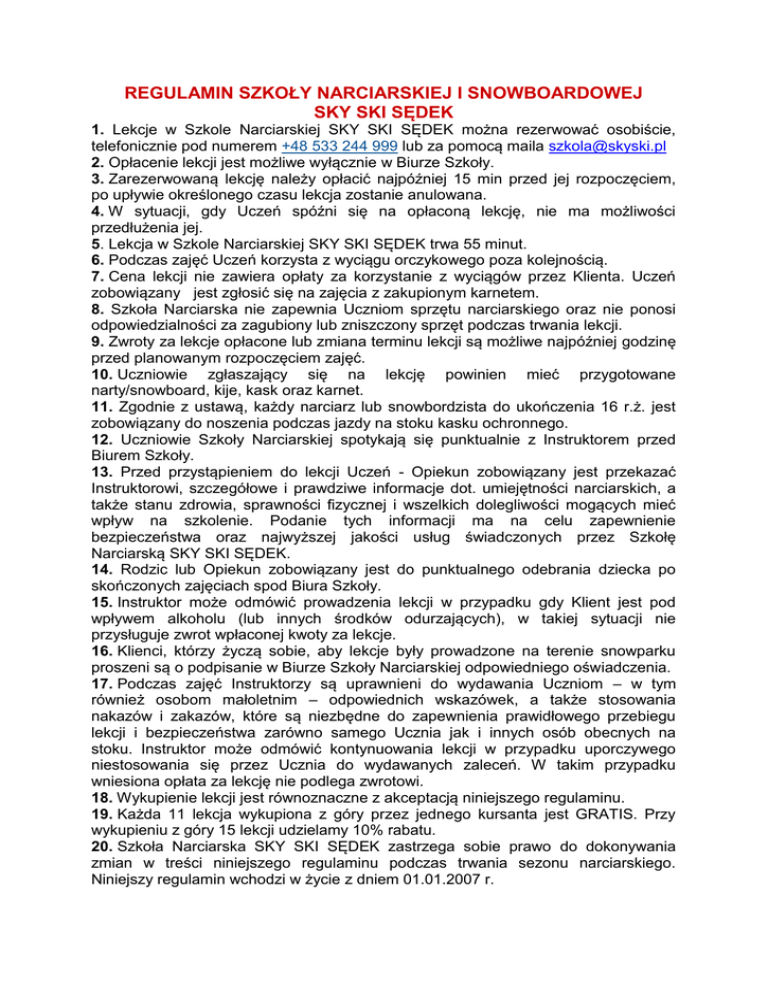 REGULAMIN SZKOŁY NARCIARSKIEJ I SNOWBOARDOWEJ SKY SKI SĘDEK 1. Lekcje w Szkole Narciarskiej SKY SKI SĘDEK można rezerwować osobiście, telefonicznie pod numerem +48 533 244 999 lub za pomocą maila [email protected] 2. Opłacenie lekcji jest możliwe wyłącznie w Biurze Szkoły. 3. Zarezerwowaną lekcję należy opłacić najpóźniej 15 min przed jej rozpoczęciem, po upływie określonego czasu lekcja zostanie anulowana. 4. W sytuacji, gdy Uczeń spóźni się na opłaconą lekcję, nie ma możliwości przedłużenia jej. 5. Lekcja w Szkole Narciarskiej SKY SKI SĘDEK trwa 55 minut. 6. Podczas zajęć Uczeń korzysta z wyciągu orczykowego poza kolejnością. 7. Cena lekcji nie zawiera opłaty za korzystanie z wyciągów przez Klienta. Uczeń zobowiązany jest zgłosić się na zajęcia z zakupionym karnetem. 8. Szkoła Narciarska nie zapewnia Uczniom sprzętu narciarskiego oraz nie ponosi odpowiedzialności za zagubiony lub zniszczony sprzęt podczas trwania lekcji. 9. Zwroty za lekcje opłacone lub zmiana terminu lekcji są możliwe najpóźniej godzinę przed planowanym rozpoczęciem zajęć. 10. Uczniowie zgłaszający się na lekcję powinien mieć przygotowane narty/snowboard, kije, kask oraz karnet. 11. Zgodnie z ustawą, każdy narciarz lub snowbordzista do ukończenia 16 r.ż. jest zobowiązany do noszenia podczas jazdy na stoku kasku ochronnego. 12. Uczniowie Szkoły Narciarskiej spotykają się punktualnie z Instruktorem przed Biurem Szkoły. 13. Przed przystąpieniem do lekcji Uczeń - Opiekun zobowiązany jest przekazać Instruktorowi, szczegółowe i prawdziwe informacje dot. umiejętności narciarskich, a także stanu zdrowia, sprawności fizycznej i wszelkich dolegliwości mogących mieć wpływ na szkolenie. Podanie tych informacji ma na celu zapewnienie bezpieczeństwa oraz najwyższej jakości usług świadczonych przez Szkołę Narciarską SKY SKI SĘDEK. 14. Rodzic lub Opiekun zobowiązany jest do punktualnego odebrania dziecka po skończonych zajęciach spod Biura Szkoły. 15. Instruktor może odmówić prowadzenia lekcji w przypadku gdy Klient jest pod wpływem alkoholu (lub innych środków odurzających), w takiej sytuacji nie przysługuje zwrot wpłaconej kwoty za lekcje. 16. Klienci, którzy życzą sobie, aby lekcje były prowadzone na terenie snowparku proszeni są o podpisanie w Biurze Szkoły Narciarskiej odpowiedniego oświadczenia. 17. Podczas zajęć Instruktorzy są uprawnieni do wydawania Uczniom – w tym również osobom małoletnim – odpowiednich wskazówek, a także stosowania nakazów i zakazów, które są niezbędne do zapewnienia prawidłowego przebiegu lekcji i bezpieczeństwa zarówno samego Ucznia jak i innych osób obecnych na stoku. Instruktor może odmówić kontynuowania lekcji w przypadku uporczywego niestosowania się przez Ucznia do wydawanych zaleceń. W takim przypadku wniesiona opłata za lekcję nie podlega zwrotowi. 18. Wykupienie lekcji jest równoznaczne z akceptacją niniejszego regulaminu. 19. Każda 11 lekcja wykupiona z góry przez jednego kursanta jest GRATIS. Przy wykupieniu z góry 15 lekcji udzielamy 10% rabatu. 20. Szkoła Narciarska SKY SKI SĘDEK zastrzega sobie prawo do dokonywania zmian w treści niniejszego regulaminu podczas trwania sezonu narciarskiego. Niniejszy regulamin wchodzi w życie z dniem 01.01.2007 r.