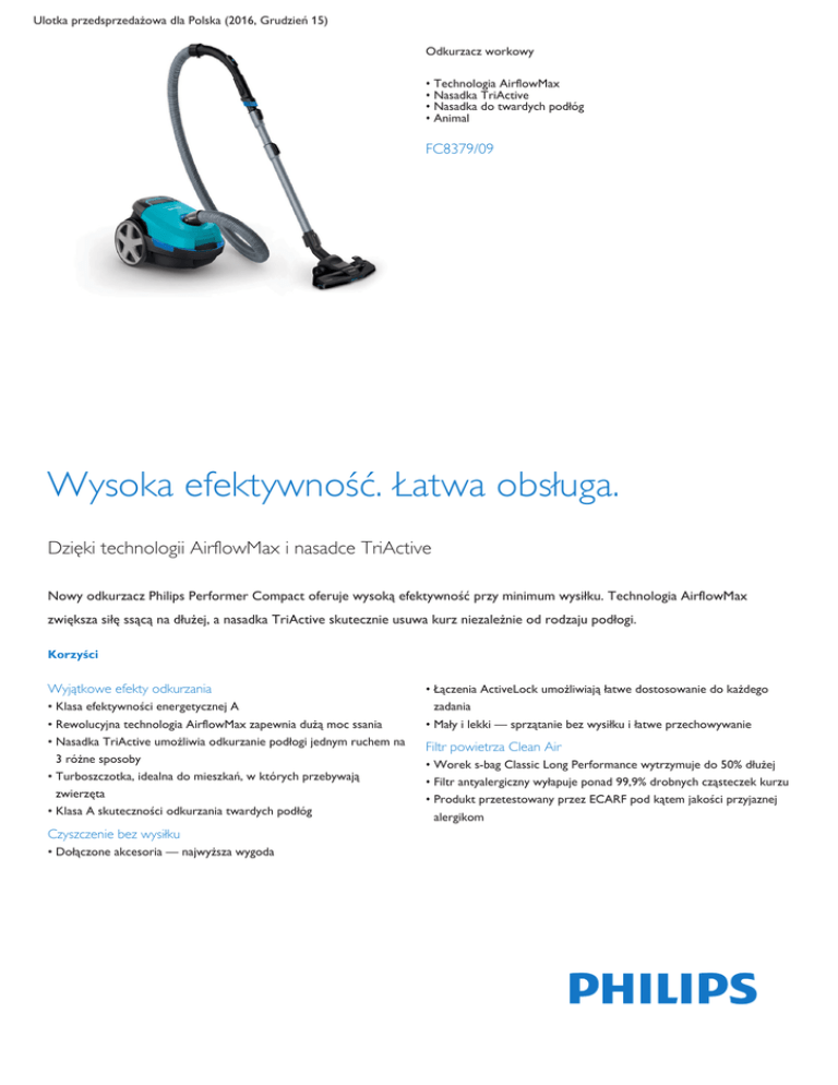 Ulotka przedsprzedażowa dla Polska (2016, Grudzień 15) Odkurzacz workowy • Technologia AirflowMax • Nasadka TriActive • Nasadka do twardych podłóg • Animal FC8379/09 Wysoka efektywność. Łatwa obsługa. Dzięki technologii AirflowMax i nasadce TriActive Nowy odkurzacz Philips Performer Compact oferuje wysoką efektywność przy minimum wysiłku. Technologia AirflowMax zwiększa siłę ssącą na dłużej, a nasadka TriActive skutecznie usuwa kurz niezależnie od rodzaju podłogi. Korzyści Wyjątkowe efekty odkurzania • Klasa efektywności energetycznej A • Rewolucyjna technologia AirflowMax zapewnia dużą moc ssania • Nasadka TriActive umożliwia odkurzanie podłogi jednym ruchem na 3 różne sposoby • Turboszczotka, idealna do mieszkań, w których przebywają zwierzęta • Klasa A skuteczności odkurzania twardych podłóg Czyszczenie bez wysiłku • Dołączone akcesoria — najwyższa wygoda • Łączenia ActiveLock umożliwiają łatwe dostosowanie do każdego zadania • Mały i lekki — sprzątanie bez wysiłku i łatwe przechowywanie Filtr powietrza Clean Air • Worek s-bag Classic Long Performance wytrzymuje do 50% dłużej • Filtr antyalergiczny wyłapuje ponad 99,9% drobnych cząsteczek kurzu • Produkt przetestowany przez ECARF pod kątem jakości przyjaznej alergikom Performer Compact Cechy Klasa efektywności energetycznej A Klasa A odkurzania twardych podłóg Ten odkurzacz został stworzony z myślą o uzyskaniu najwyższej wydajności przy zachowaniu klasy efektywności energetycznej A. Ten produkt osiąga najwyższą klasę skuteczności odkurzania twardych podłóg. Zbiera 100% kurzu! Technologia AirflowMax Dołączone akcesoria Wyjątkowa technologia AirflowMax utrzymuje dużą moc ssania przez dłuższy czas*, co umożliwia wykorzystanie worka do samego końca. Technologia skupia się na optymalizacji trzech kluczowych elementów: 1) Wyjątkowy żebrowany profil wewnątrz komory na kurz maksymalizuje przepływ powietrza w worku na kurz i umożliwia wykorzystanie całej powierzchni worka. 2) Pojemność specjalnie zaprojektowanej komory na kurz umożliwia pełne i równomierne rozłożenie worka. 3) Wysokiej jakości niezatykające się struktury włókien w worku na kurz pochłaniają zabrudzenia bez zatykania porów, co pozwala uniknąć redukcji mocy ssania. Odkurzacz jest wyposażony w zintegrowane akcesoria, więc nie trzeba nosić dodatkowych elementów podczas sprzątania. Szczelinówka jest przechowywana w pojemniku, a miękka szczotka do odkurzania jest wygodnie zintegrowana z uchwytem urządzenia i zawsze gotowa do użytku. Łączenia ActiveLock Nasadka TriActive Łączenia ActiveLock umożliwiają łatwy montaż i demontaż różnych nasadek i akcesoriów do rury teleskopowej podczas sprzątania. Mały i lekki Nasadka TriActive umożliwia odkurzanie podłogi jednym ruchem na 3 różne sposoby: 1) Za pomocą specjalnie zaprojektowanej stopy delikatnie „otwiera” dywan w celu dokładnego usunięcia kurzu. 2) Wsysa duże cząsteczki brudu przez duży otwór z przodu. 3) Zbiera kurz i brud wzdłuż mebli oraz ścian za pomocą kanałów powietrznych po lewej i prawej stronie. Turboszczotka Dzięki niewielkim rozmiarom urządzenie można łatwo przechowywać, oszczędzając cenną przestrzeń. Mała waga ułatwia przenoszenie. s-bag Classic Long Performance Turboszczotka głęboko czyści dywany oraz szybko usuwa z nich włosy i kłaczki kurzu. Obrotowa szczotka znajdująca się wewnątrz usuwa drobiny kurzu i sierść, dzięki czemu podłogi są czystsze. Jest ona wyposażona w kółka, które zapobiegają powstaniu uszkodzeń w przypadku użycia jej na twardej podłodze. Ten nowy syntetyczny worek firmy Philips został opracowany w celu zapewnienia długotrwałej wydajności odkurzacza, tj. wysokiej mocy ssania oraz maksymalnej filtracji — aż do momentu, gdy worek będzie pełny i gotowy do utylizacji. Dane wkrótce ulegną zmianie 2016, Grudzień 15 Performer Compact Filtr antyalergiczny ECARF Stworzony z myślą o zaspokajaniu specyficznych potrzeb alergików, a także innych osób wymagających wyższego poziomu higieny. Ten odkurzacz otrzymał znak jakości Europejskiego Centrum Badań nad Alergiami (ECARF) jako przyjazny osobom cierpiącym na alergie. Powietrze wylotowe jest oczyszczane z 99,9% alergenów pochodzących z sierści psów i kotów, a także z roztoczy i pyłków, tworząc w domu atmosferę przyjazną alergikom. Specyfikacje Prosimy pamiętać, że jest to ulotka przedsprzedażowa. Treść ulotki jest zgodna z naszą najlepszą wiedzą w momencie publikacji i w odniesieniu do danego kraju (podane powyżej). Treść ulotki może ulec zmianie bez powiadomienia. Firma Philips nie ponosi odpowiedzialności za treść ulotki. Wydajność Klasa efektywności energetycznej Roczne zużycie energii Klasa skuteczności odkurzania dywanów Klasa skuteczności odkurzania podłóg twardych Klasa reemisji kurzu Poziom głośności Moc wejściowa (IEC) Podciśnienie (maks.) Akcesoria w zestawie A 27,5 kWh Zrównoważony rozwój Opakowanie Instrukcja obsługi D A Waga produktu Wymiary produktu (D x S x W) A 78 dB 750 W 17,5 kPa Wysokość Szerokość Głębokość Waga netto Waga brutto EAN Liczba produktów w zestawie Kraj pochodzenia Kod towaru według Systemu Zharmonizowanego (HS) Głęboki turkus 3L s-bag Classic Long Performance Filtr antyalergiczny 1-warstwowy filtr piankowy Parametry użytkowe Zasięg działania Długość przewodu Typ rury Łączenie rury Typ kółek Uchwyt do przenoszenia 4,2 kg 400 x 282 x 251 mm Wymiary opakowania Filtracja Pojemność pojemnika na kurz Typ worka na kurz Filtr wylotowy Filtr silnika > 90% materiału z odzysku 100% papier przetworzony Waga i wymiary Wzornictwo Kolor Szczelinówka Zintegrowana szczotka 8m 5m Metalowa, dwuczęściowa rura teleskopowa ActiveLock Gumowe Przód 34,00 cm 29,70 cm 53,00 cm 6,50 kg 7,60 kg 08710103733980 1 CN 850811 Karton zewnętrzny Długość Szerok