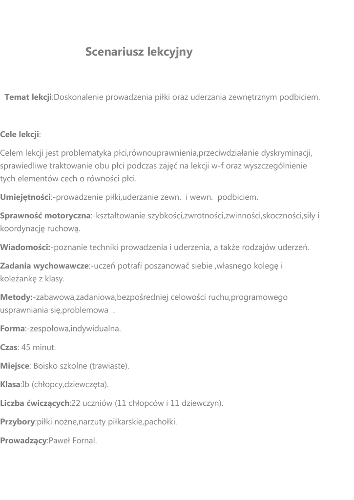 Scenariusz lekcyjny Temat lekcji:Doskonalenie prowadzenia piłki oraz uderzania zewnętrznym podbiciem. Cele lekcji: Celem lekcji jest problematyka płci,równouprawnienia,przeciwdziałanie dyskryminacji, sprawiedliwe traktowanie obu płci podczas zajęć na lekcji w-f oraz wyszczególnienie tych elementów cech o równości płci. Umiejętności:-prowadzenie piłki,uderzanie zewn. i wewn. podbiciem. Sprawność motoryczna:-kształtowanie szybkości,zwrotności,zwinności,skoczności,siły i koordynację ruchową. Wiadomości:-poznanie techniki prowadzenia i uderzenia, a także rodzajów uderzeń. Zadania wychowawcze:-uczeń potrafi poszanować siebie ,własnego kolegę i koleżankę z klasy. Metody:-zabawowa,zadaniowa,bezpośredniej celowości ruchu,programowego usprawniania się,problemowa . Forma:-zespołowa,indywidualna. Czas: 45 minut. Miejsce: Boisko szkolne (trawiaste). Klasa:Ib (chłopcy,dziewczęta). Liczba ćwiczących:22 uczniów (11 chłopców i 11 dziewczyn). Przybory:piłki nożne,narzuty piłkarskie,pachołki. Prowadzący:Paweł Fornal. L.p Tok I. 1.Czynności Zbiórka,raport, Organizacyjno Przywitanie,sprawdzenie -porządkowe obecności i przygotow., do zajęć. Podanie tematu i zadań lekcji. 2.Zabawa ożywiająca 3.Ćwiczenia kształtujące Treść nauczania „Berek-Żuraw”-kto chce uniknąć schwytania,staje na jednej,podkładając pod kolano drugiejrękę,którą równocześnie chwyta się za nos;w tej pozycji jest bezpieczny. Trucht dookoła boiska,przekładanka,skip A i C,w truchcie na sygnał przysiady i wyskoki w górę, marsz przemachy NN raz LN iPN. W dwójkach (chłopiecdziewczynka) ,uczniowie podają sobie NN,na zmianę raz LN raz PN ,noga wyprostowana w st.kolanowym i podskoki o 360 stopniwytrzymać 10 sekund. W tych samych parach uczniowie ustawieni Czas Uwagi Uczniowie ustawieni w szeregu. Wszyscy uczniowie w białych koszulkach i w spodenkach. Dziewczynki powinny posiadać 2min osobną szatnię. Nauczyciel podaje zadania i cele lekcji,tłumaczy, że piłka nożna jest dyscypliną nie tylko dla chłopców,ale dla wszystkich, a przede wszystkim dla dziewczyn i trzeba popularyzować przez jak naczęściej organizowanie zawodów sportowych. Uczniowie ustawieni w rozsypce na połowie boiska.Nauczyciel dokładnie objaśnia zasady i 3min przepisy gry. Uczniowie ustawieni na obwodzie boiska,na zmianę raz chłopiec raz dziewczyna w odstępach po 5 m od siebie. Nauczyciel przygotowuje aparat ruchowy do części 7min głównej,tłumaczy jak bardzo ważna jest tzw.”rozgrzewka,że minimalizuje się kontuzje. Uczniowie ustawieni przodem do siebie . Nauczyciel dokładnie pokazuje i objaśnia ćwiczenia rozgrzewające. Uczniowie ustawieni tyłem do siebie tyłem do siebie podają sobie ręce i wymachy Sprinty 10 metrowe w tych samych parach-3x razy. II. Realizacja tematu lekcji 1.Prowadzenie piłki w Nauczyciel dokładnie omawia i parach (chłopiecobjaśnia jak prawidłowo technicznie dziewczyna) w odległości prowadzić piłkę, tłumaczy że 10 m od siebie,wszystkie elementy techniczne należy ćwiczyć pary ustawione wszerz systematycznie przez cały czas, a boiska. Wykonują po 6min więc cały okres nauki szkolnej. 3xrazy na szerokości Wyjaśnia, że w piłce nożnej liczy się boiska.Miejsce oznaczone nie tylko siła fizyczna, ale również jest pachołkami.Na potrzebna jest dokładność, sygnał nauczyciela para precyzja, cierpliwość, rusza,chłopiec na miejsce zaangażowanie i motywacja. dziewczyny i odwrotnie Objaśnia że piłka jest to gra zespołowa, że każdy uczeń gra o zwycięstwo całego zespołu. 2.Uderzenia wewn. i Wskazuje że rozwija się wszystkie zewn.częścią stopy w cechy motoryczne t.j. szybkość parach naprzeciwko zwinność , skoczność oraz siebie raz LN i PN6min koordynacja ruchowa. 10xrazy Wykazuje że rozwijają się wszystkie partie mięśniowe.Zwraca uwagę na rozwój kondycji fizycznej. Omawia że ważna jest taktyka gry, co wiąże się z myśleniem na boisku, przewidywaniem przeciwnika oraz tzw. „ czytaniem gry ”. 3.Gra szkolna (2x8min.) Tłumaczy że chłopcy jak i 2 dziewczyny 16m dziewczęta powinny być odporne kapitanowie wybierają 2 na stres, że nie zawsze się wygrywa, składy 11 osobowe,na ale czasem trzebaówi uznać przemian raz chłopca raz wyższość przeciwnika. Mówi, że dziewczynę.Jedna dziewczynki są posłuszne i bardziej drużyna zakłada narzuty się starają. Nakazuję że gra w piłkę piłkarskie. jest zarówno dla chłopców jak i dziewcząt, że niemożna III. Uspokojenie organizmu Ćwiczenia porządkowe Czynności porządkowe. Żonglerka piłkami w parach (chłopiecdziewczyna) Ćwiczenia wzmacniające mm.brzucha. Zbiórka, przypomnienie celów lekcji, ocenianie aktywności uczniów. Pożegnanie Uczniowie zbierają przybory i przyrządy. dyskryminować dziewczyn np: przyjęcie piłki na klatkę piersiową itp. Niewolno używać wulgarnych słów w czasie zawodów oraz należy przestrzegać wszsytkich zasad „ fair play”. Każdy uczeń powinien mież predyspozycję do danej dyscypliny sportowej. 3min Nauczyciel tłumaczy, że trzeba dbać o higienę i promocję zdrowia zmieniać obuwie, skarpetki itp. 2min Ustawienie w szeregu. Nauczyciel wyróżnia uczniów najbardziej zaangażowanych w lekcje. Opracował : Paweł Fornal, nauczyciel wychowania fizycznego STUDIA PODYPLOMOWE „Szkoła ze znakiem jakości ”. Kierunek : Zarządzanie Oświatą – semestr III